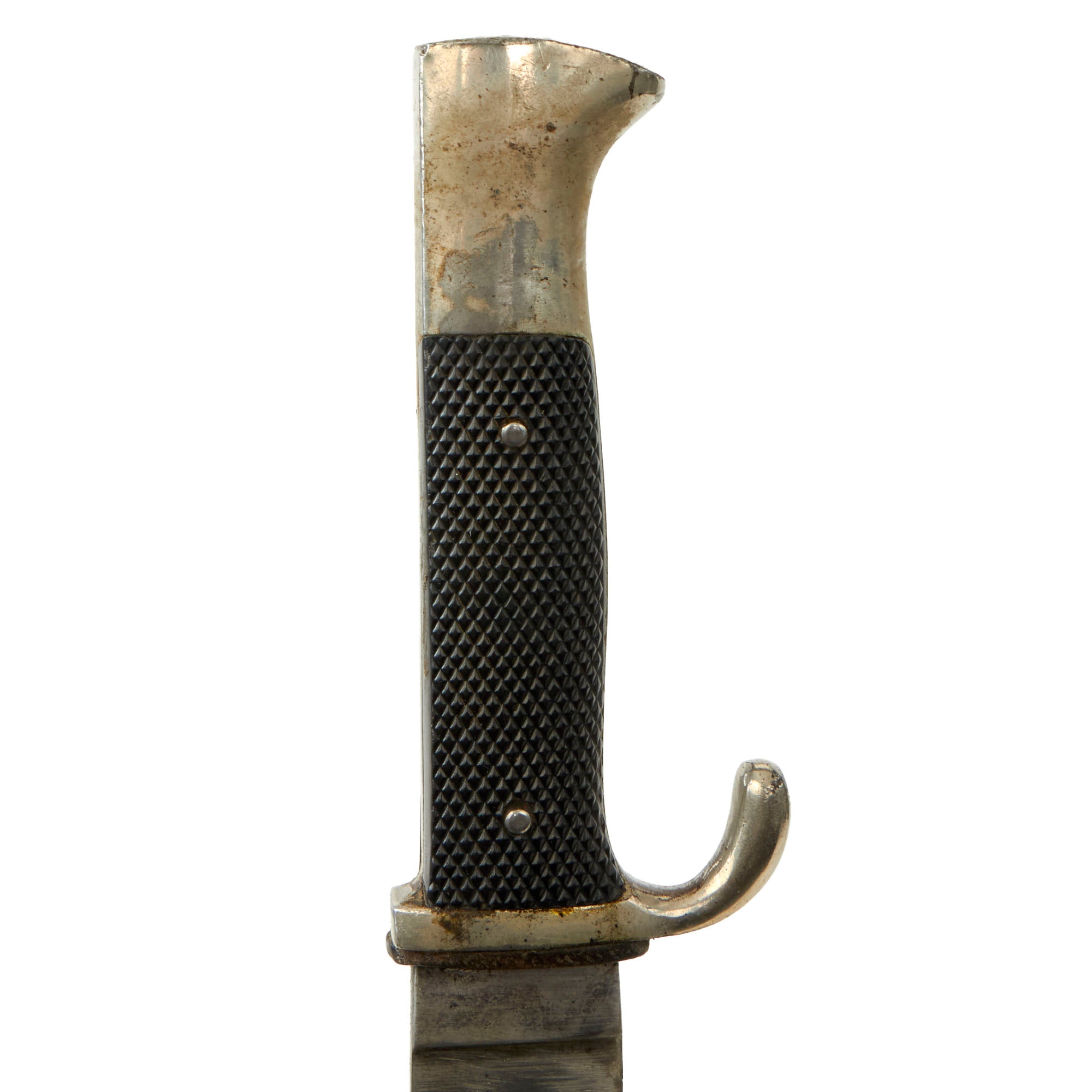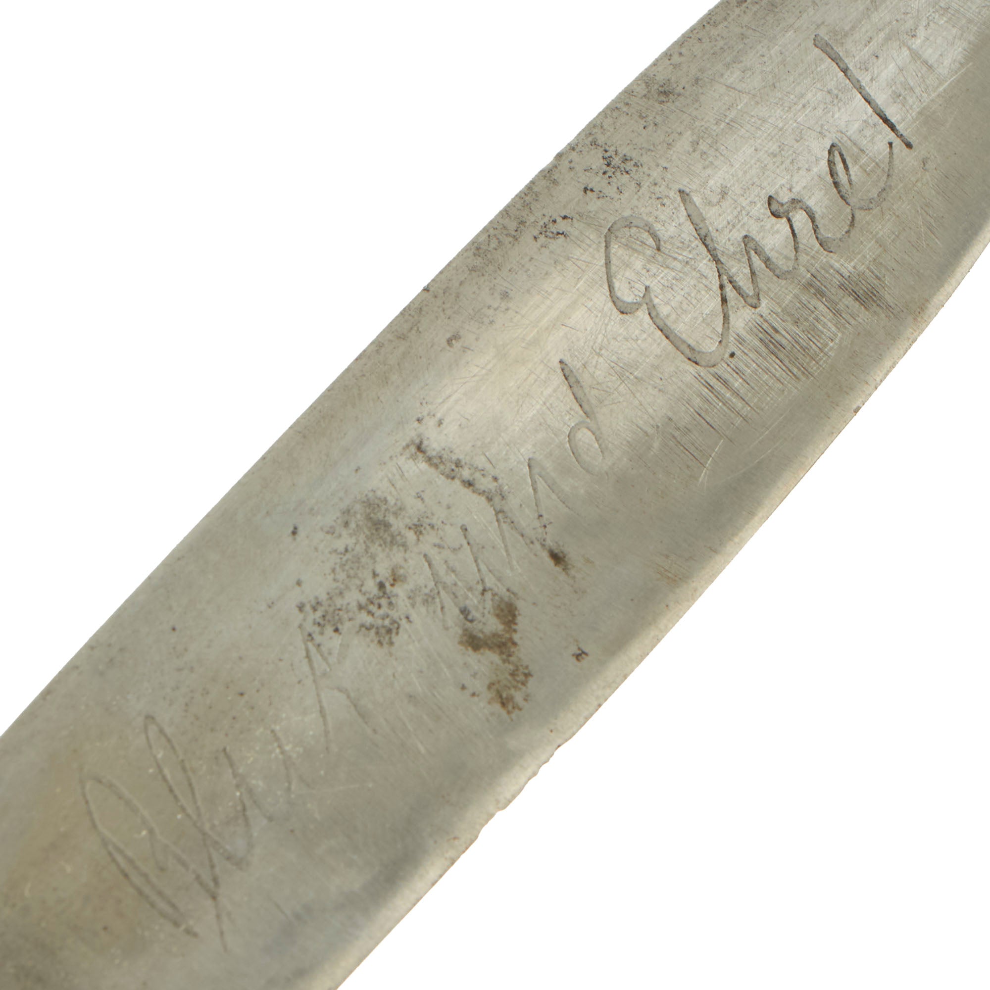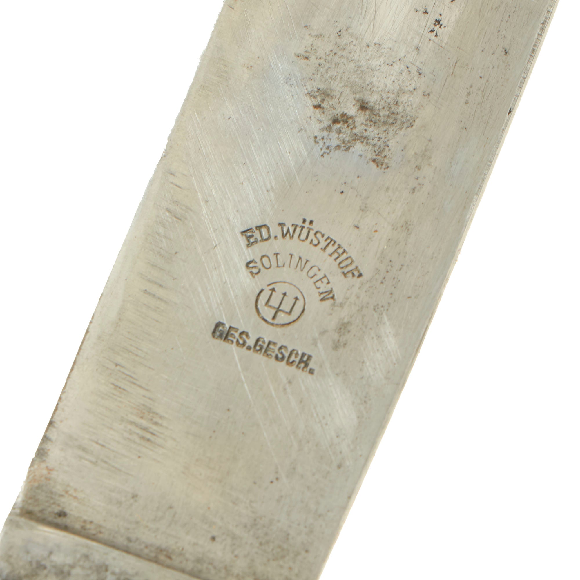 Original Item: Only One Available. This is a very nice transitional HJ Knife, marked on the blade by maker Ed. Wüsthof, Dreizackwerk (Trident Works) of Solingen. This HJ Knife is a solid example of the type, with a handle that is nickel-plated over a steel base. The plating still remains in excellent condition, with about 90% still intact and shiny. The acid-etched motto Blut und Ehre! (Blood and Honor!) is present and legible in the light, but some of the original dark etched finish has been removed by cleaning and runner wear.
