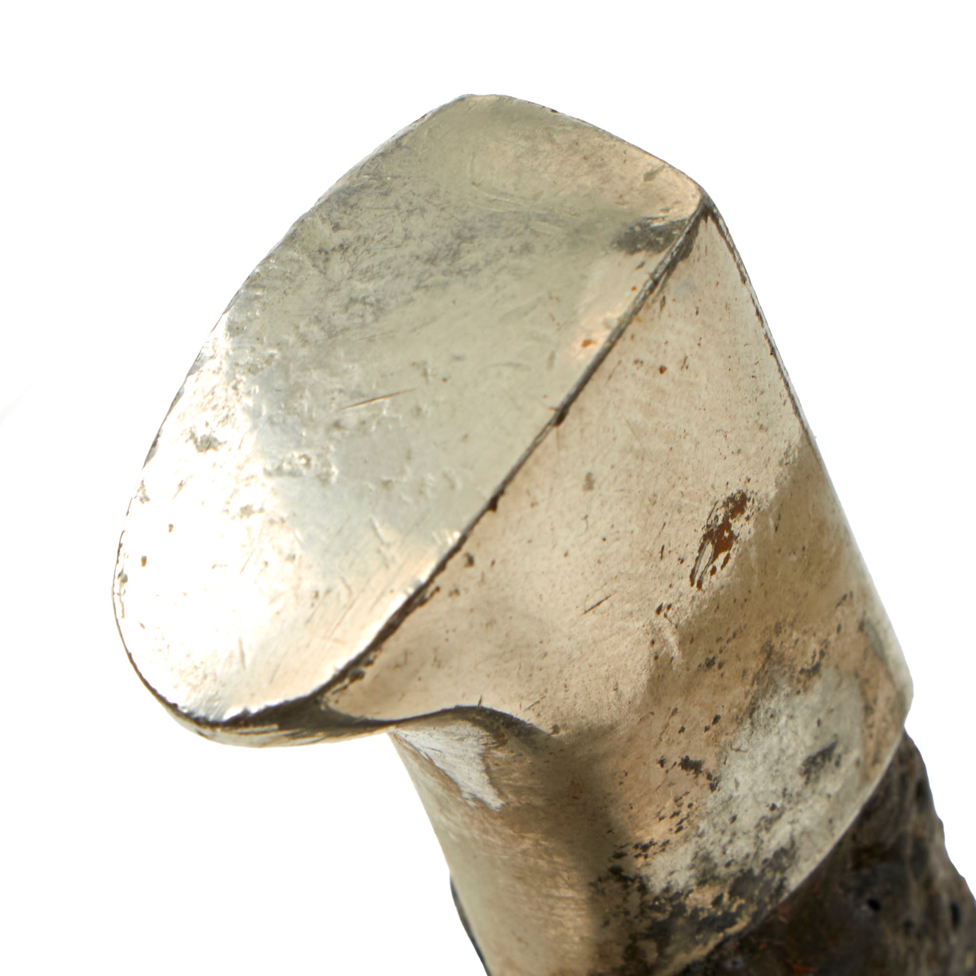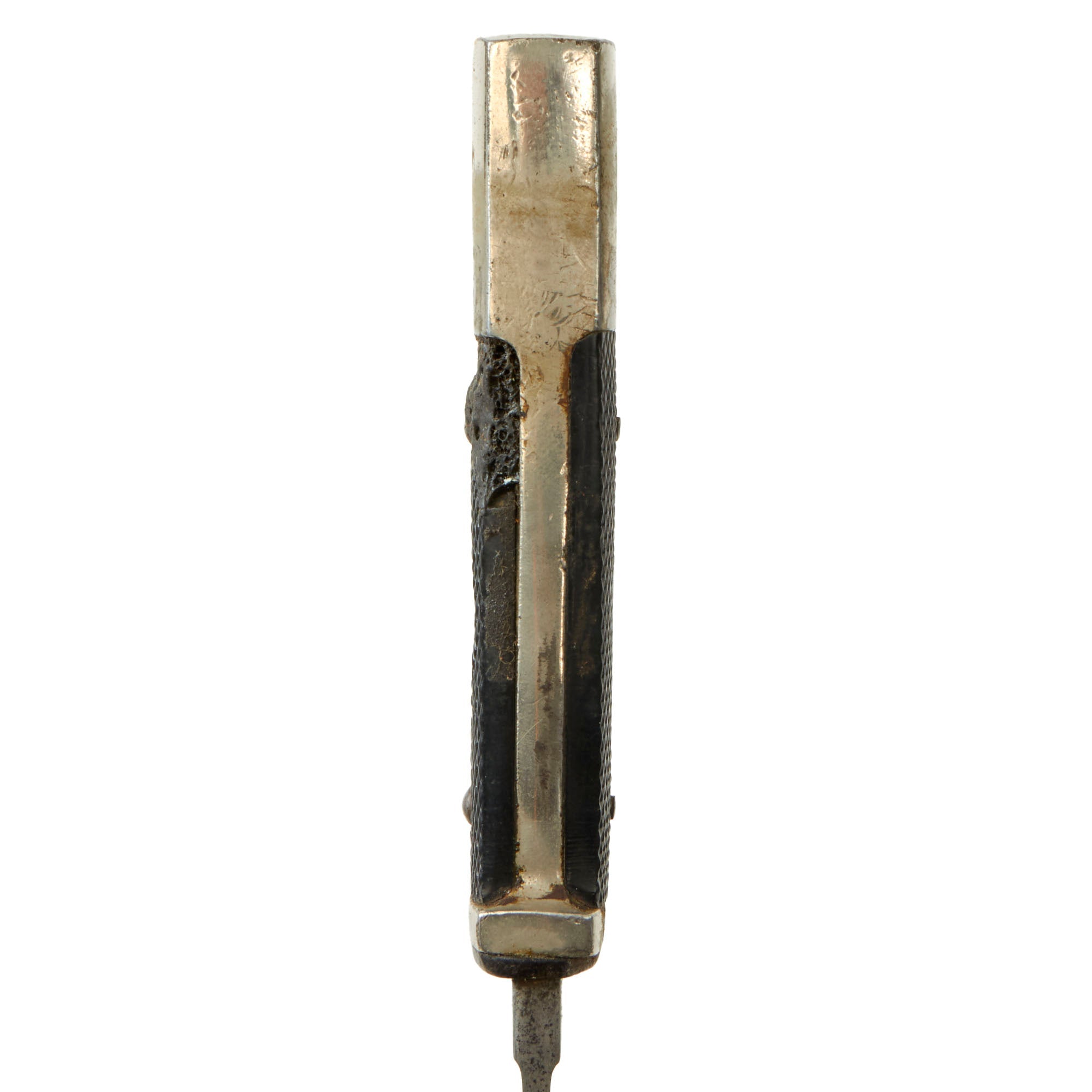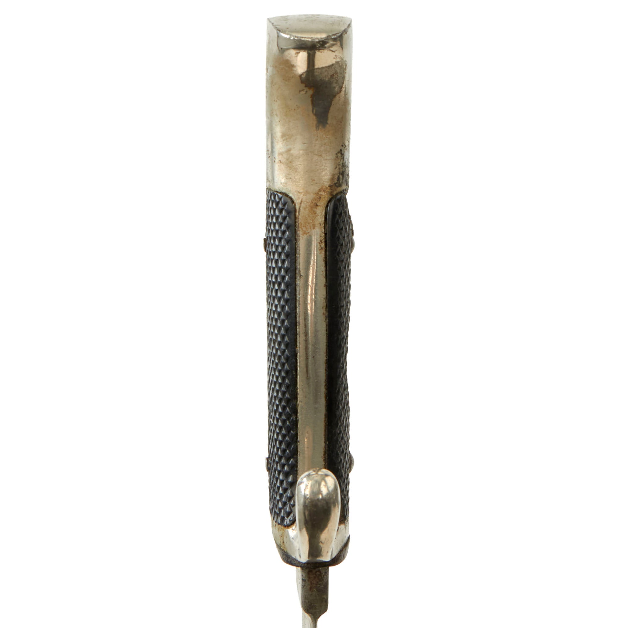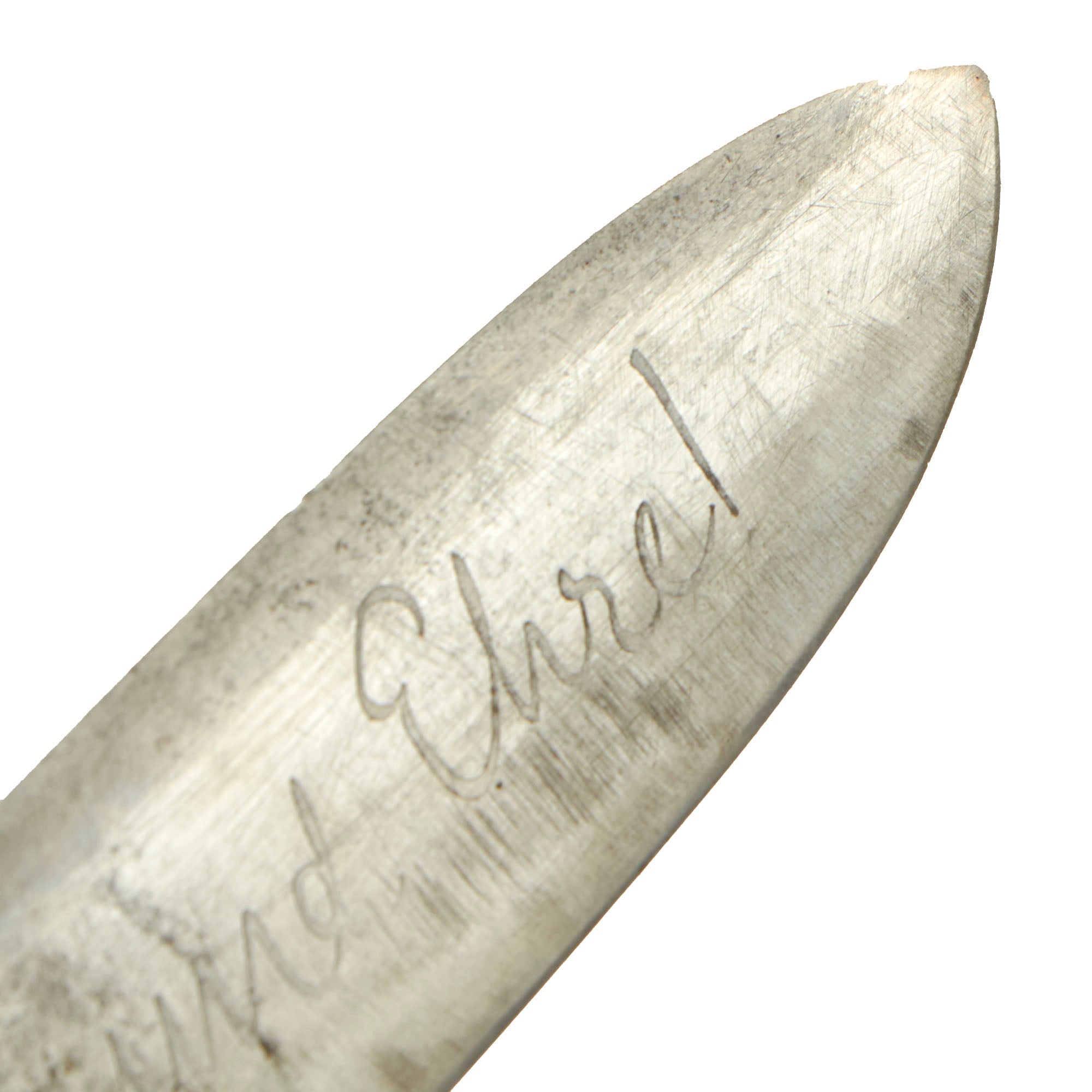 Original Item: Only One Available. This is a very nice transitional HJ Knife, marked on the blade by maker Ed. Wüsthof, Dreizackwerk (Trident Works) of Solingen. This HJ Knife is a solid example of the type, with a handle that is nickel-plated over a steel base. The plating still remains in excellent condition, with about 90% still intact and shiny. The acid-etched motto Blut und Ehre! (Blood and Honor!) is present and legible in the light, but some of the original dark etched finish has been removed by cleaning and runner wear.