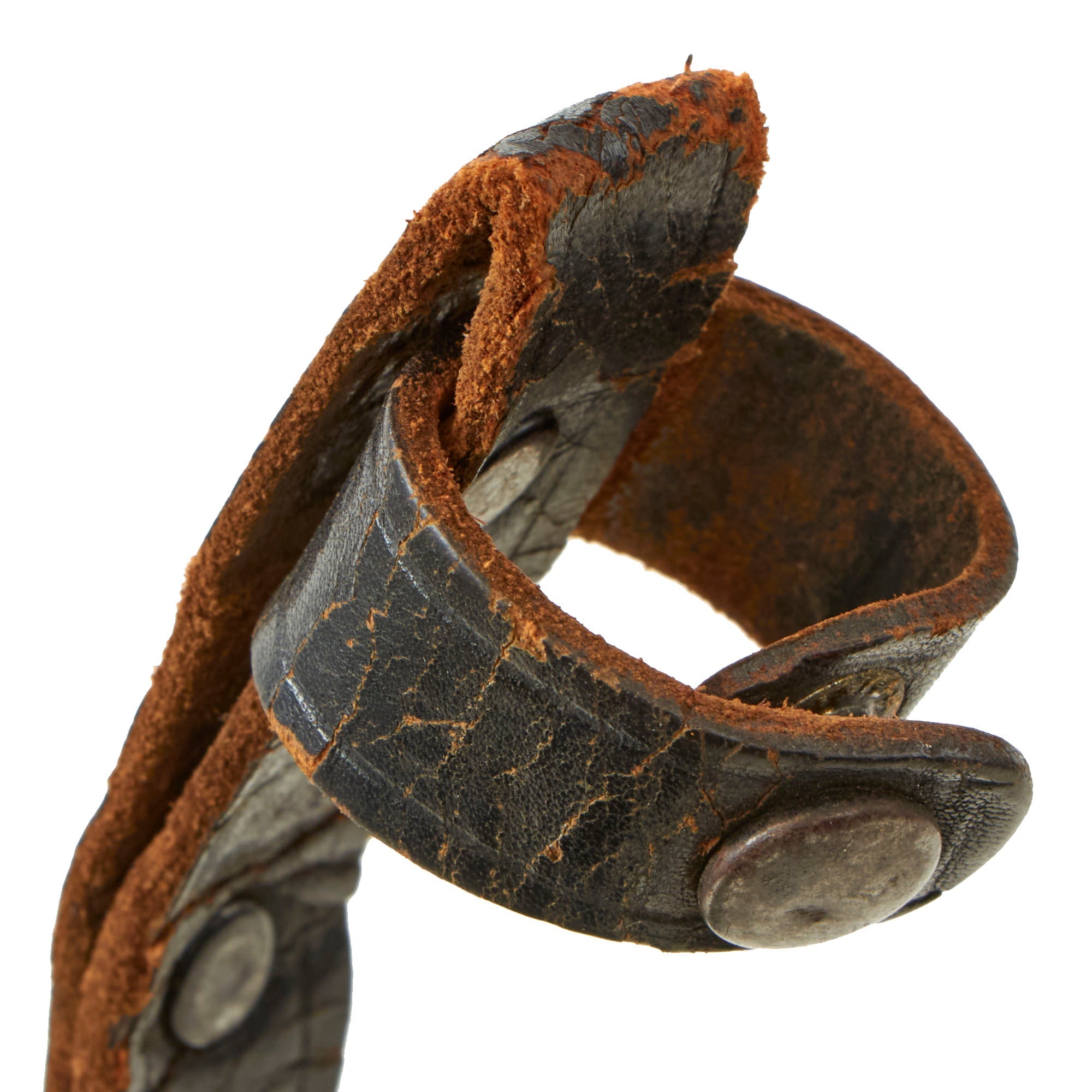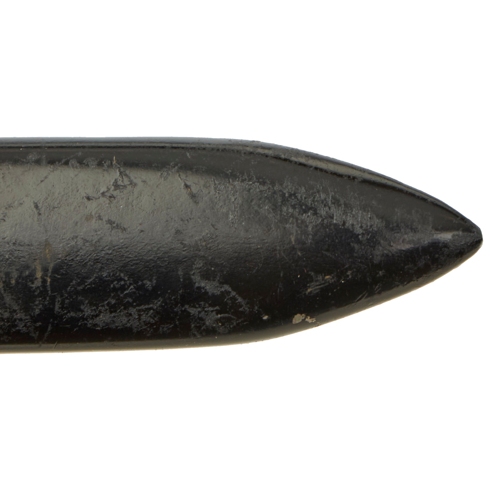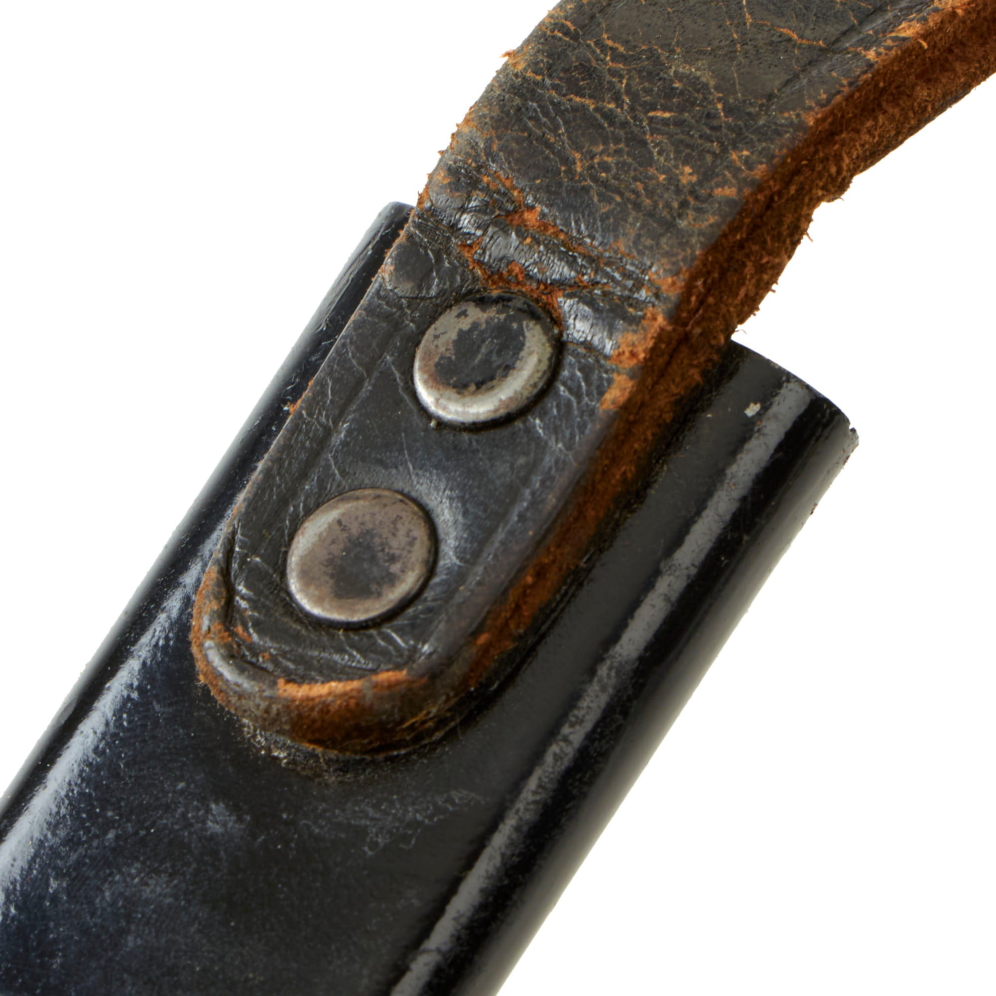 The scabbard shell is the typical tapered example with original paint. The paint is in great shape, about 90%. There is checking and crazing in the lacquer, with flaking and a bit of oxidation. However there are not major dents or other issues. The leather belt loop is intact, and very nice, with a good working snap on the retainer loop. The leather is a bit weak so caution should be taken.