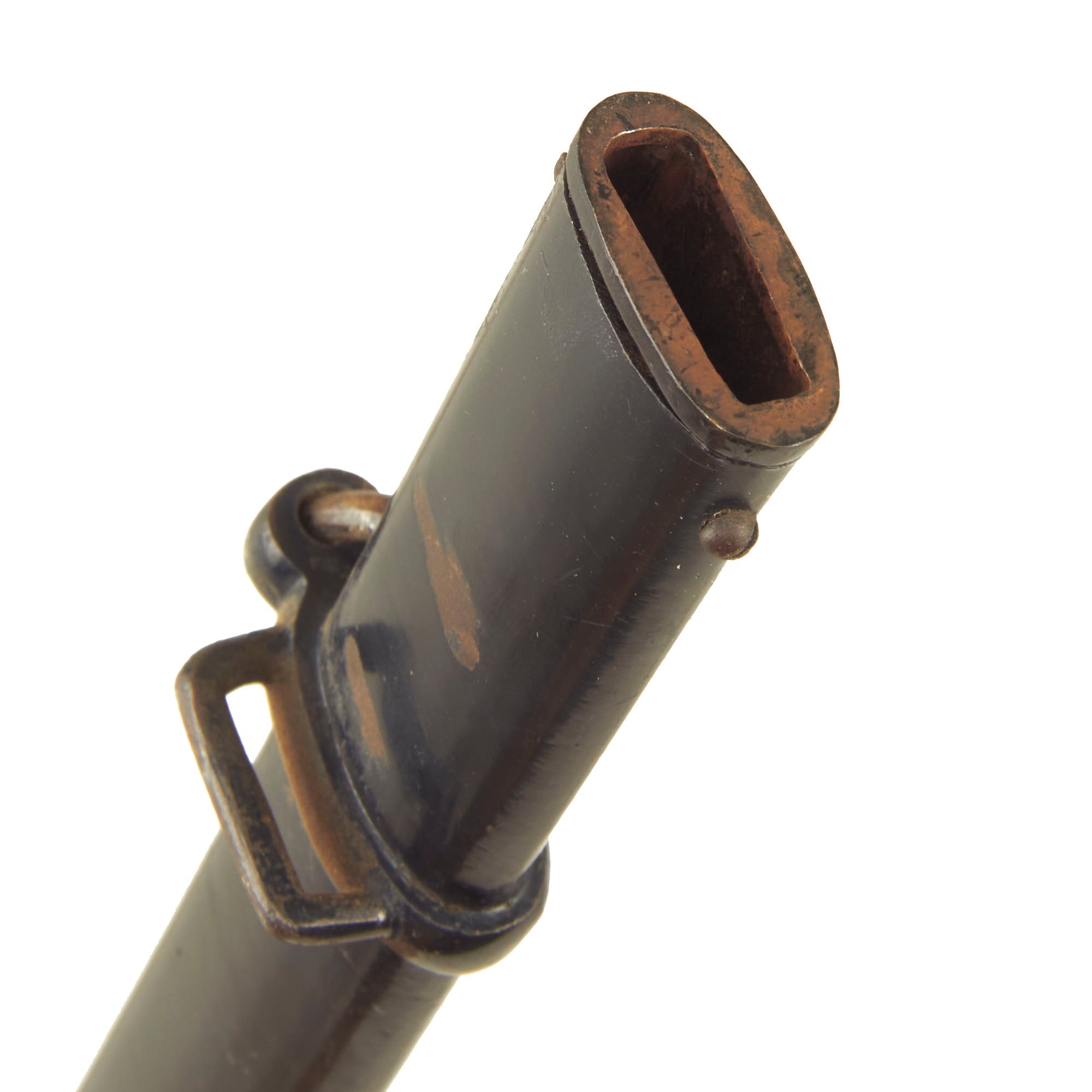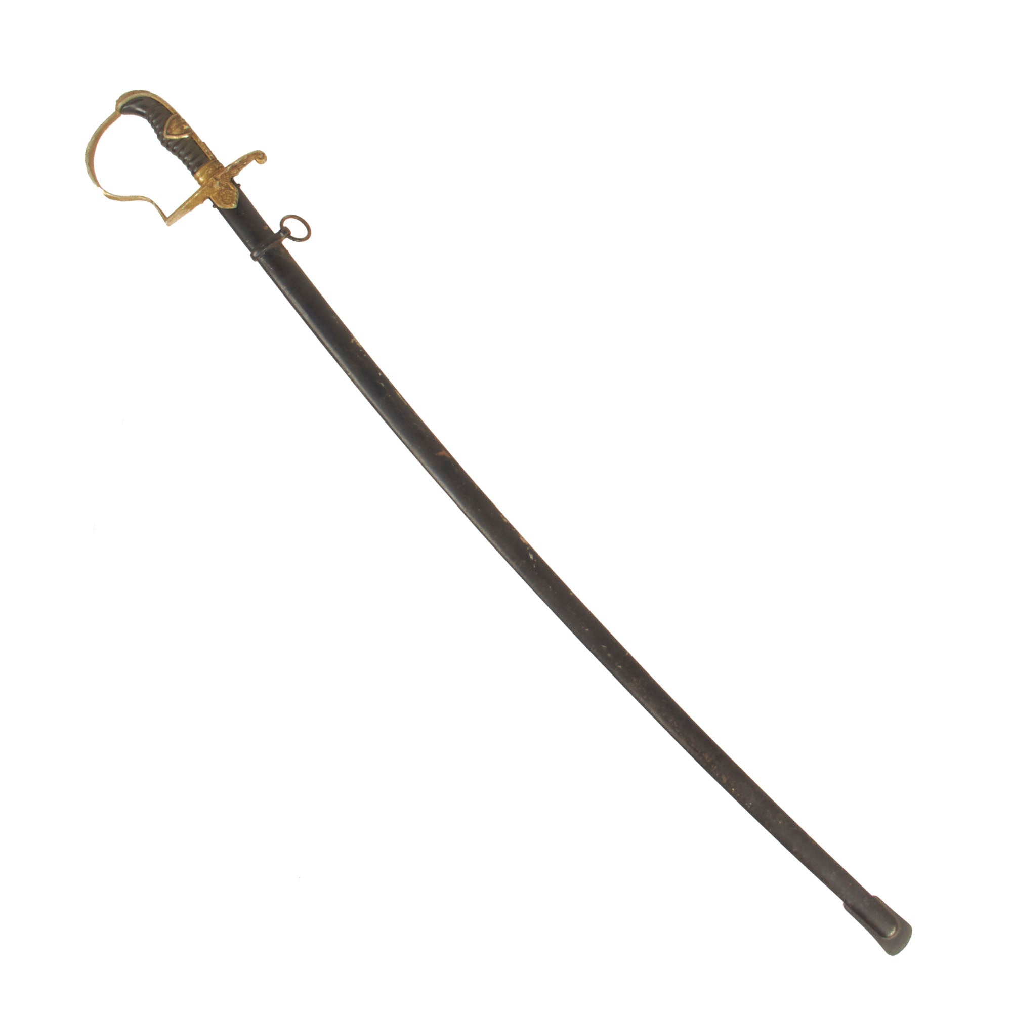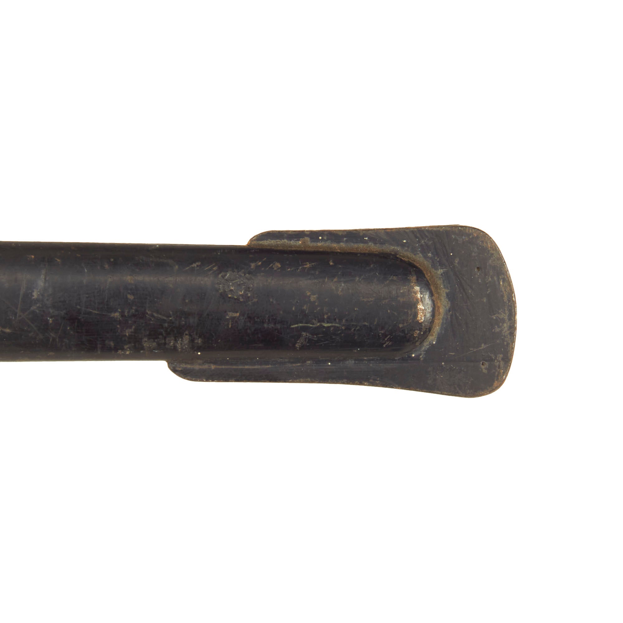 The scabbard of this example still has a very good black enamel finish, it is retained at over 95% with no dents that we can see or feel. There is a bit of scuffing and overall crazing, but overall this is one of the better examples that we have seen, and the checking and crazing verify the age of the finish.. There is some wear near the hanger ring, through to the base metal as is typical.