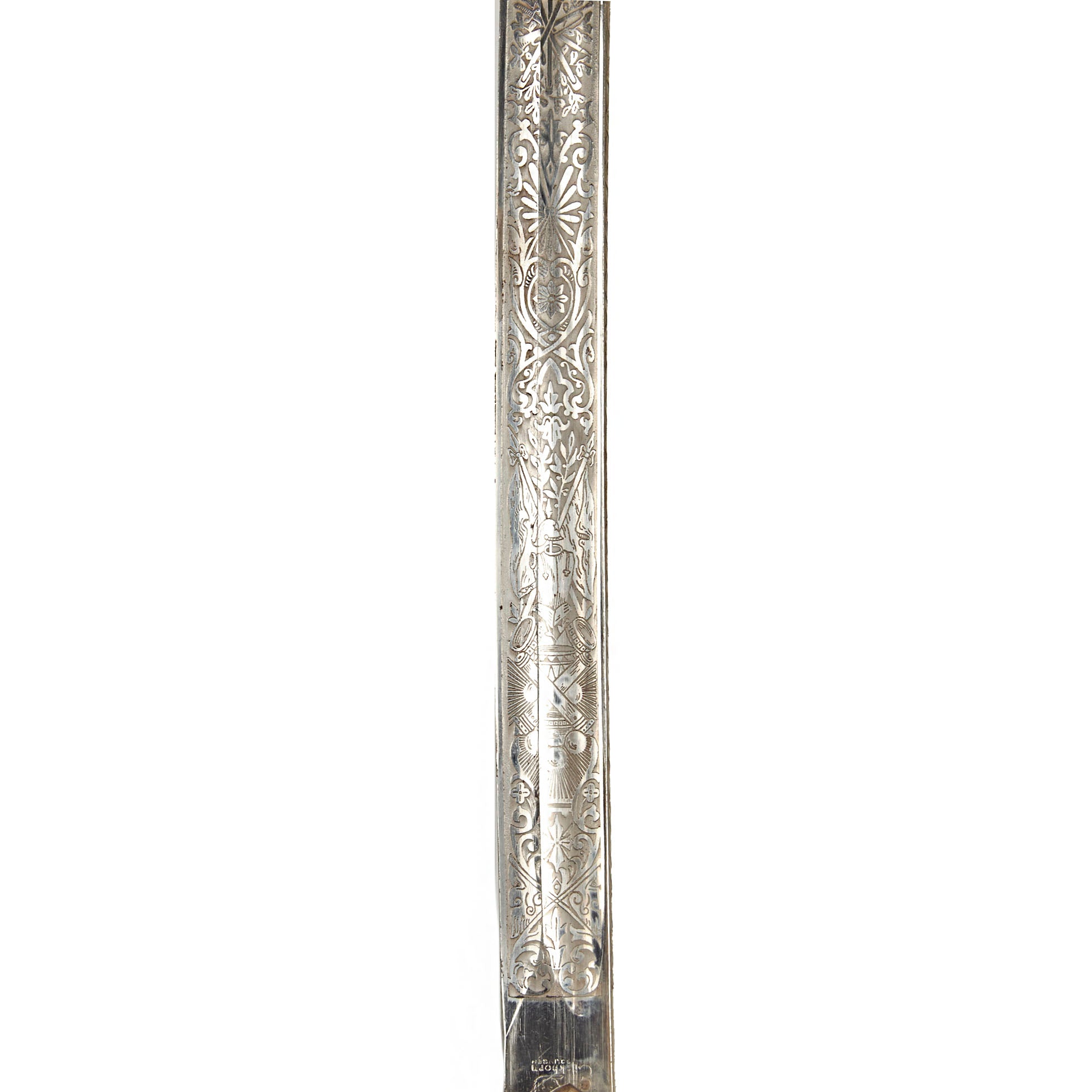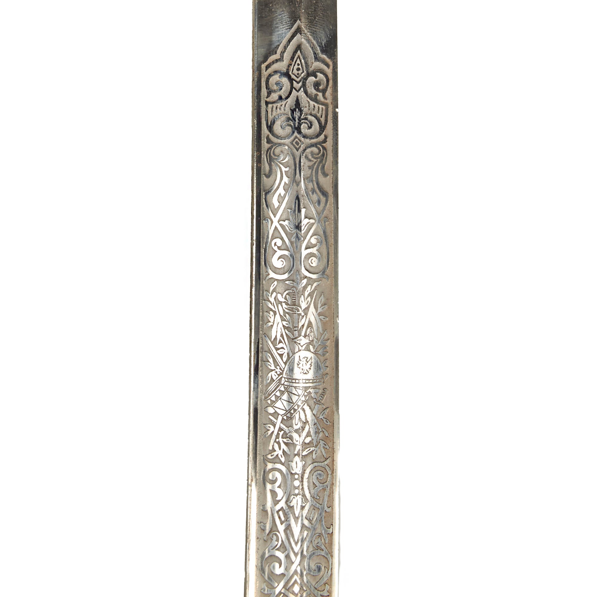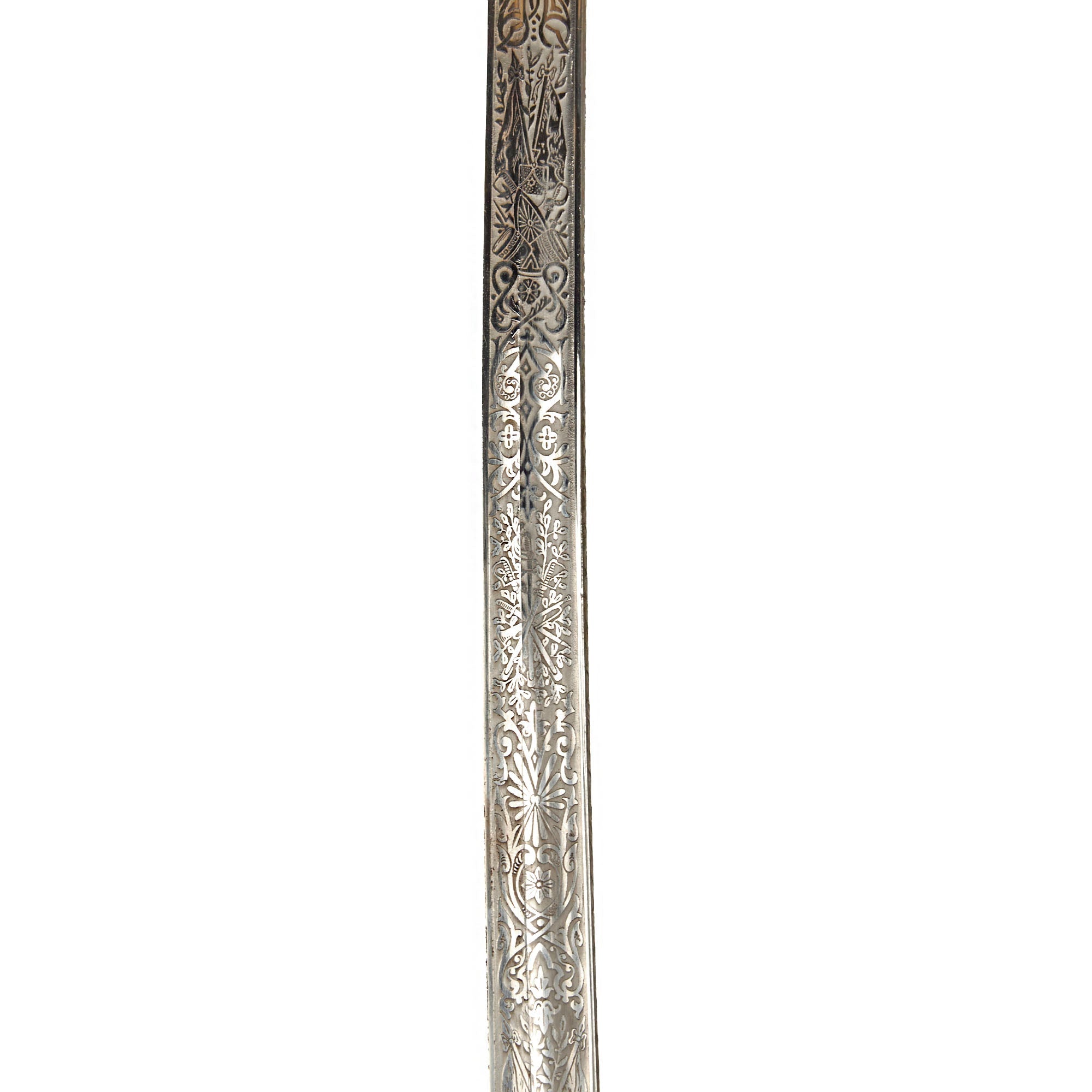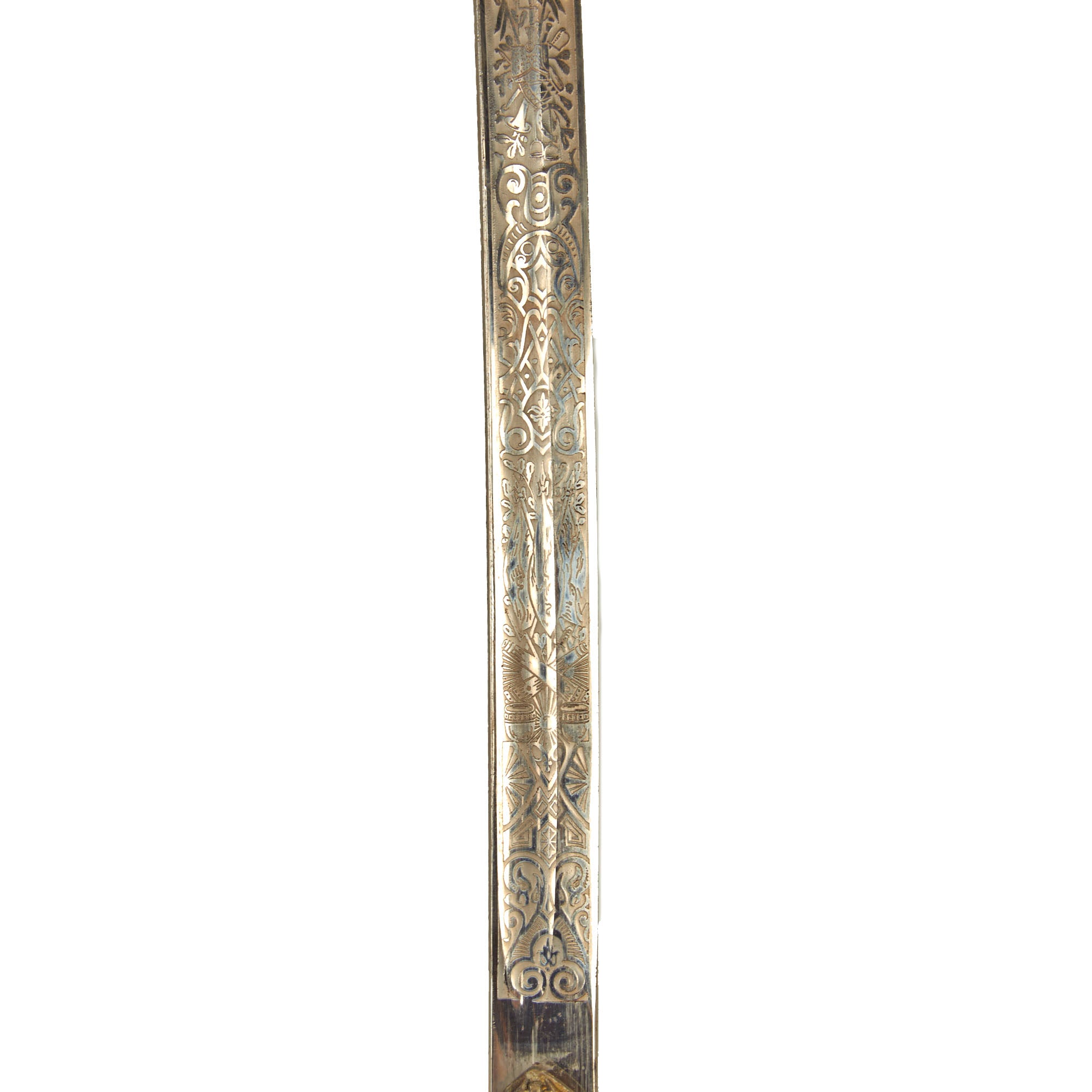 The blade on this sword is an incredible example. It measures 31 3/4 inches and has the highest quality nickel plating. It also is TRIPLE ETCHED, with fantastic designs on both sides of the blade, as well as the spine. Both sides show lots of foliate designs, and also have crossed cannons, so this may have been for an artillery officer. The plating is very well retained, with just a few arears of scuffing and oxidation. The blade has correctly not been sharpened, and has just a few minor dents on it.