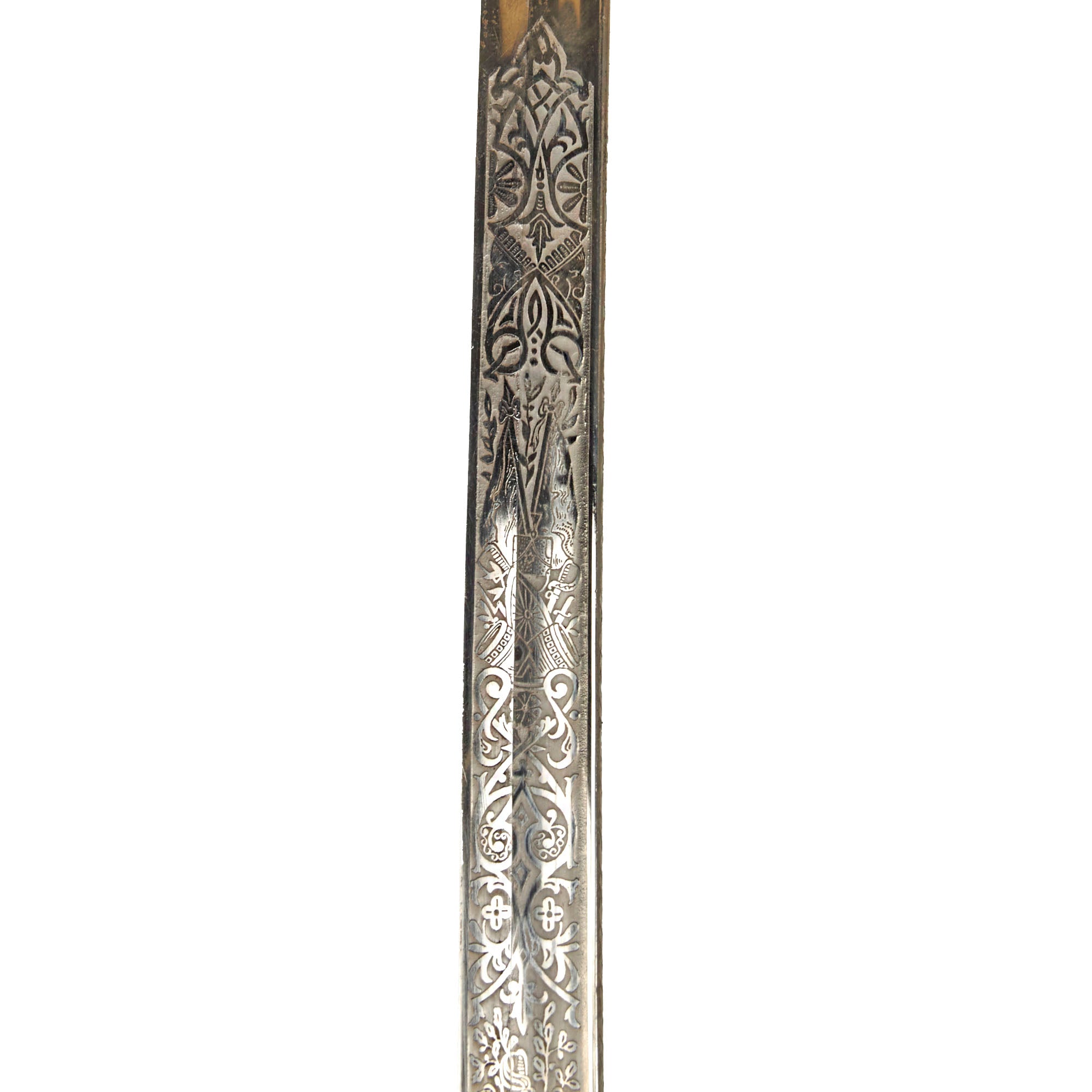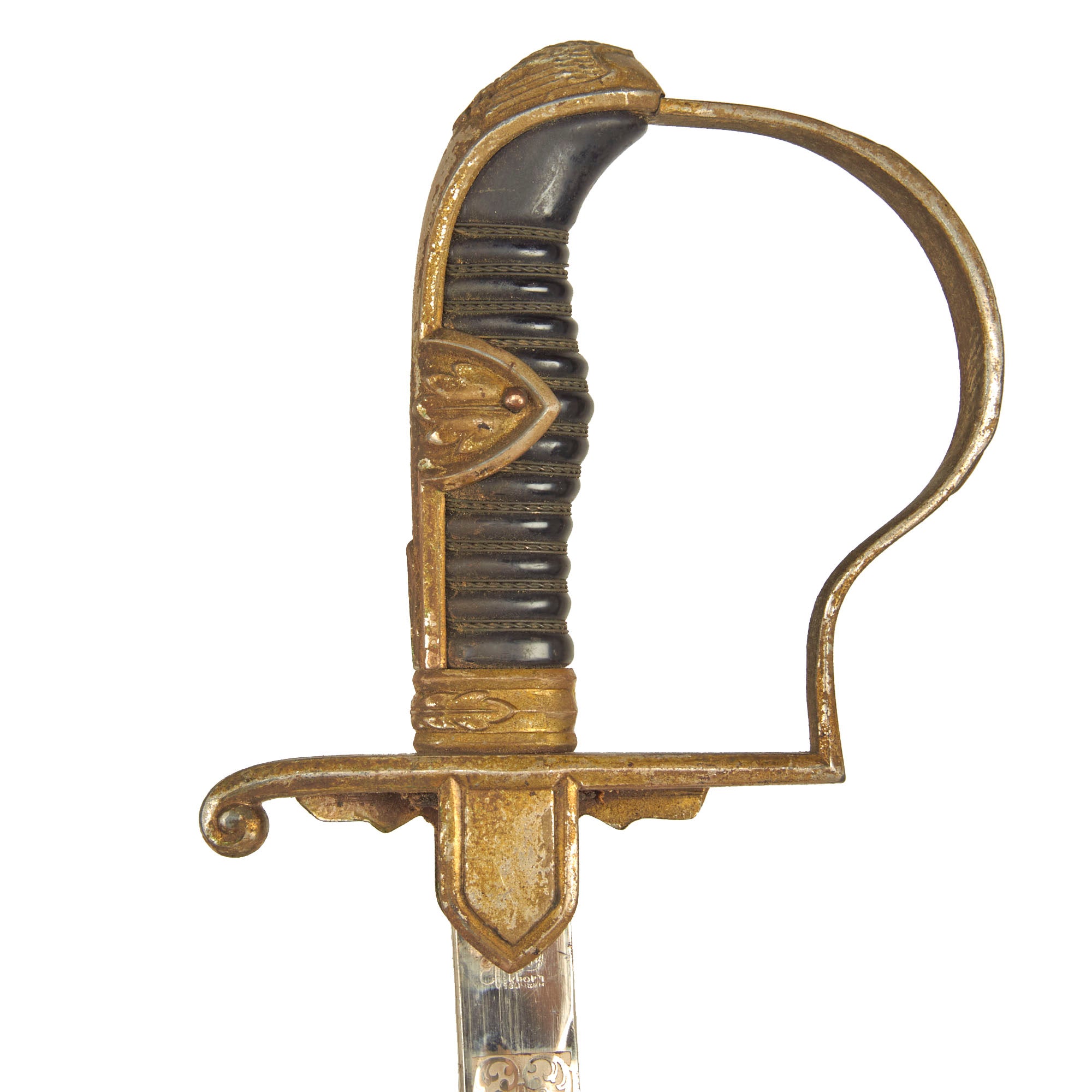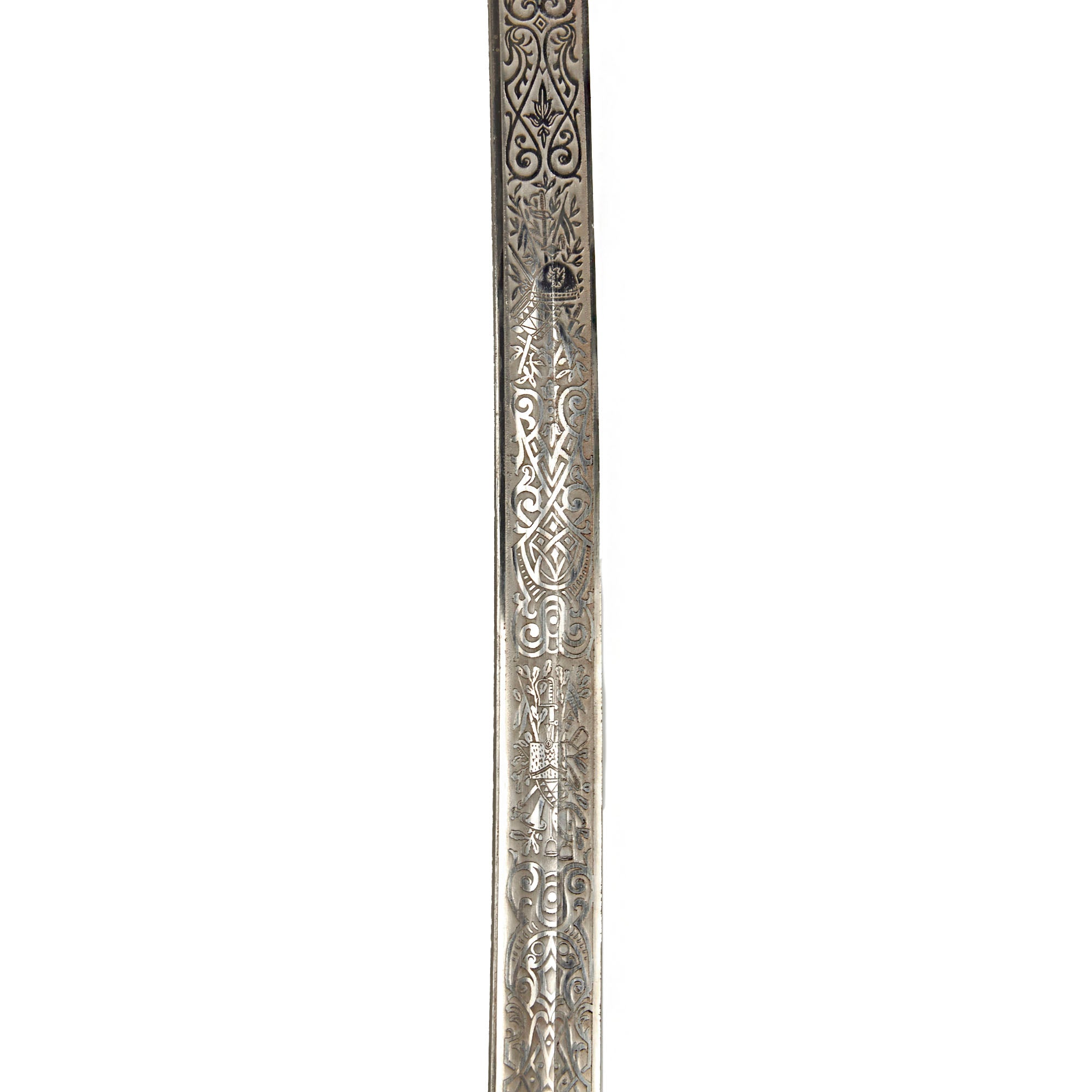 The blade on this sword is an incredible example. It measures 31 3/4 inches and has the highest quality nickel plating. It also is TRIPLE ETCHED, with fantastic designs on both sides of the blade, as well as the spine. Both sides show lots of foliate designs, and also have crossed cannons, so this may have been for an artillery officer. The plating is very well retained, with just a few arears of scuffing and oxidation. The blade has correctly not been sharpened, and has just a few minor dents on it.