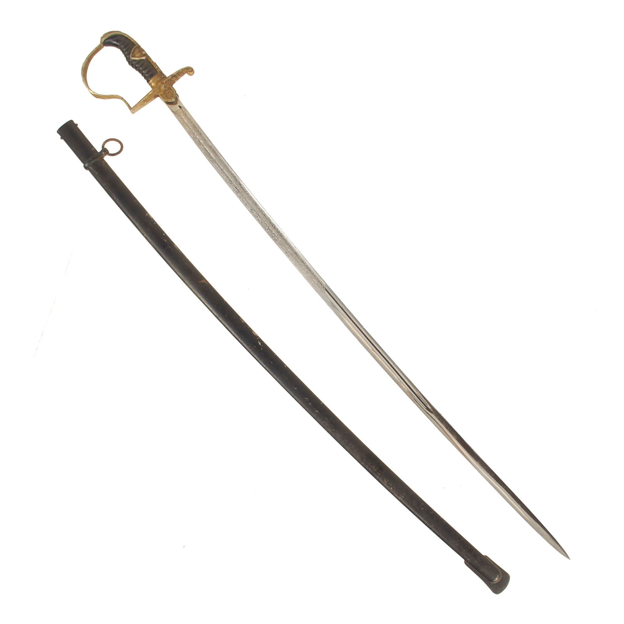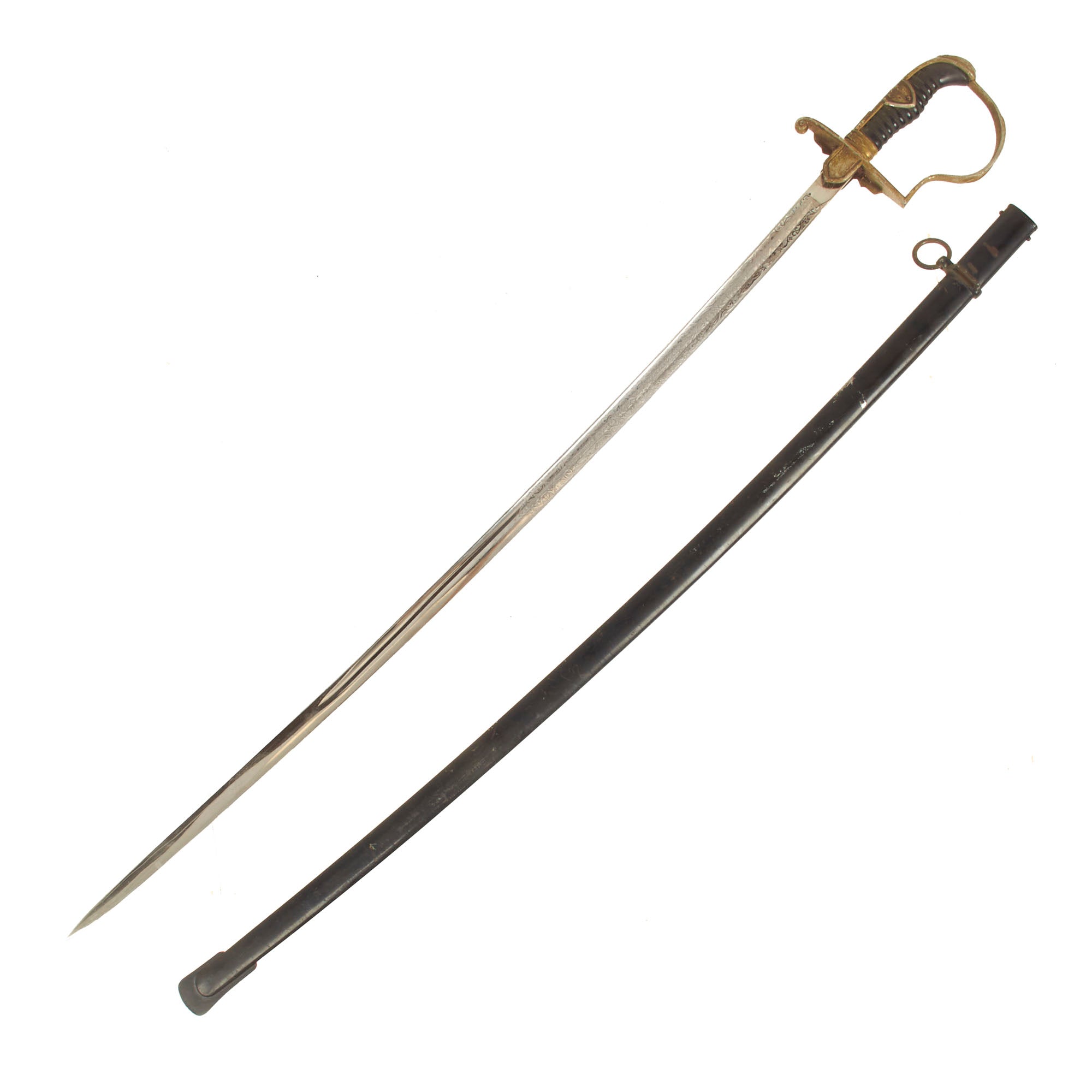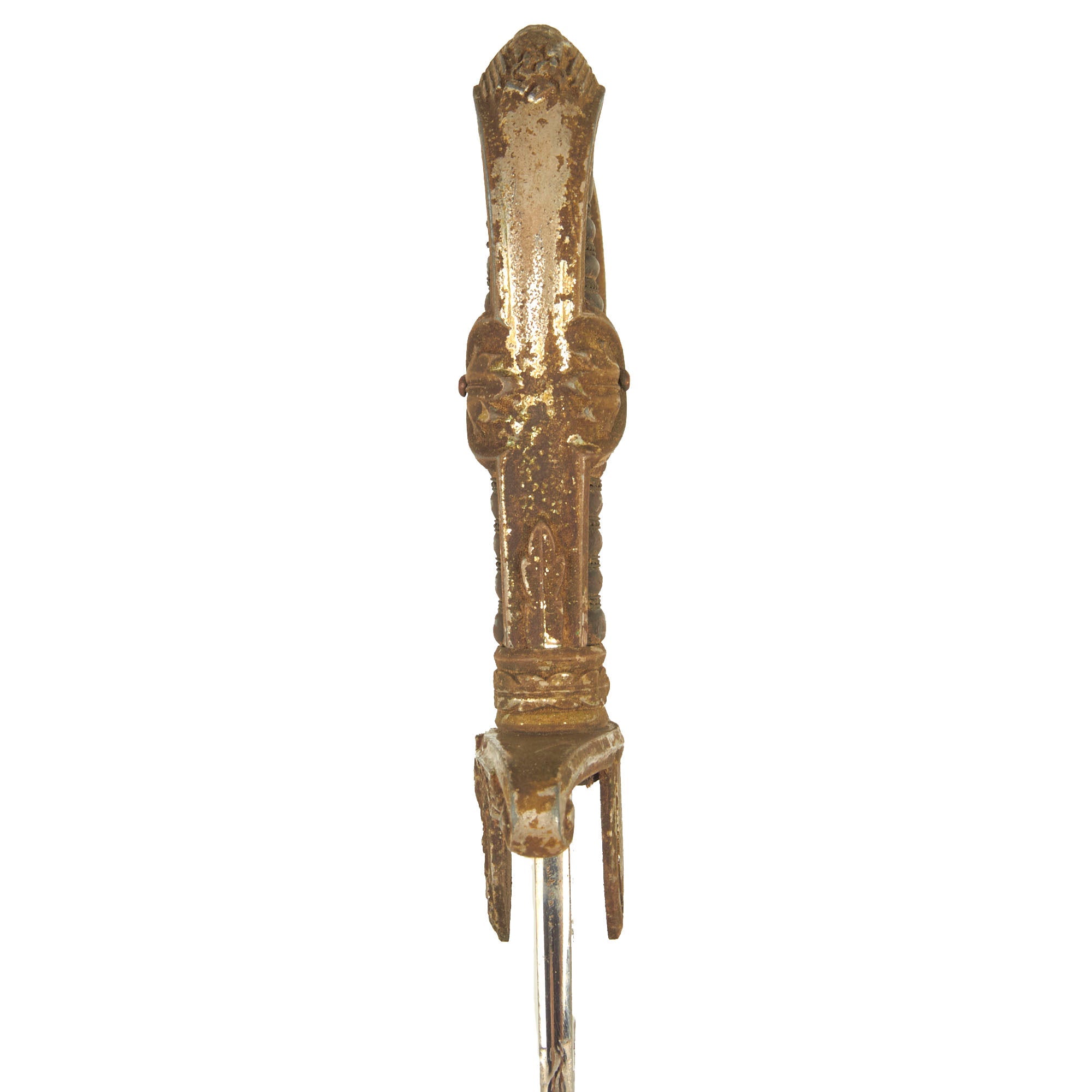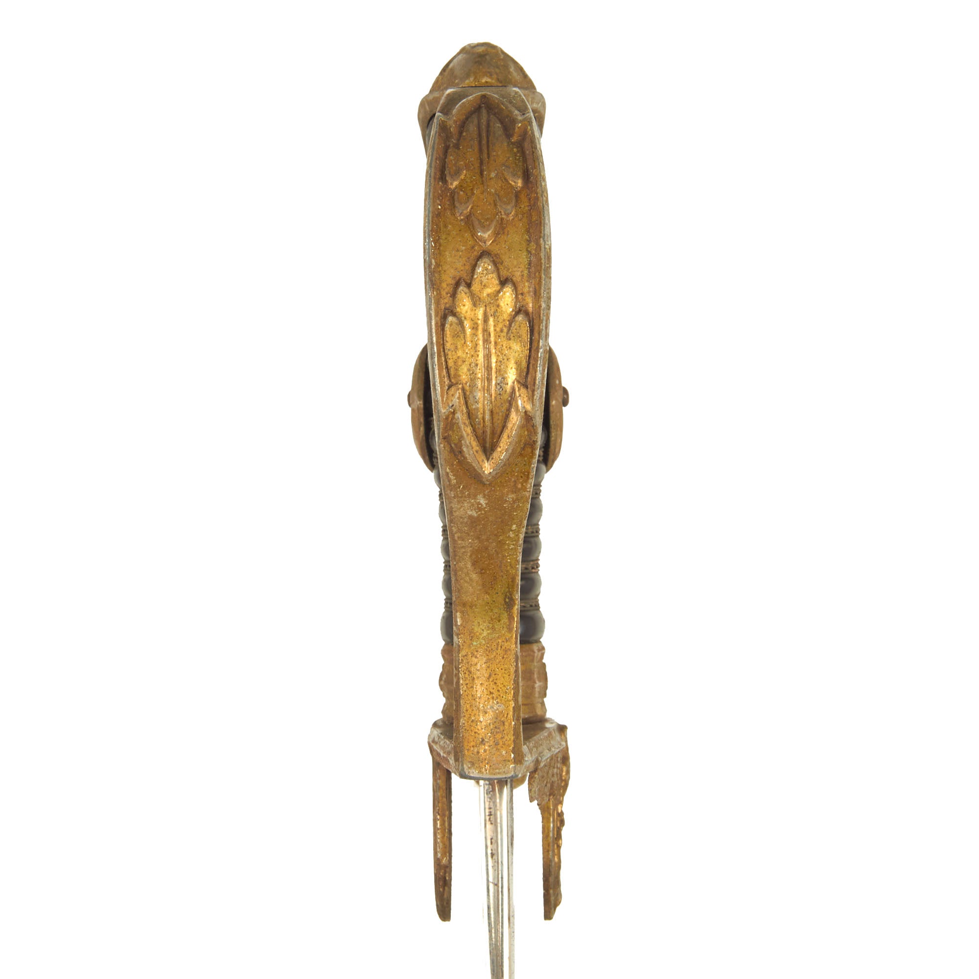 The blade on this sword is an incredible example. It measures 31 3/4 inches and has the highest quality nickel plating. It also is TRIPLE ETCHED, with fantastic designs on both sides of the blade, as well as the spine. Both sides show lots of foliate designs, and also have crossed cannons, so this may have been for an artillery officer. The plating is very well retained, with just a few arears of scuffing and oxidation. The blade has correctly not been sharpened, and has just a few minor dents on it.