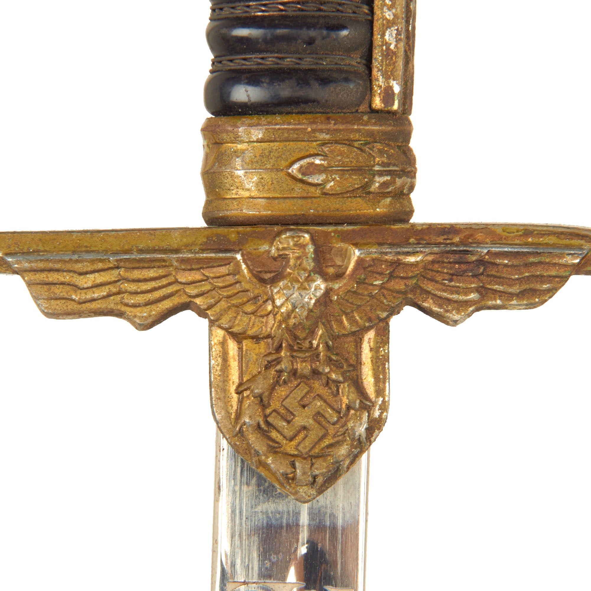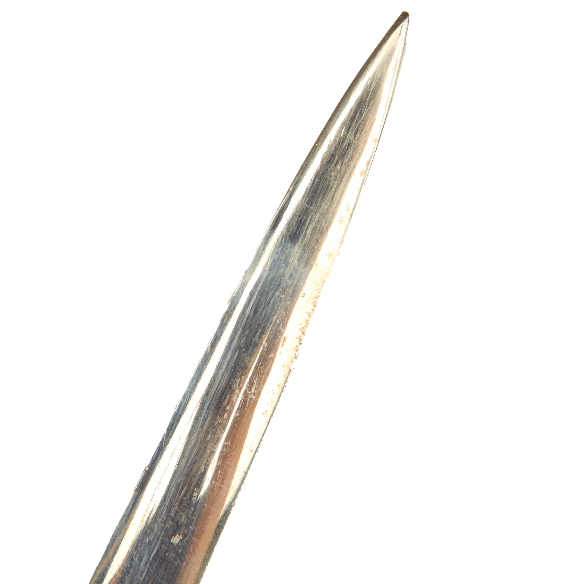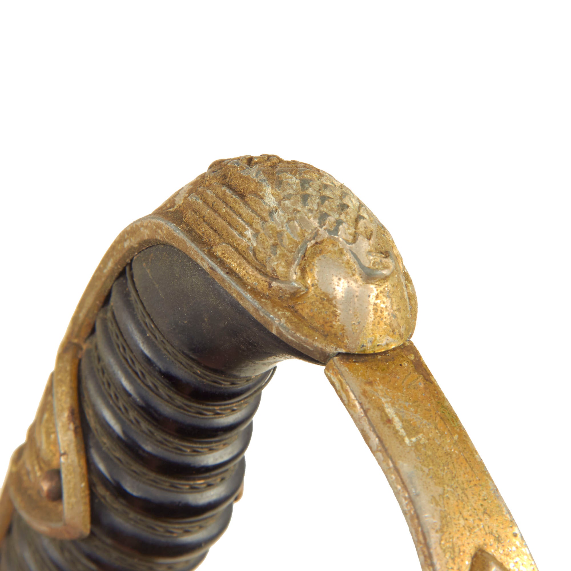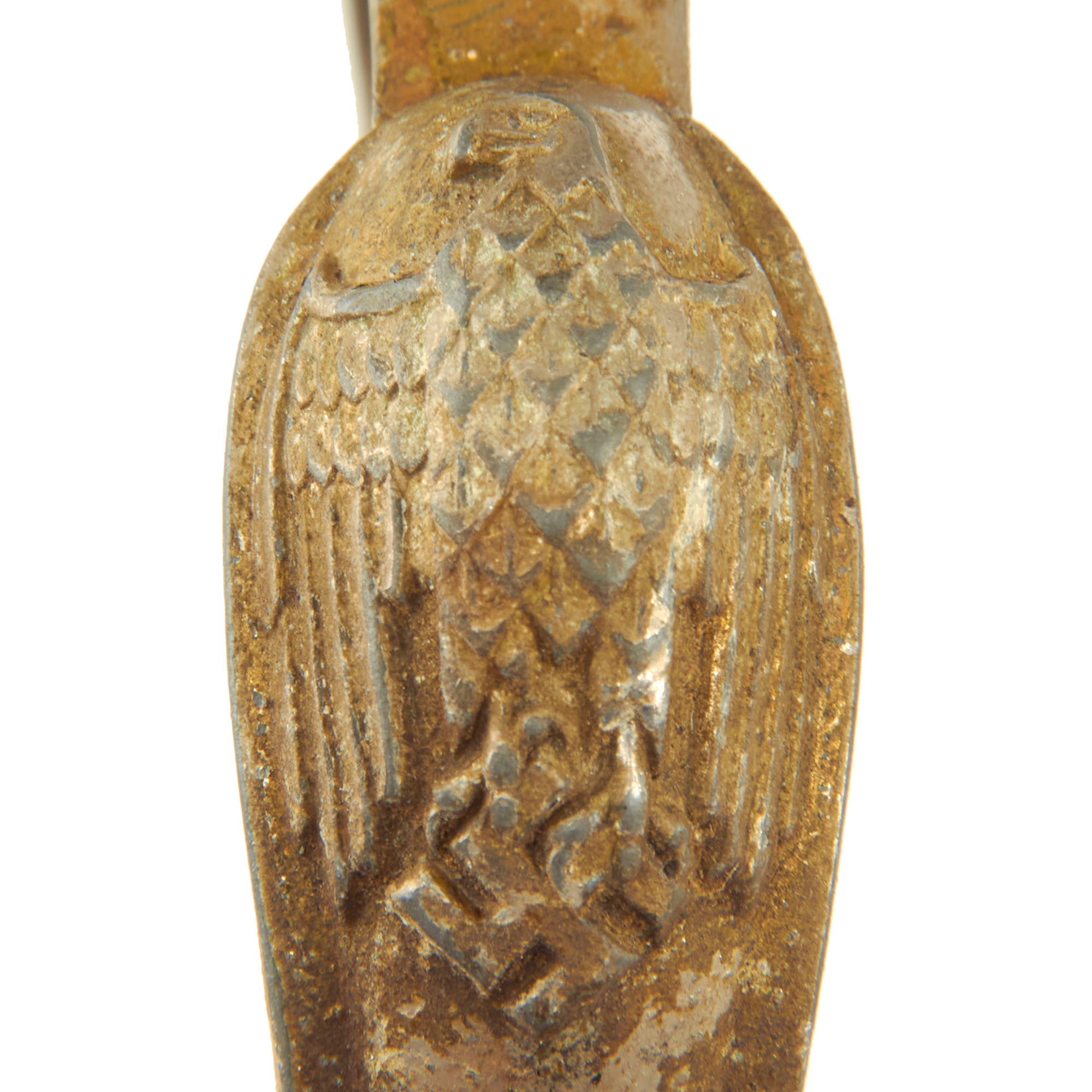 The hilt of the sword has areas of beautiful gilt finish over what looks to be an aluminum alloy base metal that was then brass plated. This combination of hilt metals was sometimes susceptible to plating loss, and unfortunately only around 30% of the gilding remains. The Prinz Eugen design features a less ornate pommel than many others, with simple leaf designs, back strap, "P"-guard and ferrule. The "dove's head" has an NSDAP Reichsadler (National Eagle on it, and the cross guard has an "SS-Style" open-winged eagle which looks to the viewer's left. This art-deco eagle has fine crispness to his eye, breast feathering and raised out swas (hook cross) within a wreath.