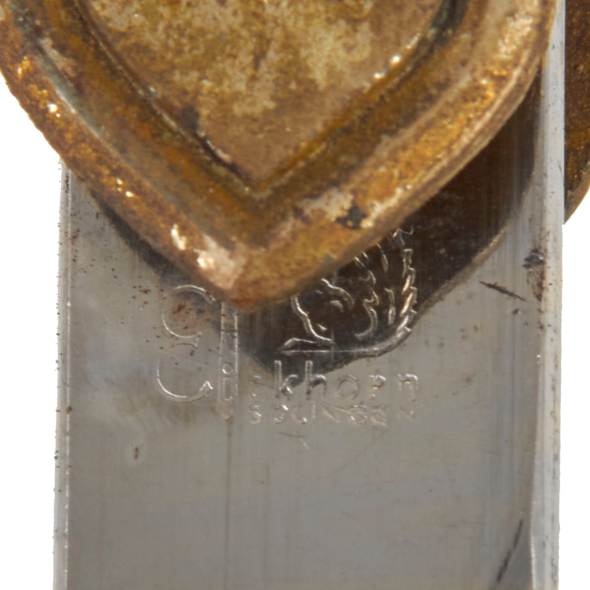 The blade's ricasso under the chappe is stamped with the correct "outline" version of the "Original" Eickhorn trademark: a seated squirrel holding a sword, with the word ORIGINAL above and Eickhorn / SOLINGEN below. Carl Eickhorn is a legendary maker from Solingen, the famous "City of Blades" in Western Germany, and this trademark was used on almost all of the "Field Marshall" series swords.
