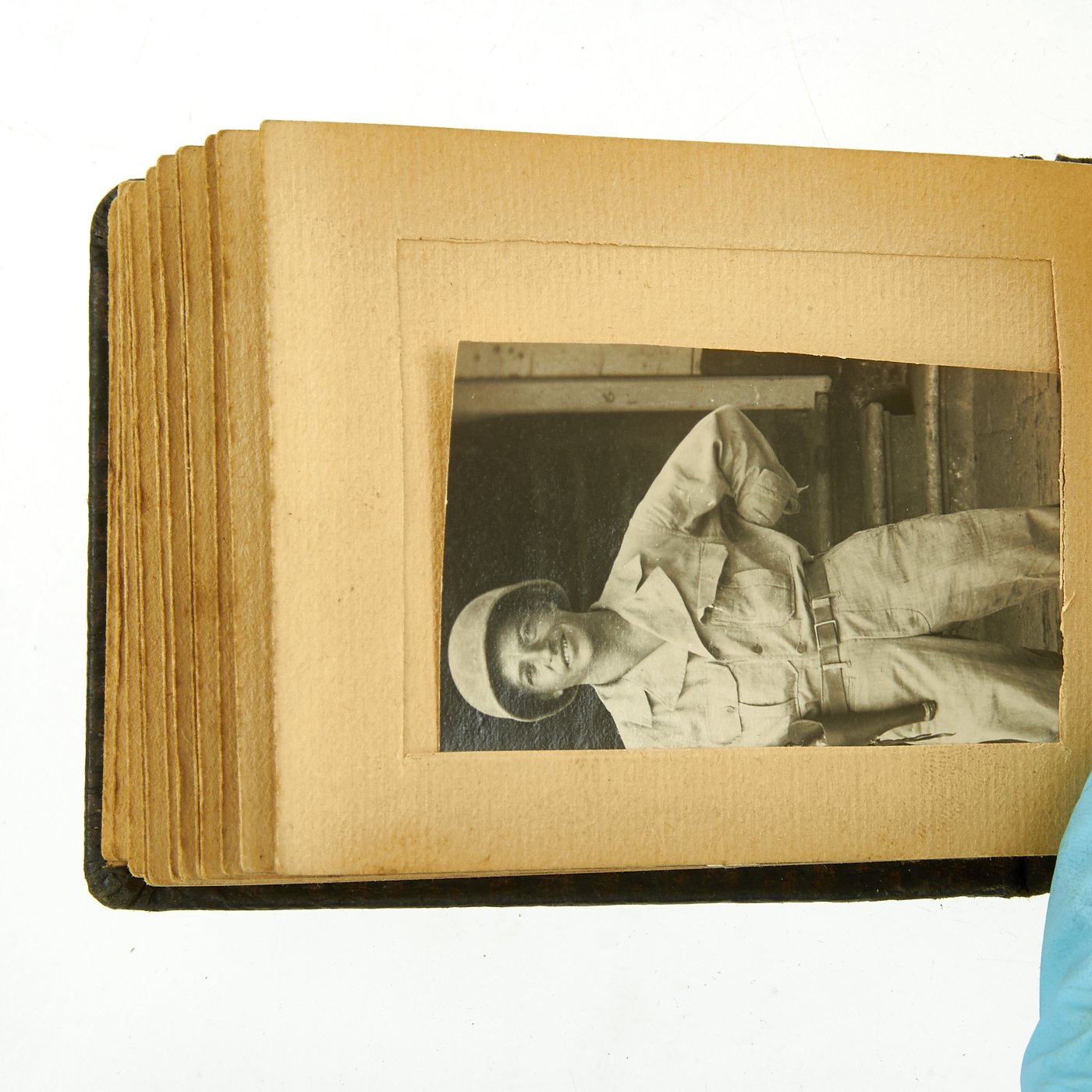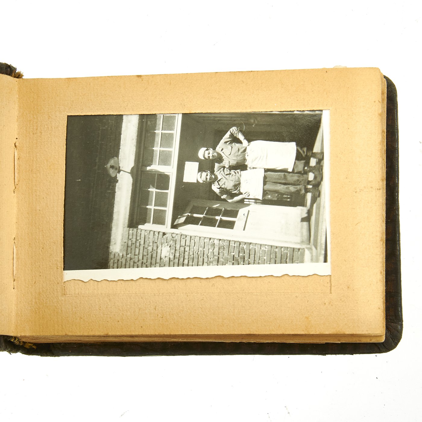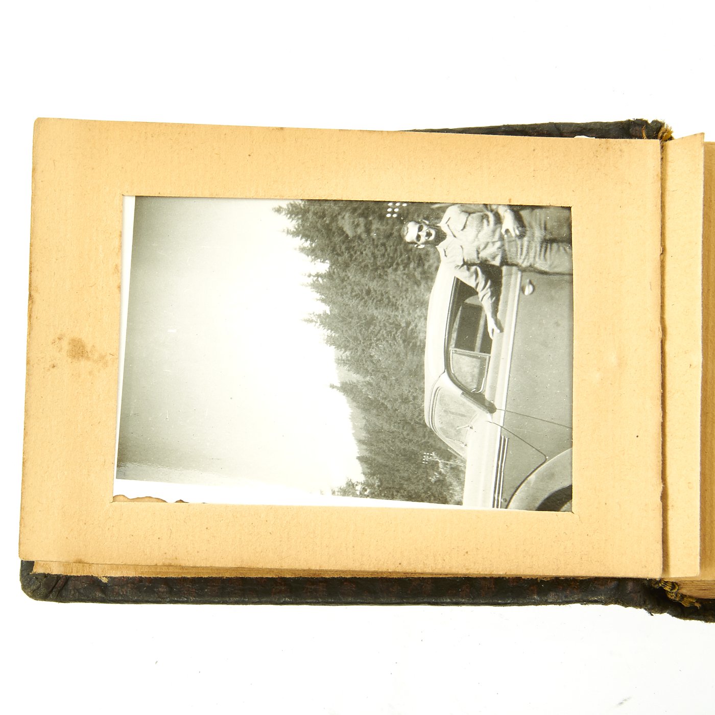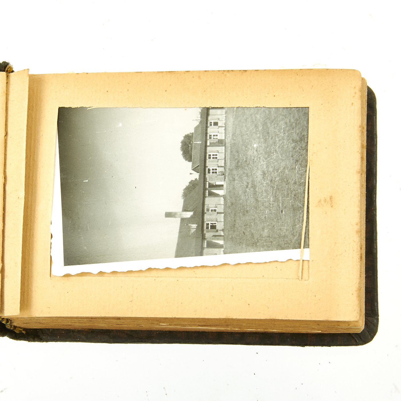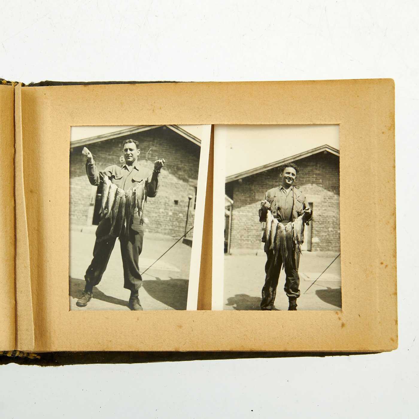 The top of the page is torn away so we are not able to identify the American soldier. The outside cover of the album features a silver helmet badge and a badge that reads egserinnerungen (Memories). Inside there are dozens of small photos of an American infantryman with his fellow soldiers, some that appear to be taken on the grounds of the camp with a tall fence in the background. Features 55 photos all in good condition.