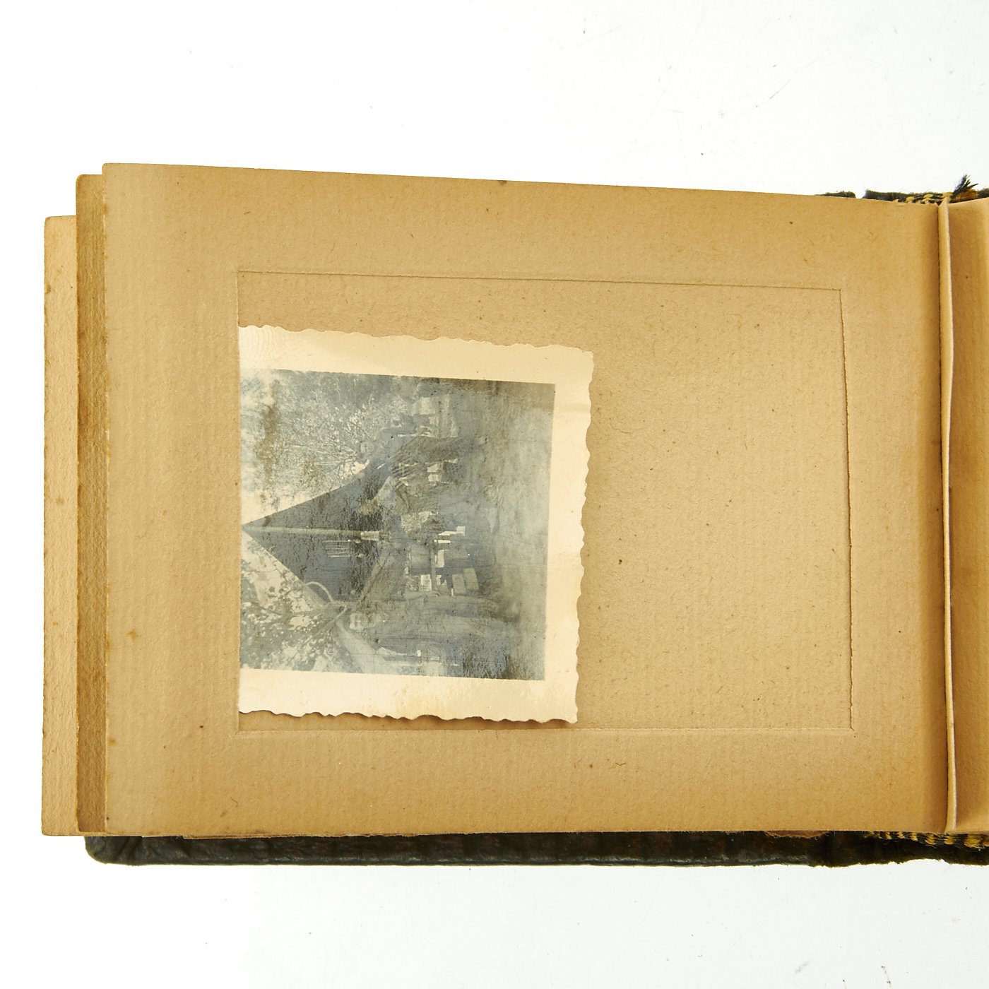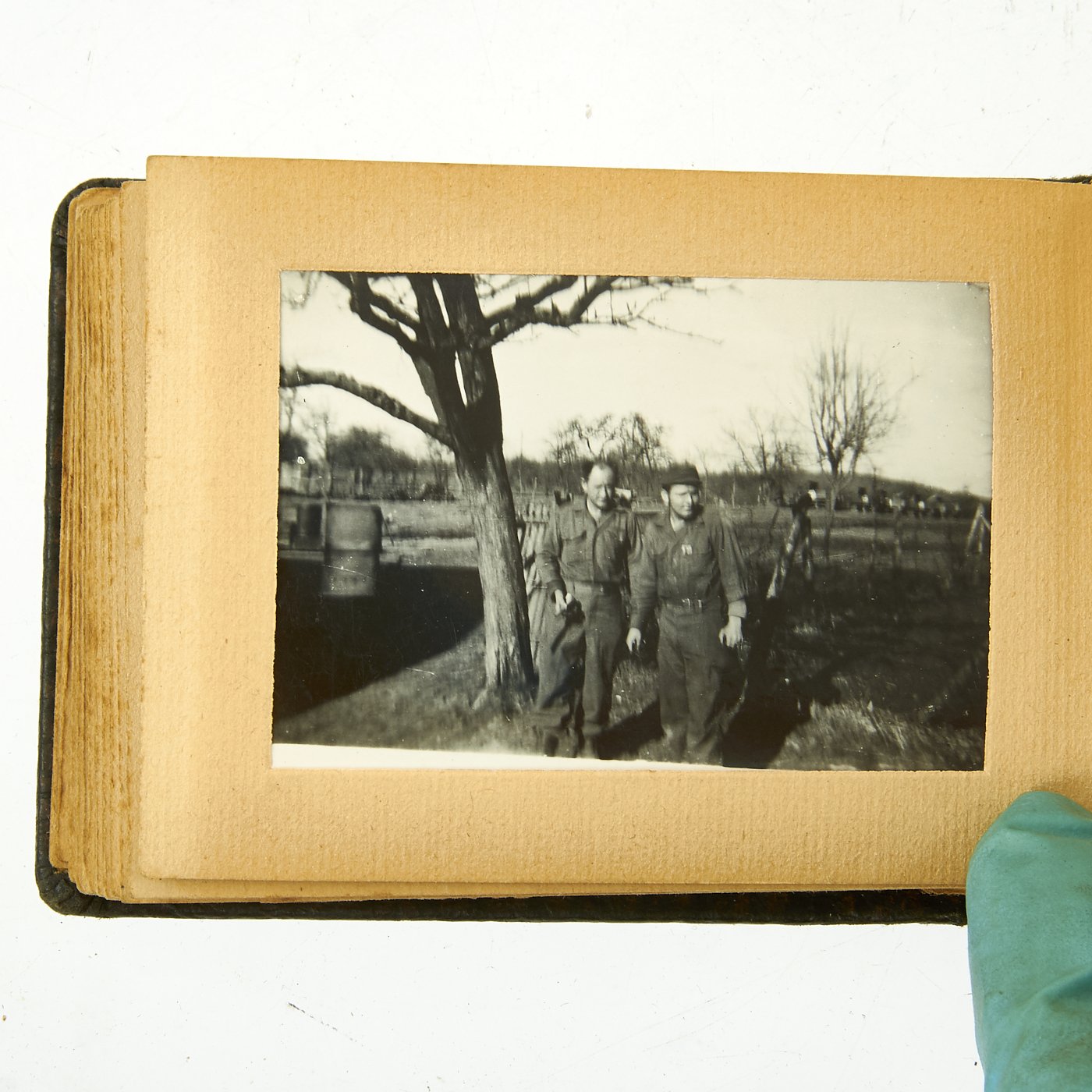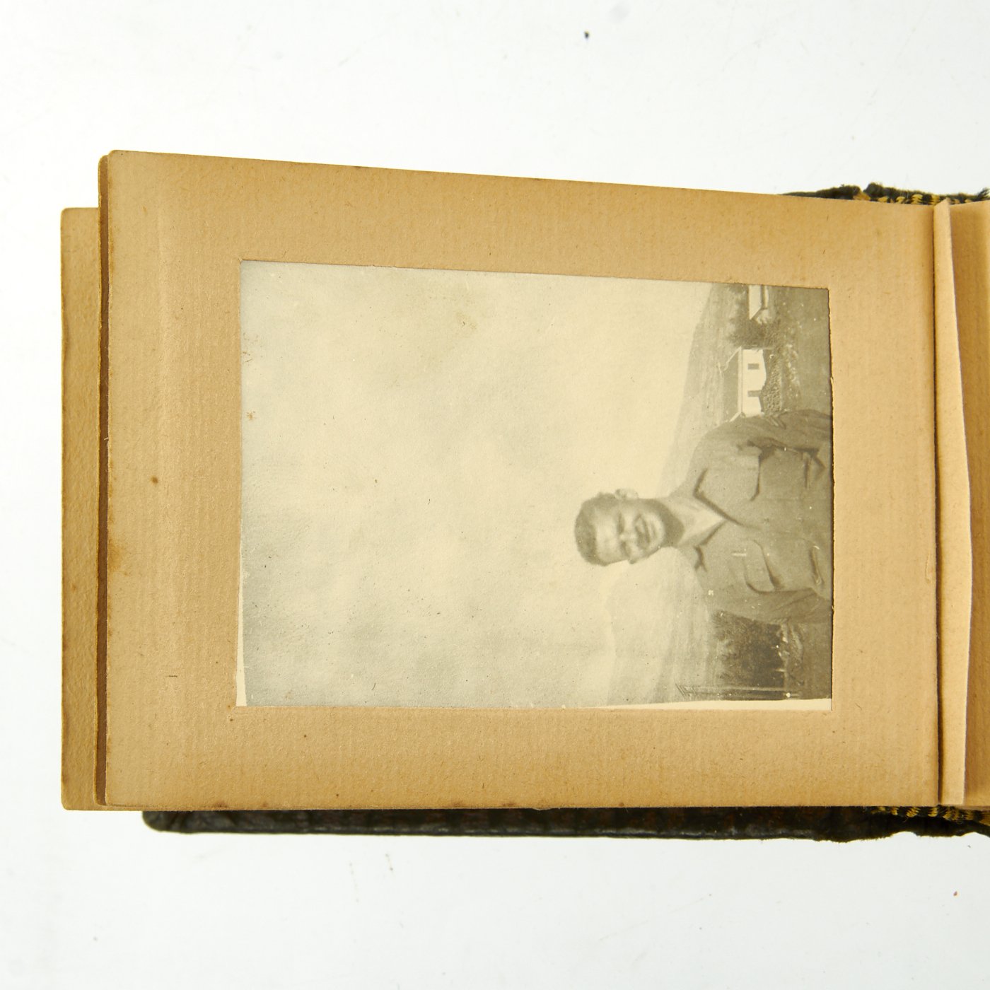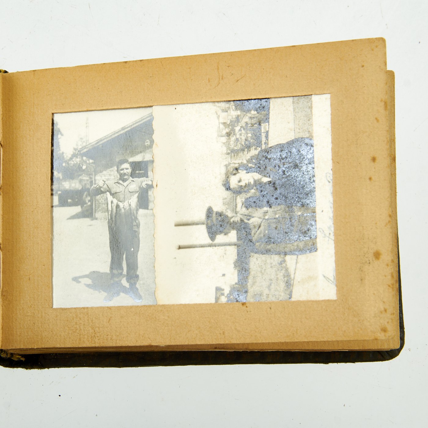 The top of the page is torn away so we are not able to identify the American soldier. The outside cover of the album features a silver helmet badge and a badge that reads egserinnerungen (Memories). Inside there are dozens of small photos of an American infantryman with his fellow soldiers, some that appear to be taken on the grounds of the camp with a tall fence in the background. Features 55 photos all in good condition.