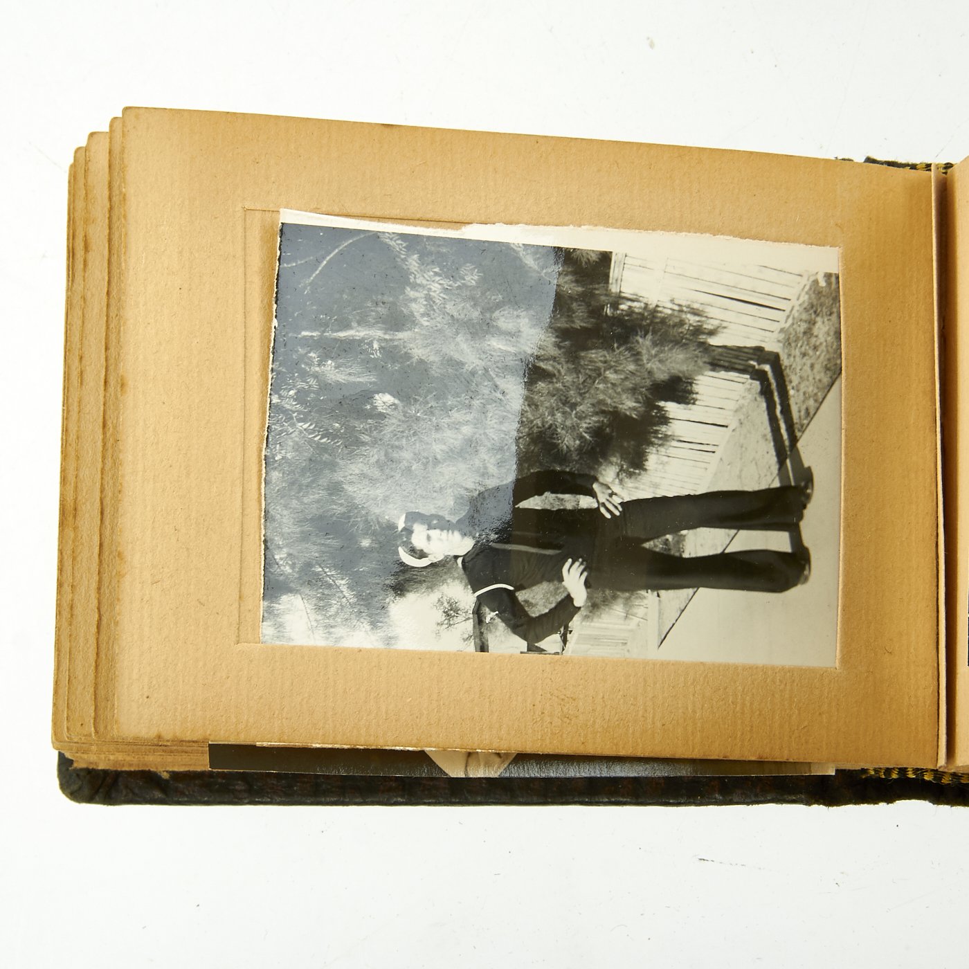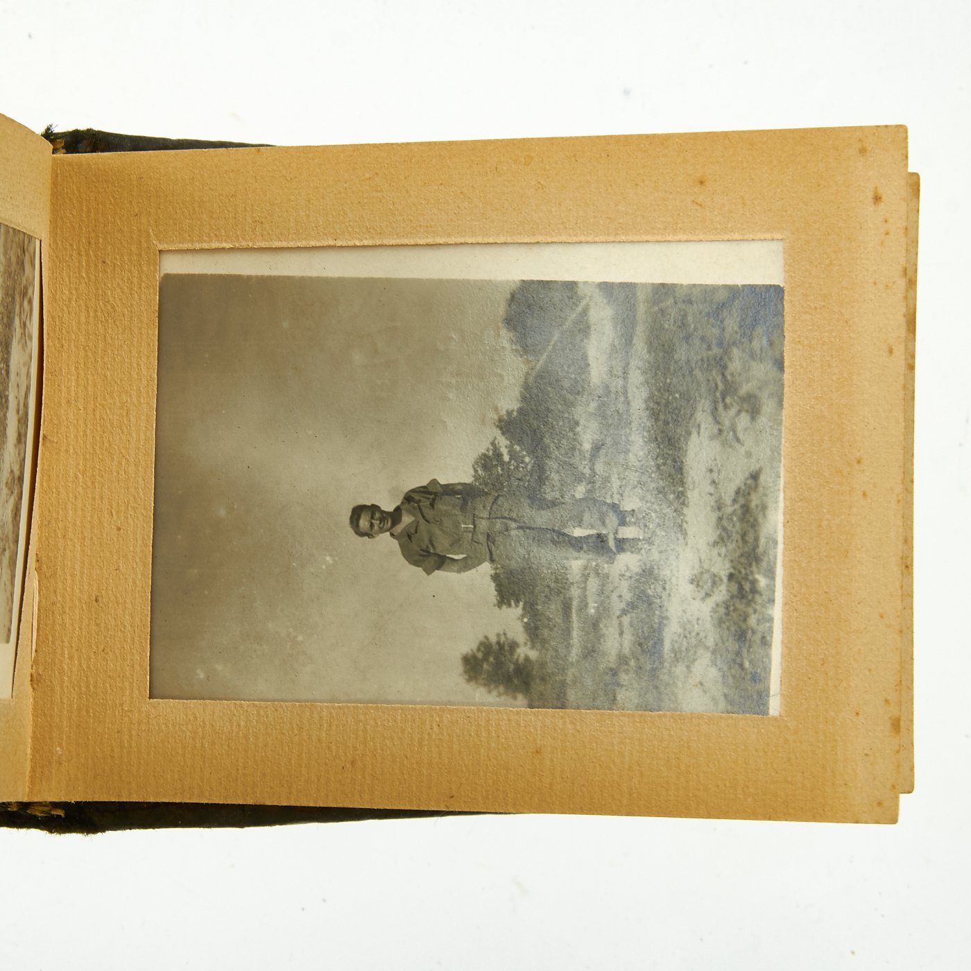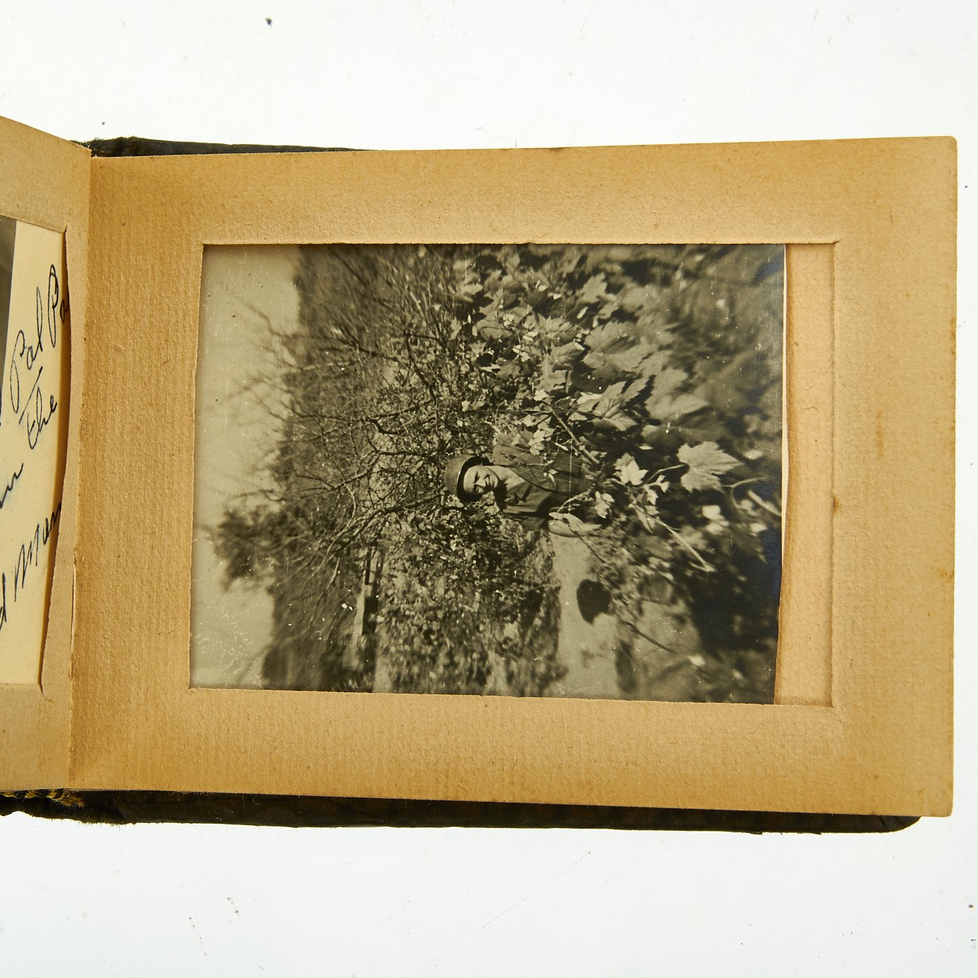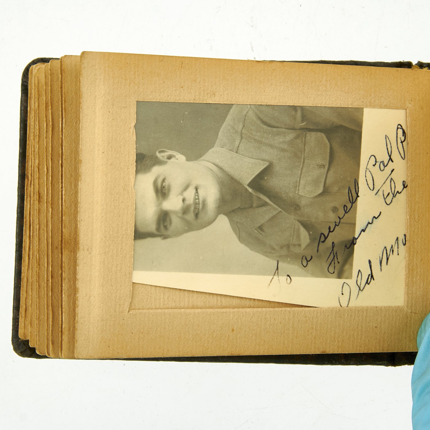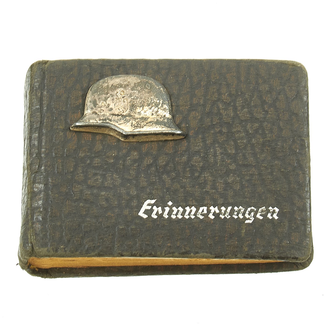 The top of the page is torn away so we are not able to identify the American soldier. The outside cover of the album features a silver helmet badge and a badge that reads egserinnerungen (Memories). Inside there are dozens of small photos of an American infantryman with his fellow soldiers, some that appear to be taken on the grounds of the camp with a tall fence in the background. Features 55 photos all in good condition.