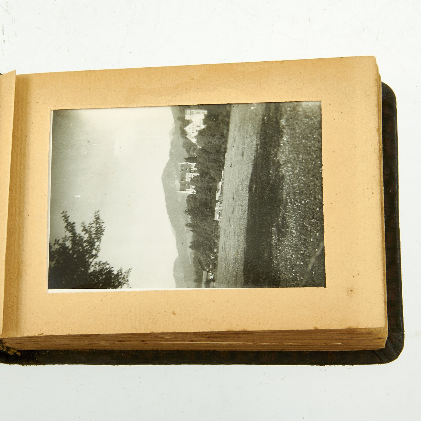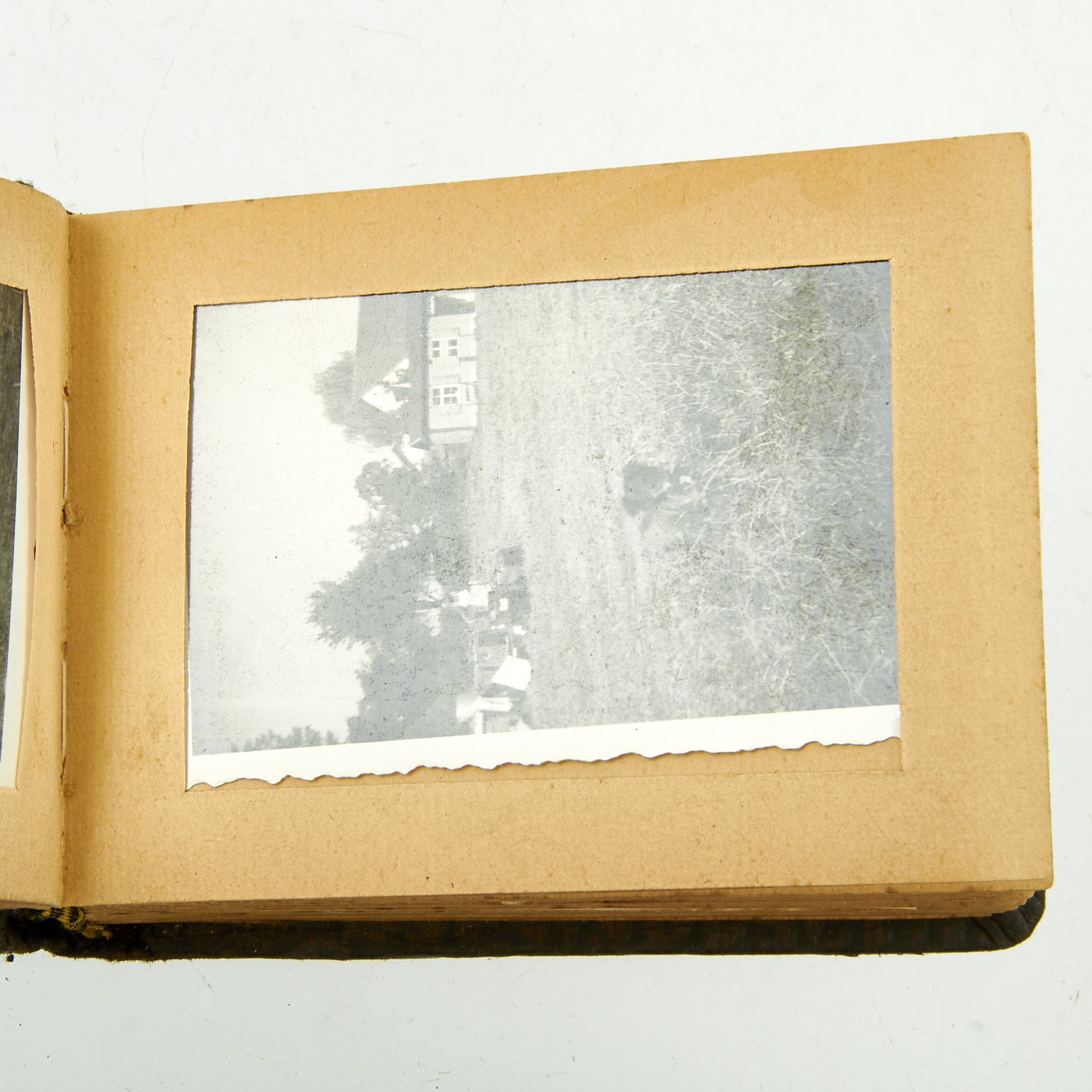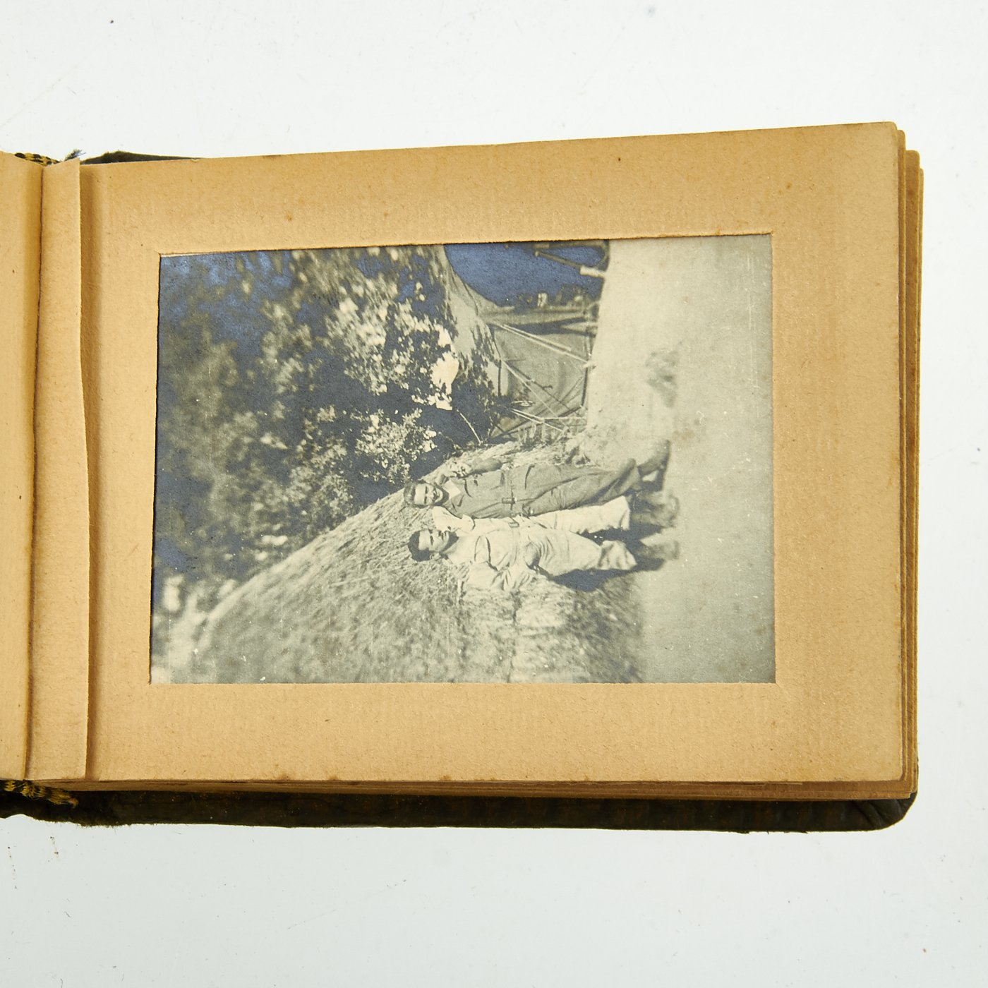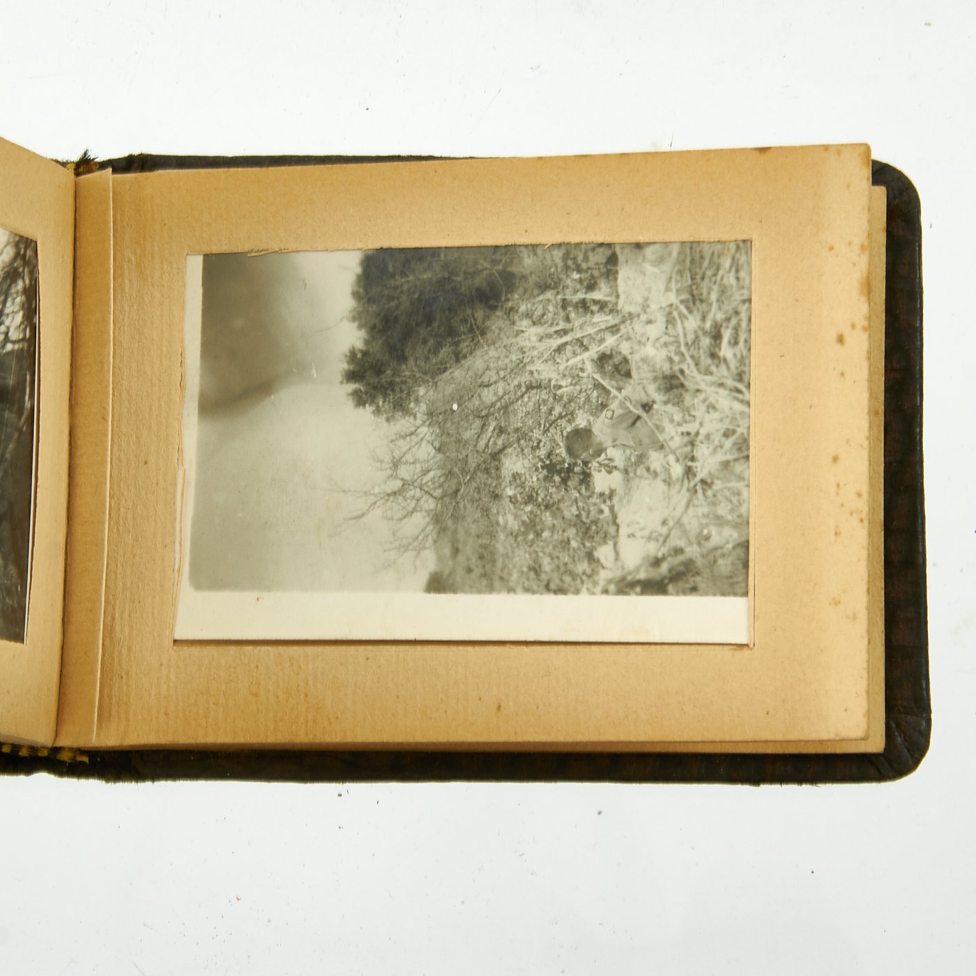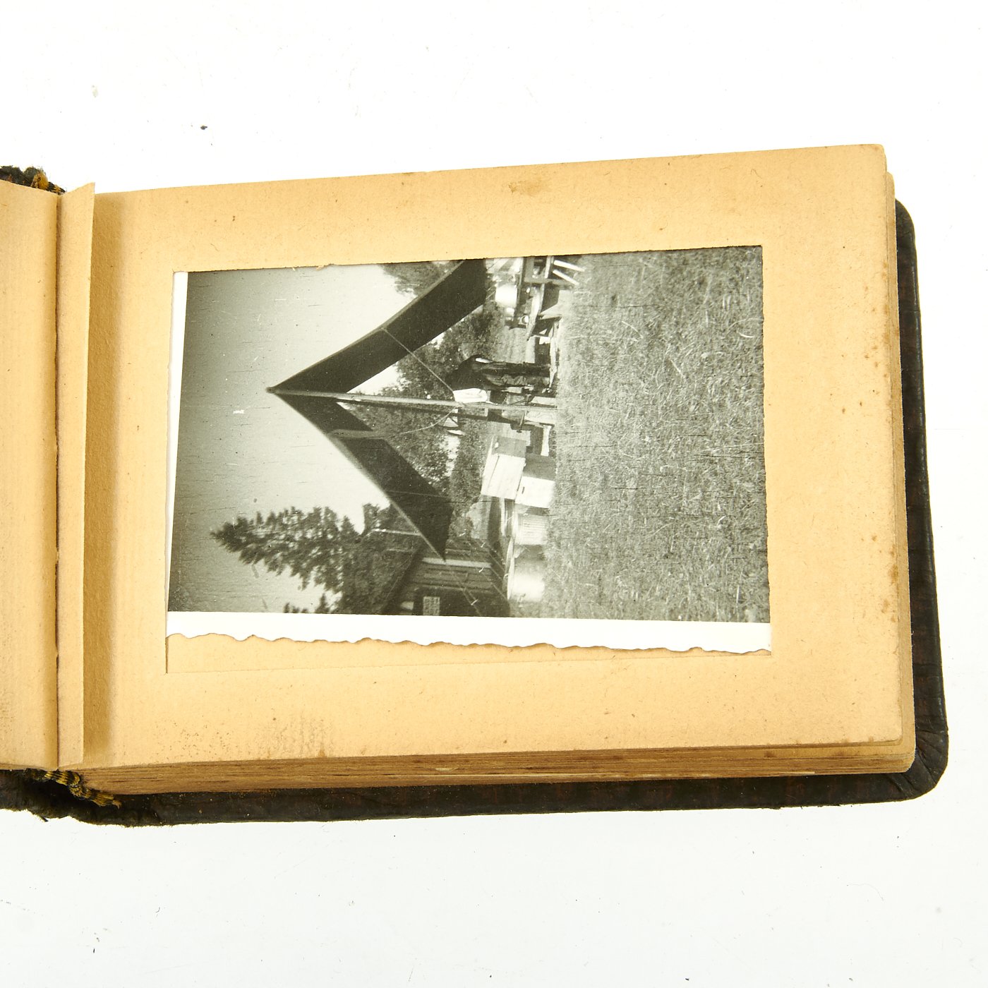 The top of the page is torn away so we are not able to identify the American soldier. The outside cover of the album features a silver helmet badge and a badge that reads egserinnerungen (Memories). Inside there are dozens of small photos of an American infantryman with his fellow soldiers, some that appear to be taken on the grounds of the camp with a tall fence in the background. Features 55 photos all in good condition.