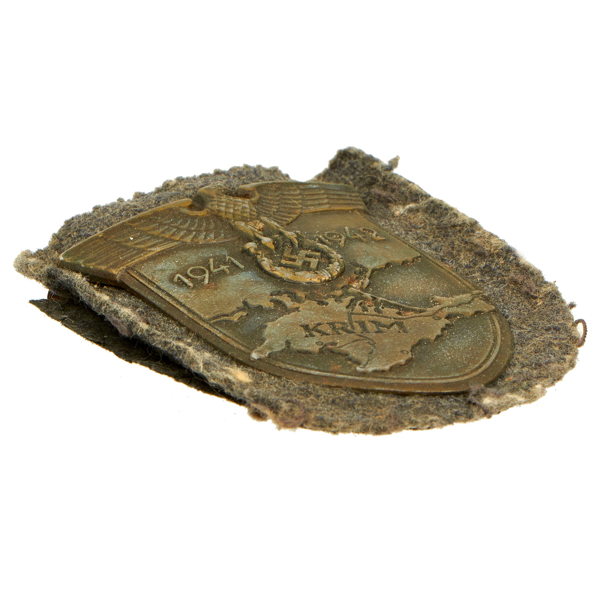 The shield is headed by the German eagle clutching a laurel wreath surrounding a swas. Flanking the eagle are the dates 1941 and 1942, which represent the start and end dates of the campaign. This sits on the backdrop of the Crimean peninsula, where the fighting took place, which has the word KRIM stamped across it.