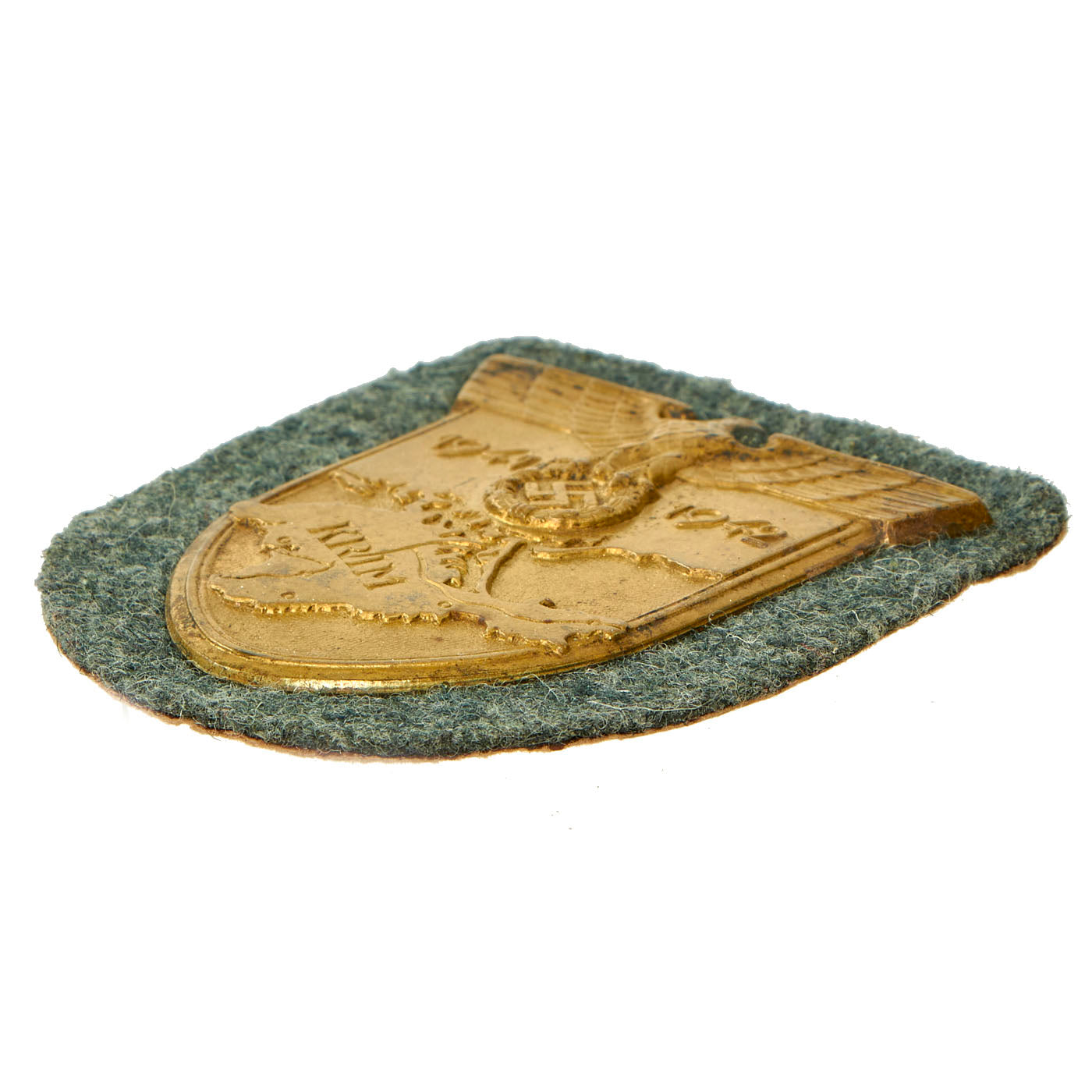 The shield is headed by the German eagle clutching a laurel wreath surrounding a swas. Flanking the eagle are the dates 1941 and 1942, which represent the start and end dates of the campaign. This sits on the backdrop of the Crimean peninsula, where the fighting took place, which has the word KRIM stamped across it.