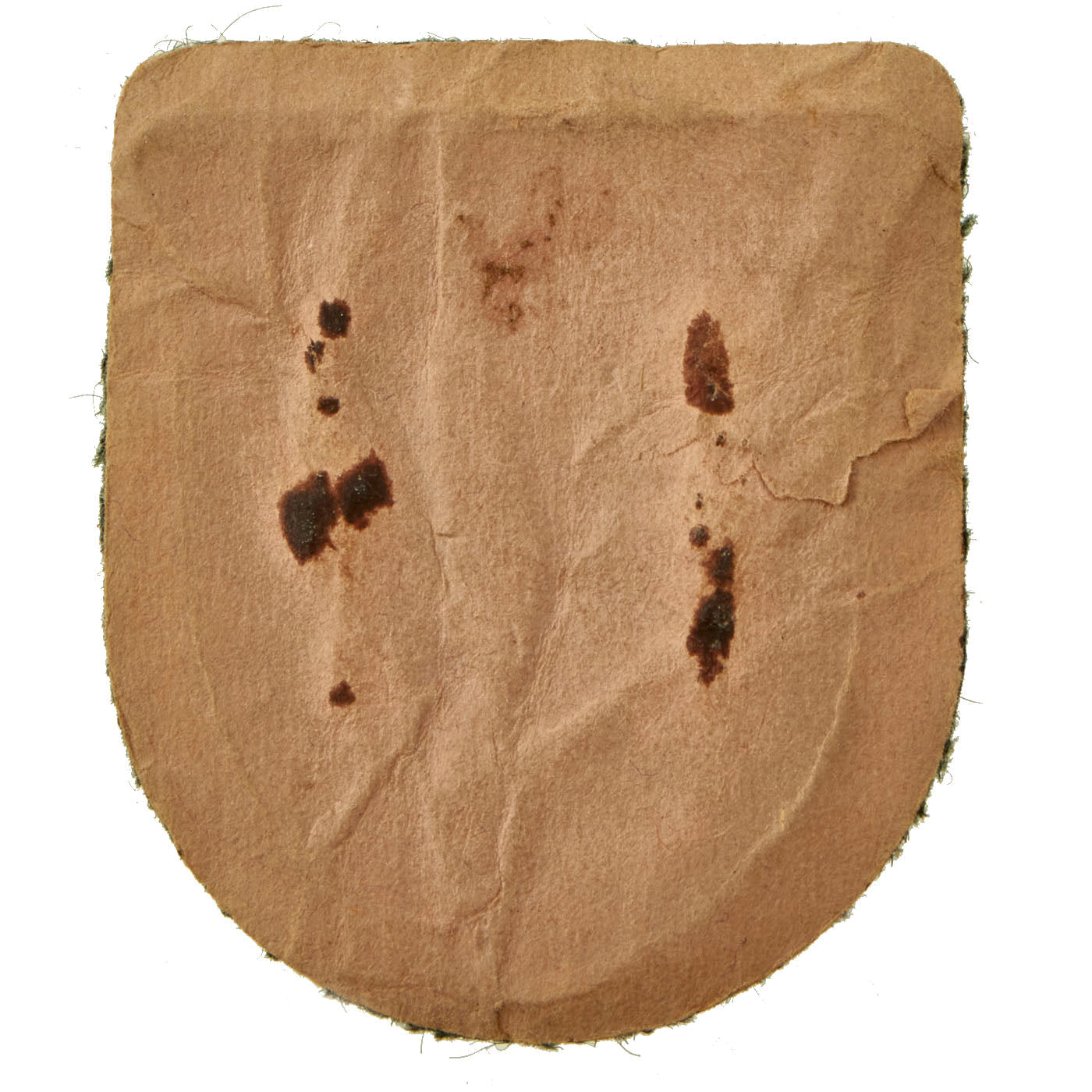 Original Item: Only One Available. This is an excellent unissued example with a lovely metal shield attached to field gray wool Heer (Army) cloth backing. The wool is in great shape, with just a bit of fading, and no mothing. The rear paper backing is about 99% complete, and has a great aged look, with some oxidation stains from the retaining clips. This example was never fitted to a uniform, and still retains the original antiqued brass finish, with just a tiny bit of oxidation near the eagle's head. Definitely one of the best examples we've had, as we rarely them with the paper backing still on top of the backing plate!
