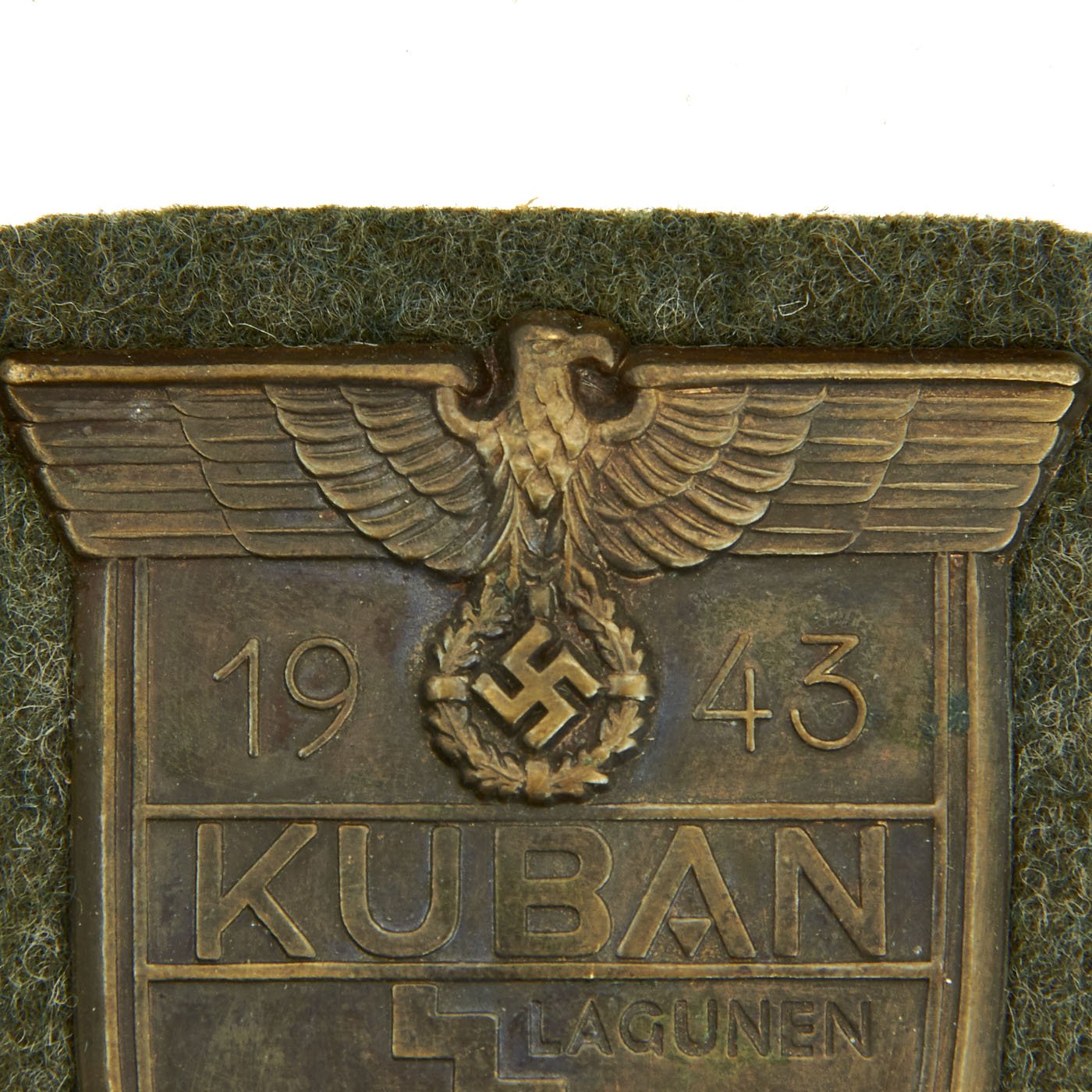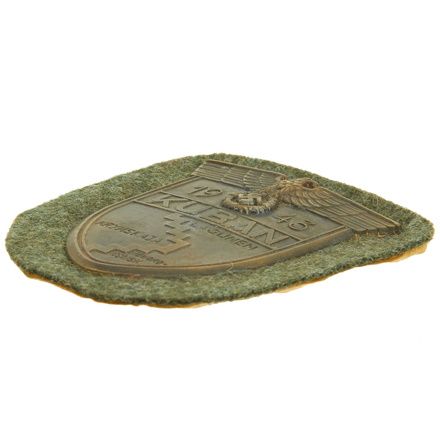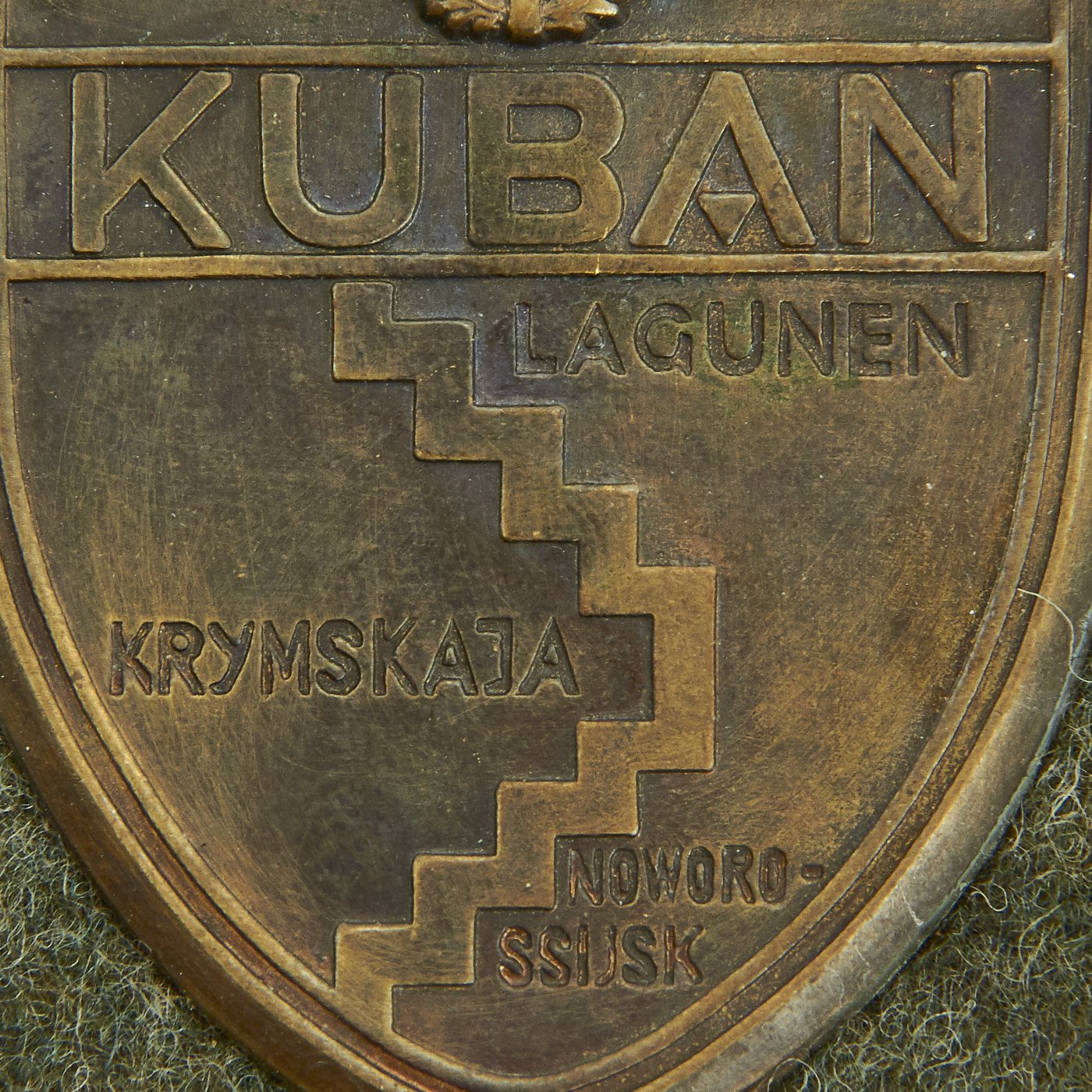 The shield is designed in a similar fashion to the Crimea Shield and was struck in sheet metal or zinc and treated with a bronzed wash. It features a German eagle with outstretched wings clutching a laurel wreath with a swas. On each side the wreath are the numbers 19 and 43. Directly below the eagle is written KUBAN in block capital letters. Below this name is a stylized map of the Kuban region, with a line representing the defensive line that the men fought to preserve with the location of the bridgeheads - KRYMSKAJA, LAGUNEN, and NOWOROSSIJSK.