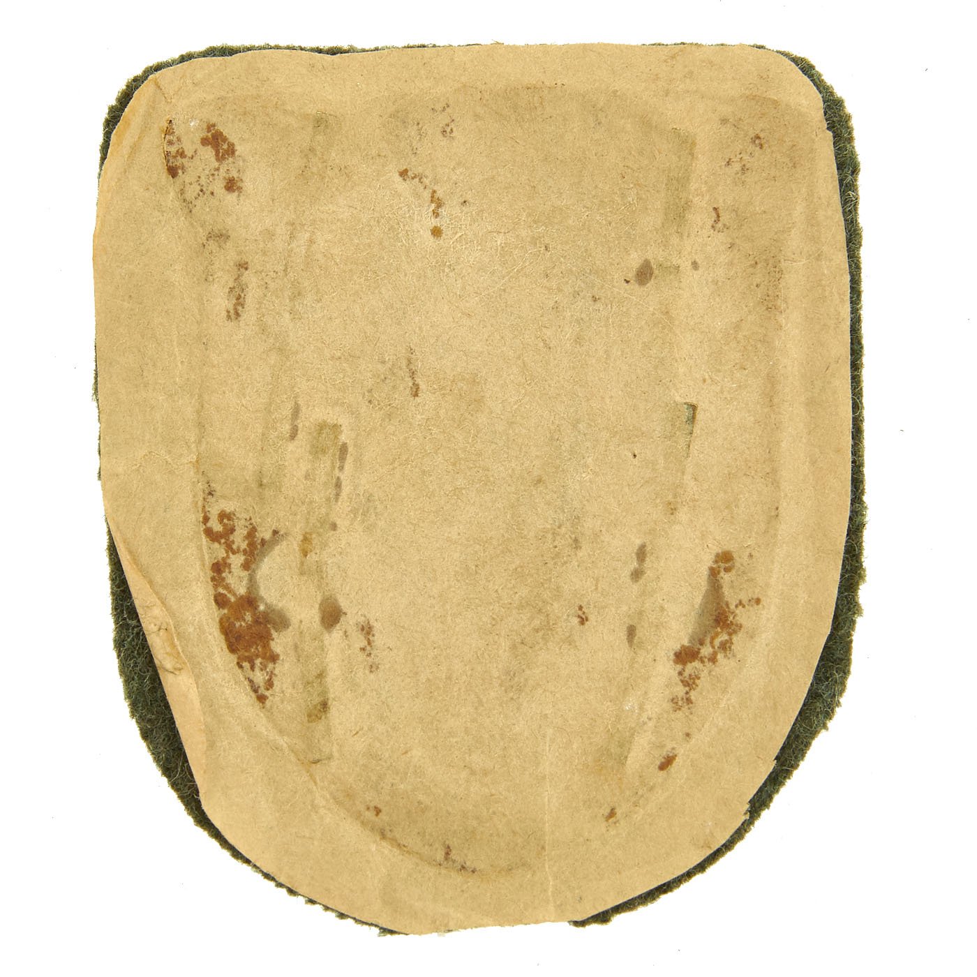 Original Item: Only One Available. This is an excellent unissued example of German WWII Kuban Bridgehead Shield, with a metal shield attached to field gray wool Heer (Army) cloth backing. The wool is in great shape, with just a bit of fading, and no mothing. The rear paper backing is complete with no tears, and has a great aged look. The front has a great aged brass patina. This example was definitely never mounted to a uniform before being put into storage.