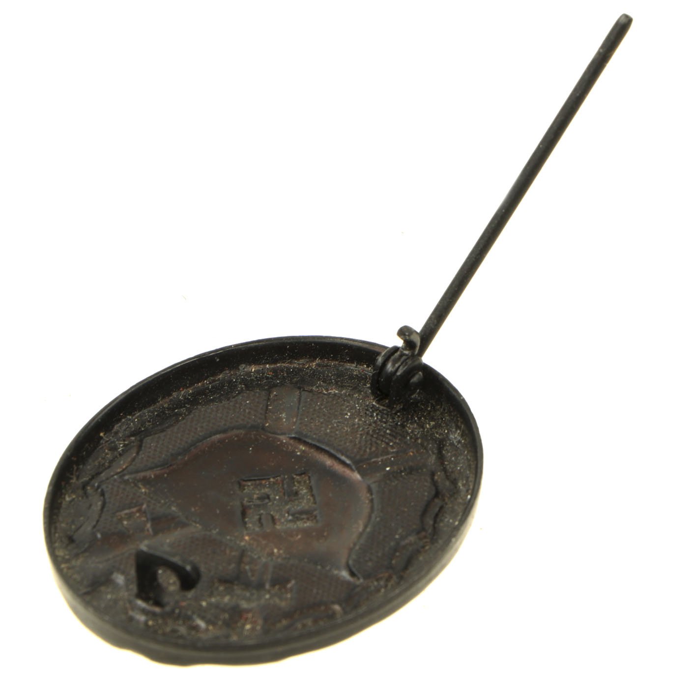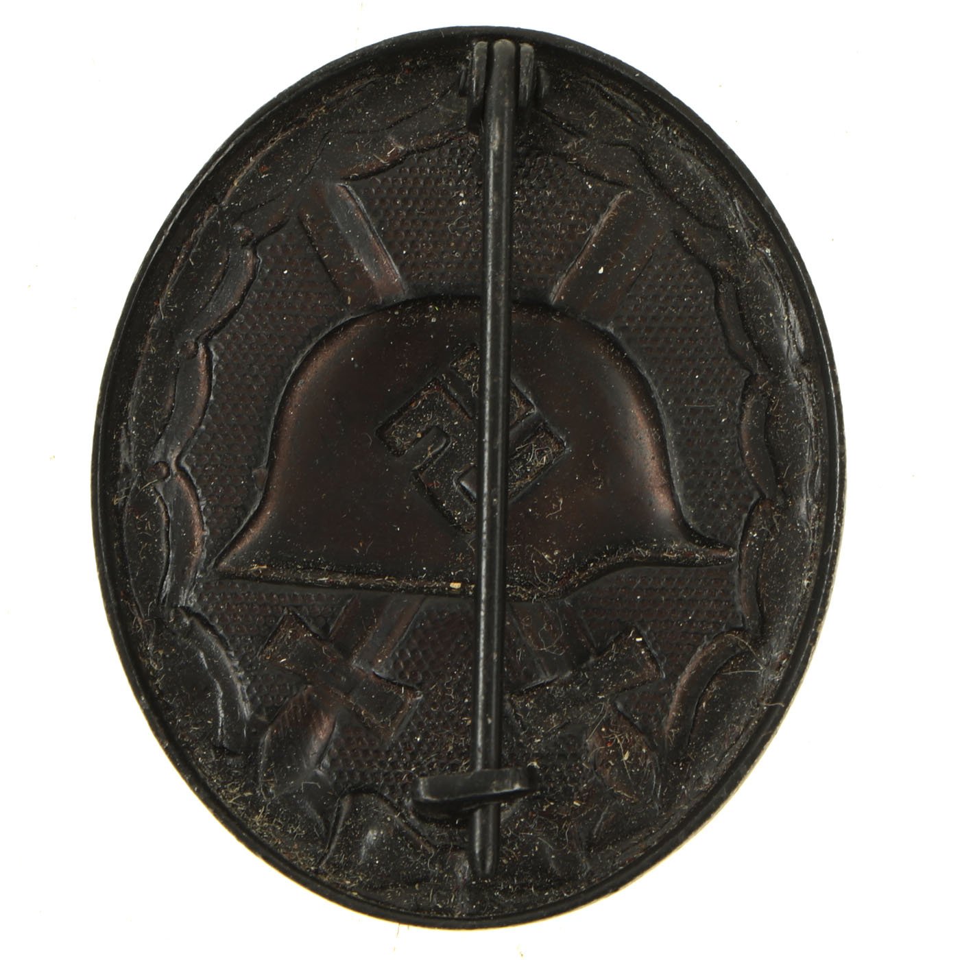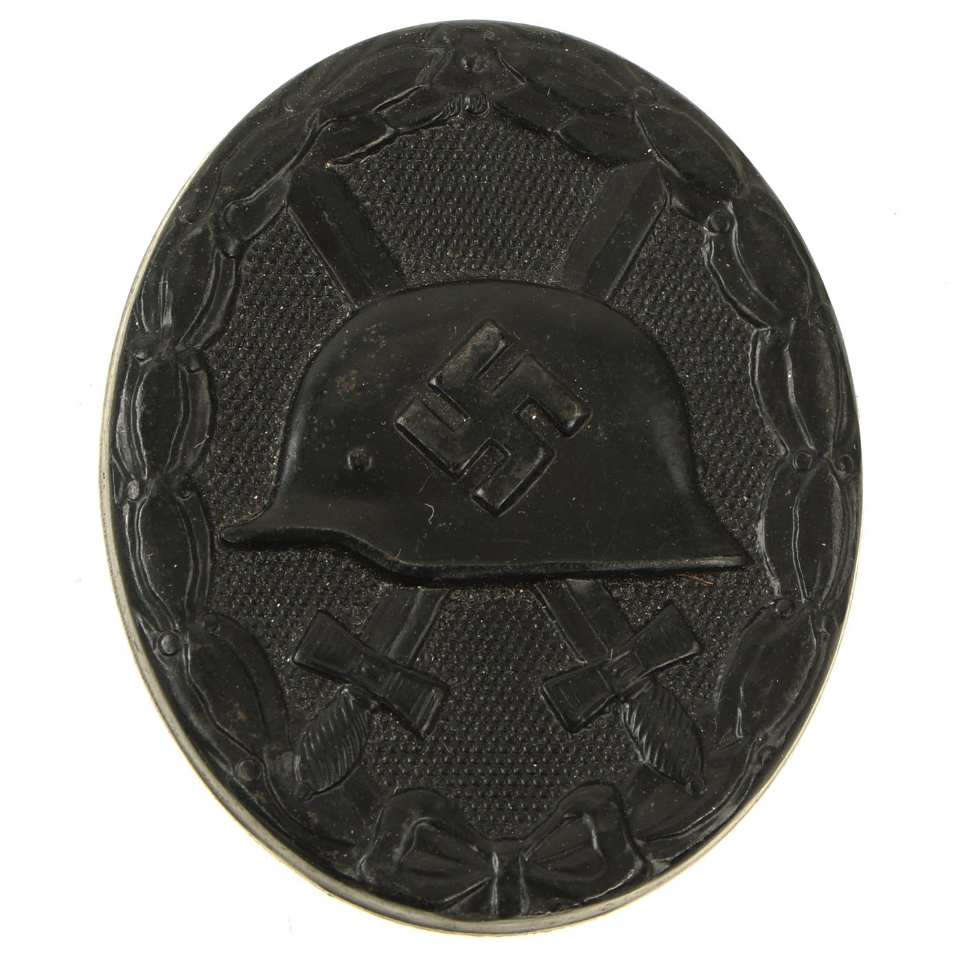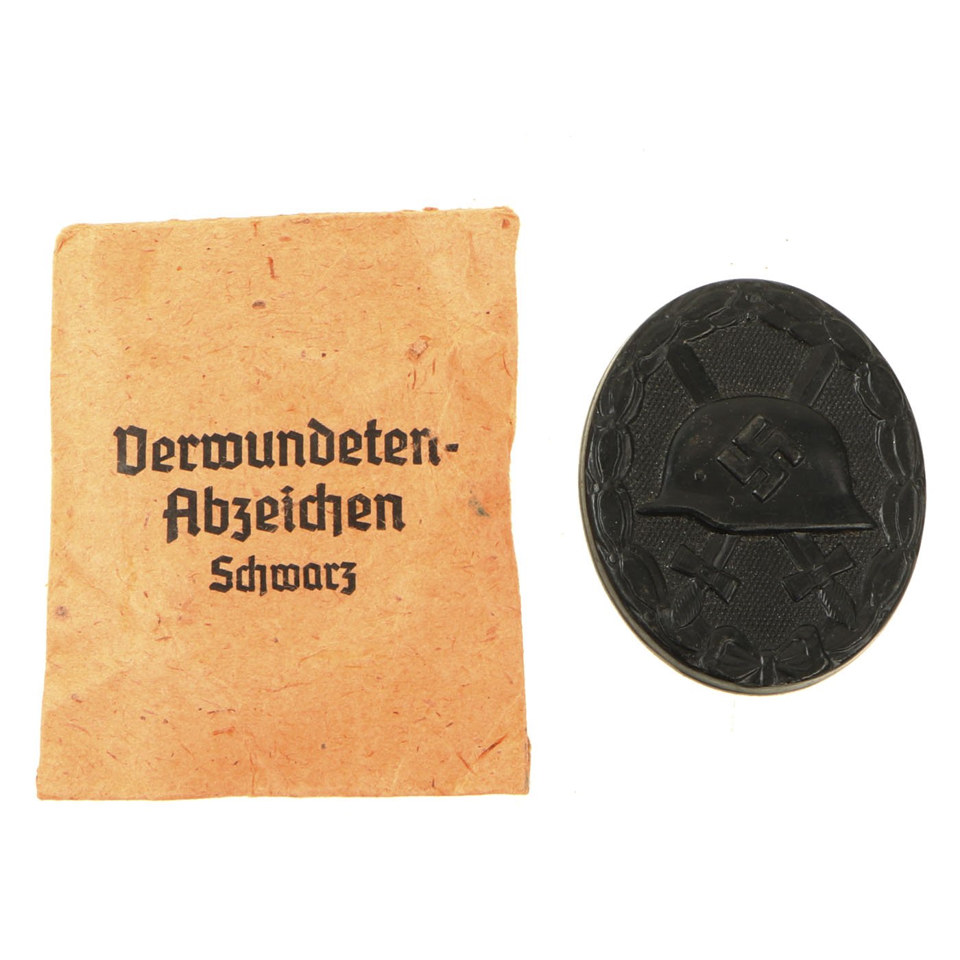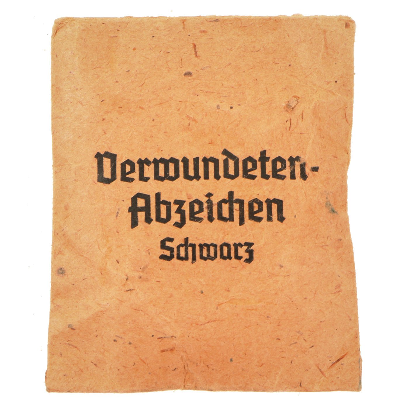 Original Item: Only One Available. This is a very nice unissued hollow back black wound badge by Carl Wild of Hamburg, complete with its original maker marked packet. The badge itself is constructed out of a stamped steel alloy that has been blackened. The oval badge depicts an embossed profile of a mobile swas, above an M35 pattern helmet, which is above two crossed broad swords. This then lies on a pebbled field and is surrounded by a laurel leaf and berry wreath which is tied together at the bottom with a bow tie.