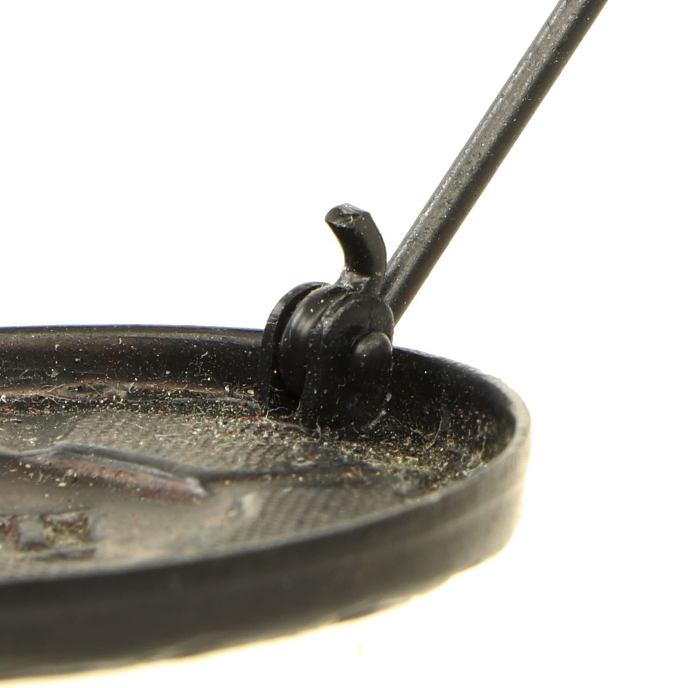 The reverse is unmarked, as was common on hollow back badges. The pin, hinge and catch are all intact and in well-working condition. The blackened finish on this example is almost 100%, with just some light age wear. Over time, these badges often lose their finish, but that has not happened with example, carefully stored for decades in the packet. The badge measures 1.75 inches high by 1.5 inches wide. Overall this is an very good example.