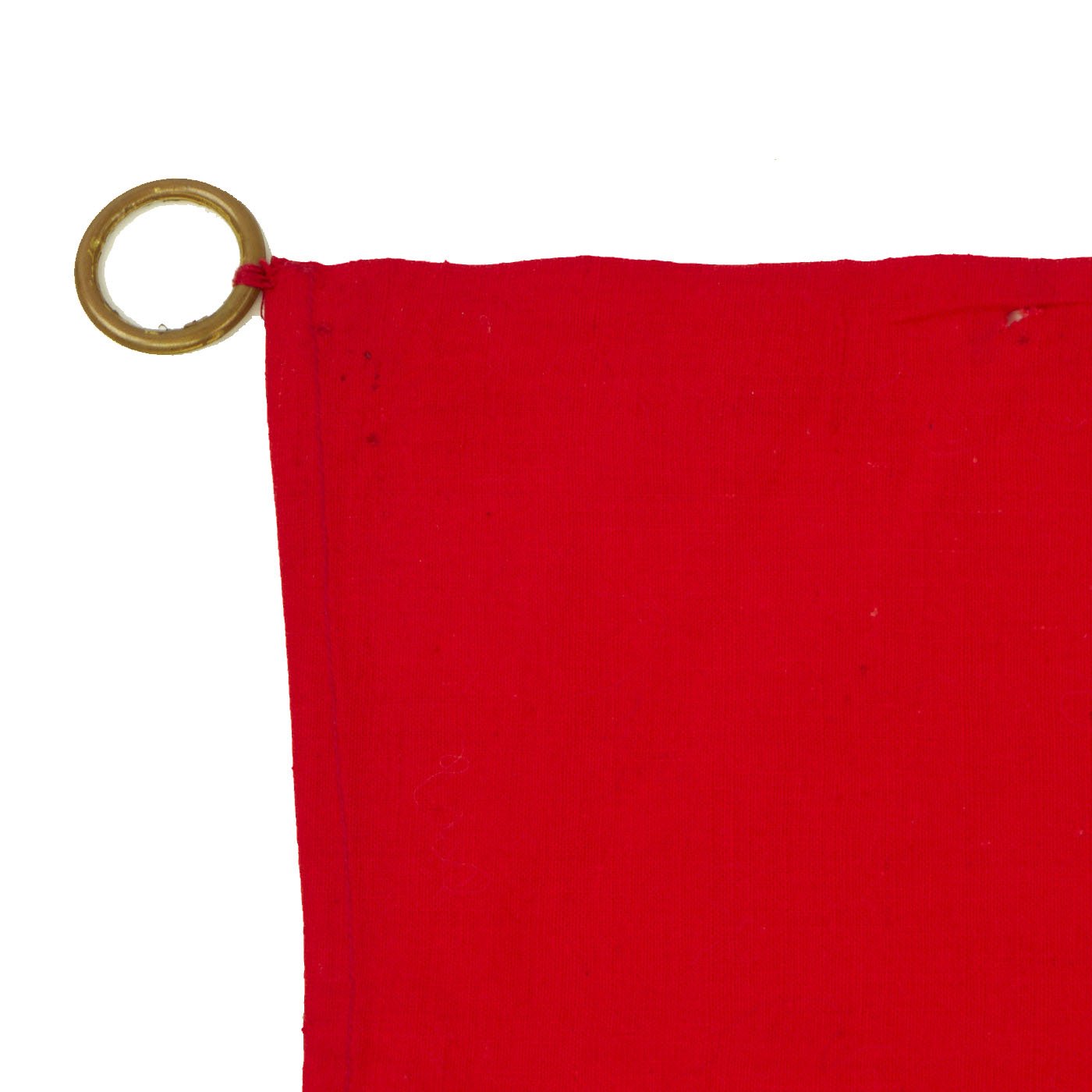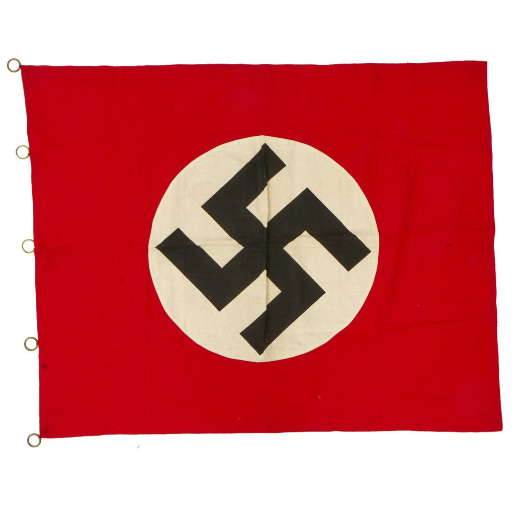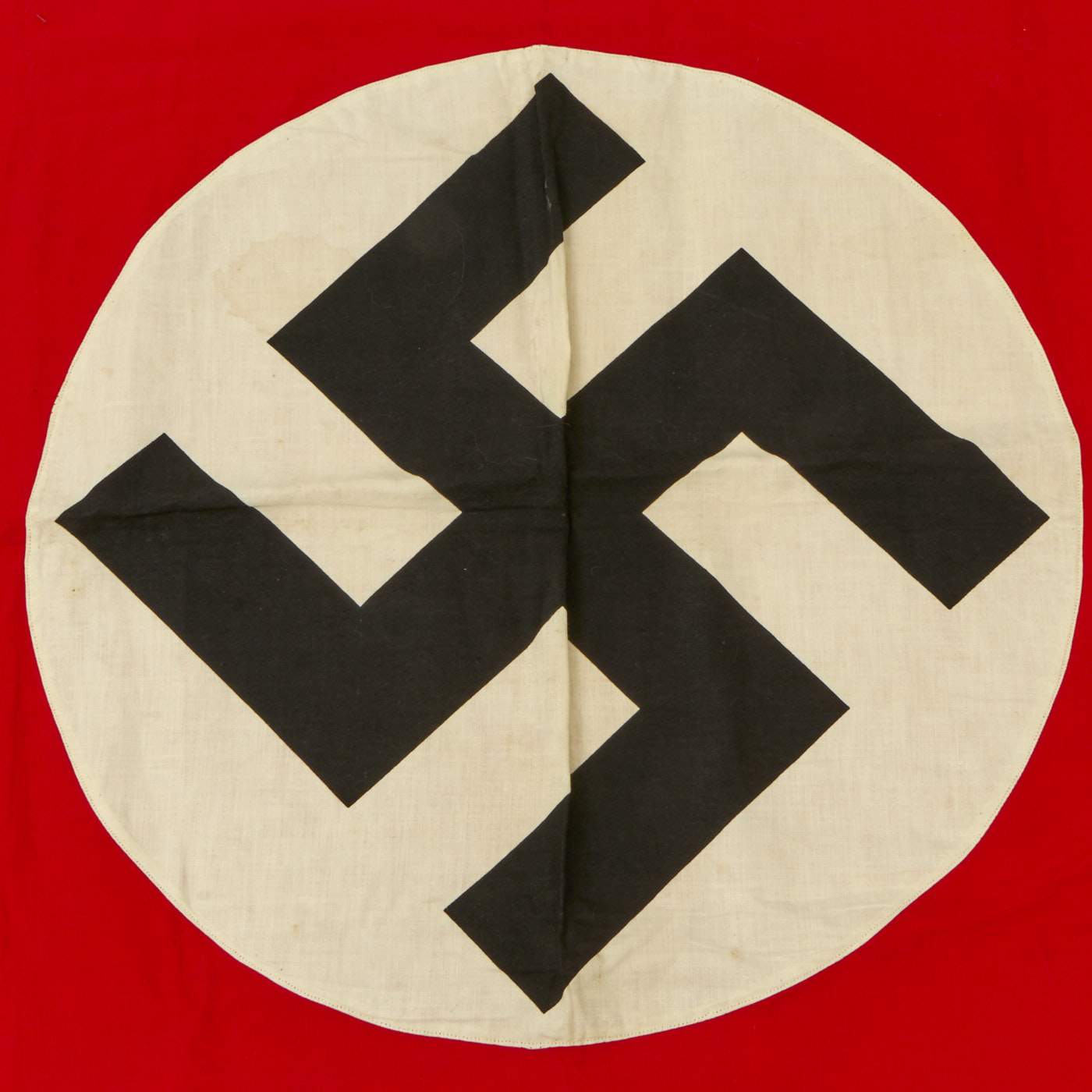 Original Item: Only One Available. This is a very nice WWII German National Socialist Political Flag or Banner, which measures a very displayable 30 by 36 inches. These could be hung vertically or horizontally, and were displayed on buildings, on podiums during speeches, or sometimes even hung up at camps. It looks to be of all cotton construction, and is single sided with a single piece cotton white circle with a dyed black Swas (Hook Cross) on ;one side. It has 5 brass hanger rings attached to one end, so it looks like it was made to hang vertically from that end.