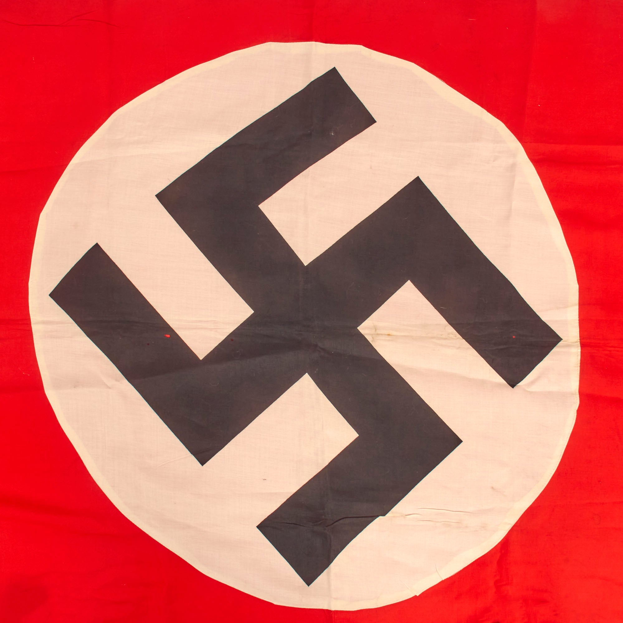 Original Item: Only One Available. This is an excellent unissued condition multi-piece construction German WWII Swas (hook cross) identification flag used for Panzer tanks and other vehicles. It measures approximately 37 x 74 inches and has the standard NSDAP Swas (Hook Cross) dyed onto a circular white field. This was then sewn onto the red cotton body of the flag. It shows no evidence of having been issued in the field, and shows just a bit of light staining from storage in areas. It is really in fantastic condition, and would be very hard to improve upon. The red of the flag is where most of the staining is, which is mostly black in color. There are some small manufacturing errors like the stitching including some fold over of the circle, being such a large style of flag this was common to see.