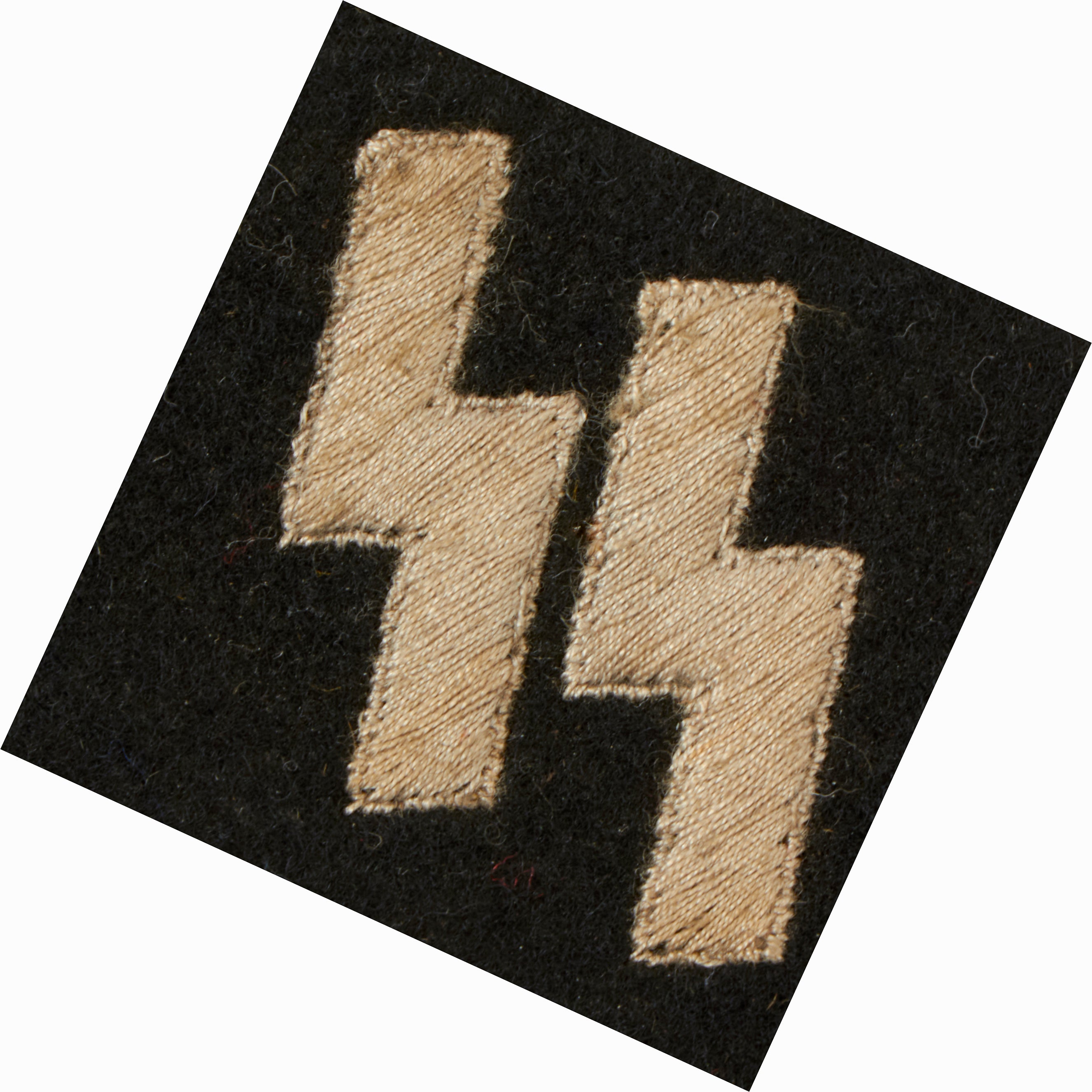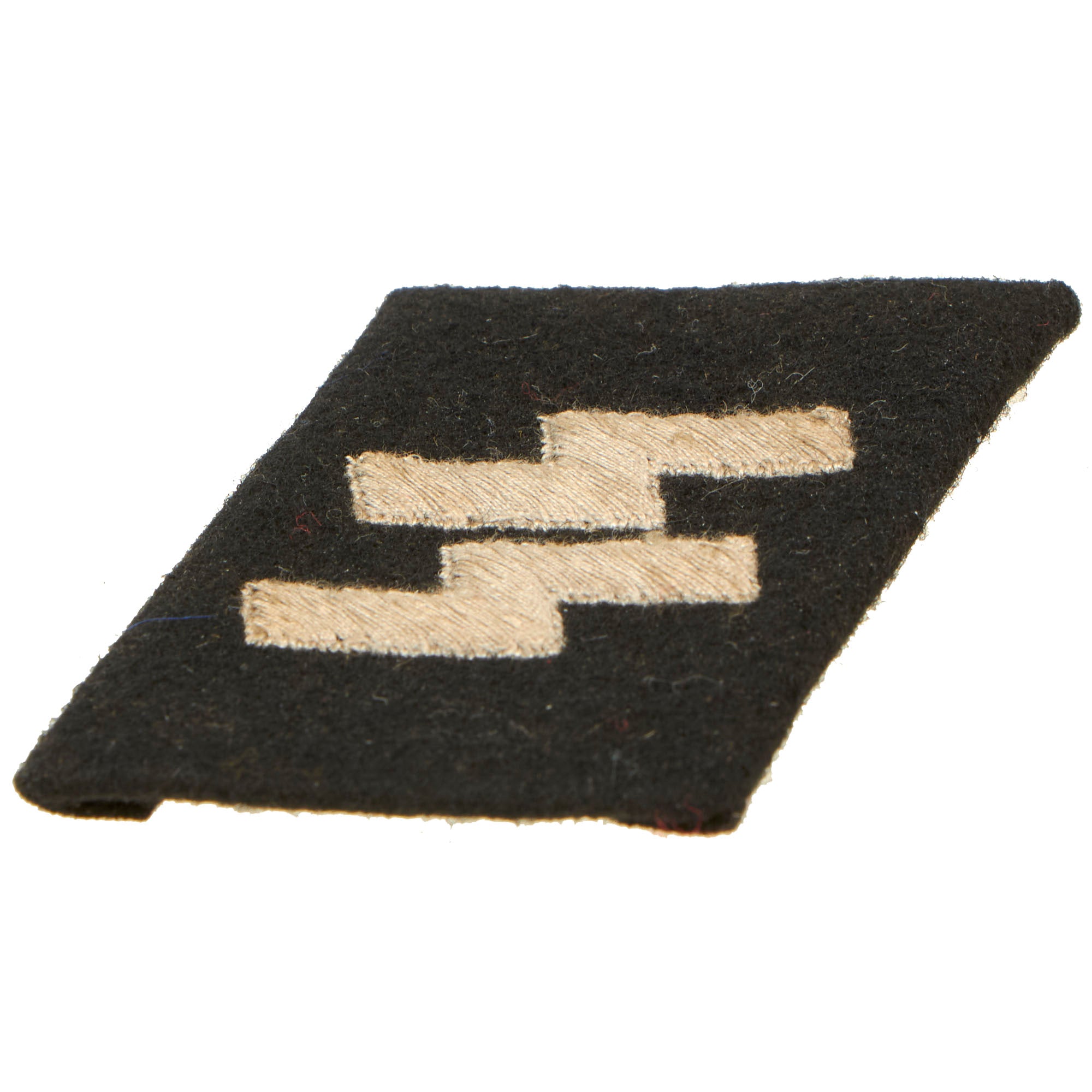 Here we have a very nice right side Collar Tab, with the standard ᛋᛋ doppelte Siegrune (Double Sig/Victory Rune) embroidered insignia. The tab measures approximately 1 1/2" x 2 1/2". Known as Kragenpatte (Collar Flap) in German, these were attached to the collars to indicate the rank and branch of the wearer. This example is made of black fabric with silver/white thread and an internal fabric stiffener. We have heard that this particular type of diamond was made at CC Camp, and many were recovered at the end of the war. There is however no concrete evidence regarding this.