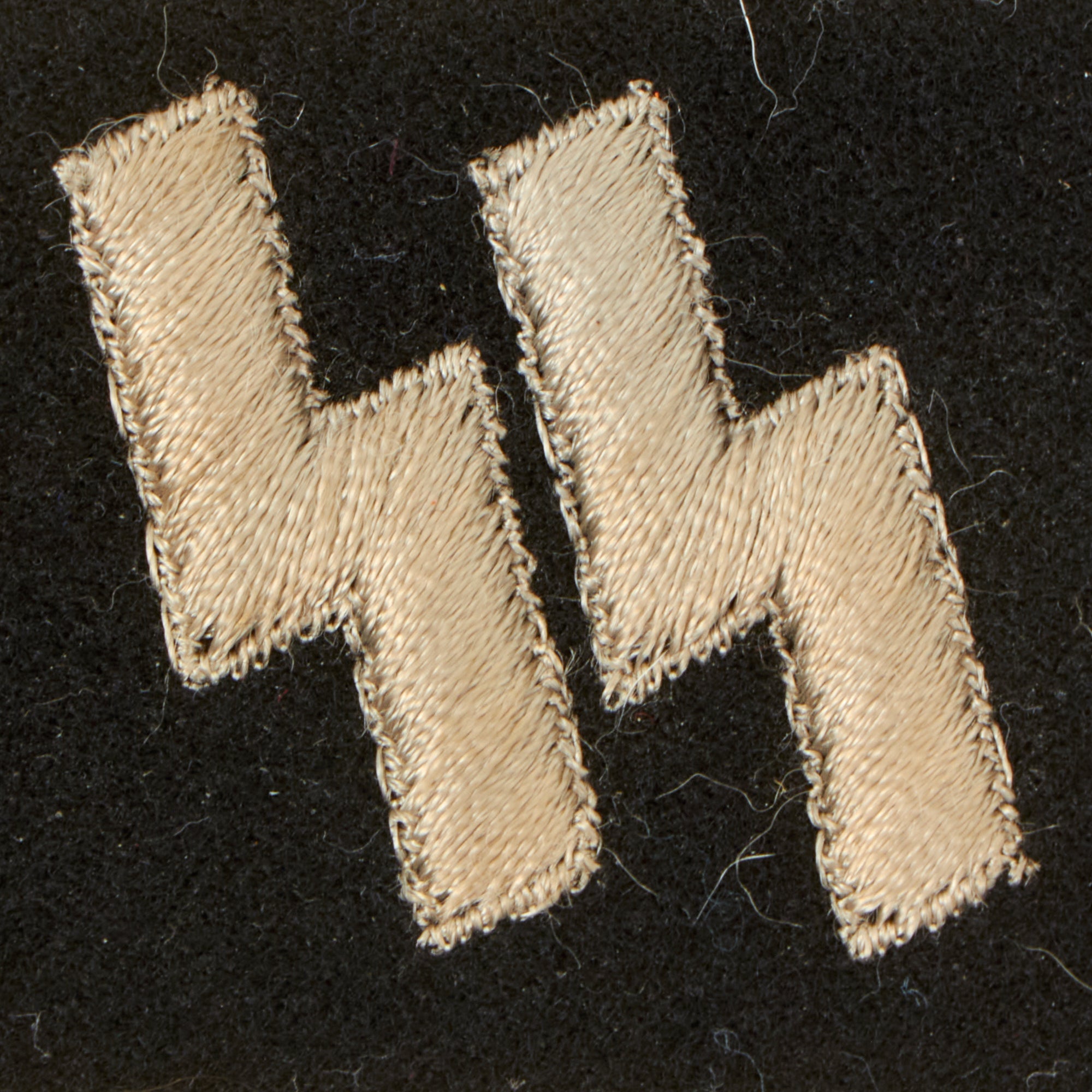 Here we have a very nice right side Collar Tab, with the standard ᛋᛋ doppelte Siegrune (Double Sig/Victory Rune) embroidered insignia. The tab measures approximately 1 1/2" x 2 1/2". Known as Kragenpatte (Collar Flap) in German, these were attached to the collars to indicate the rank and branch of the wearer. This example is made of black fabric with silver/white thread and an internal fabric stiffener. We have heard that this particular type of diamond was made at CC Camp, and many were recovered at the end of the war. There is however no concrete evidence regarding this.