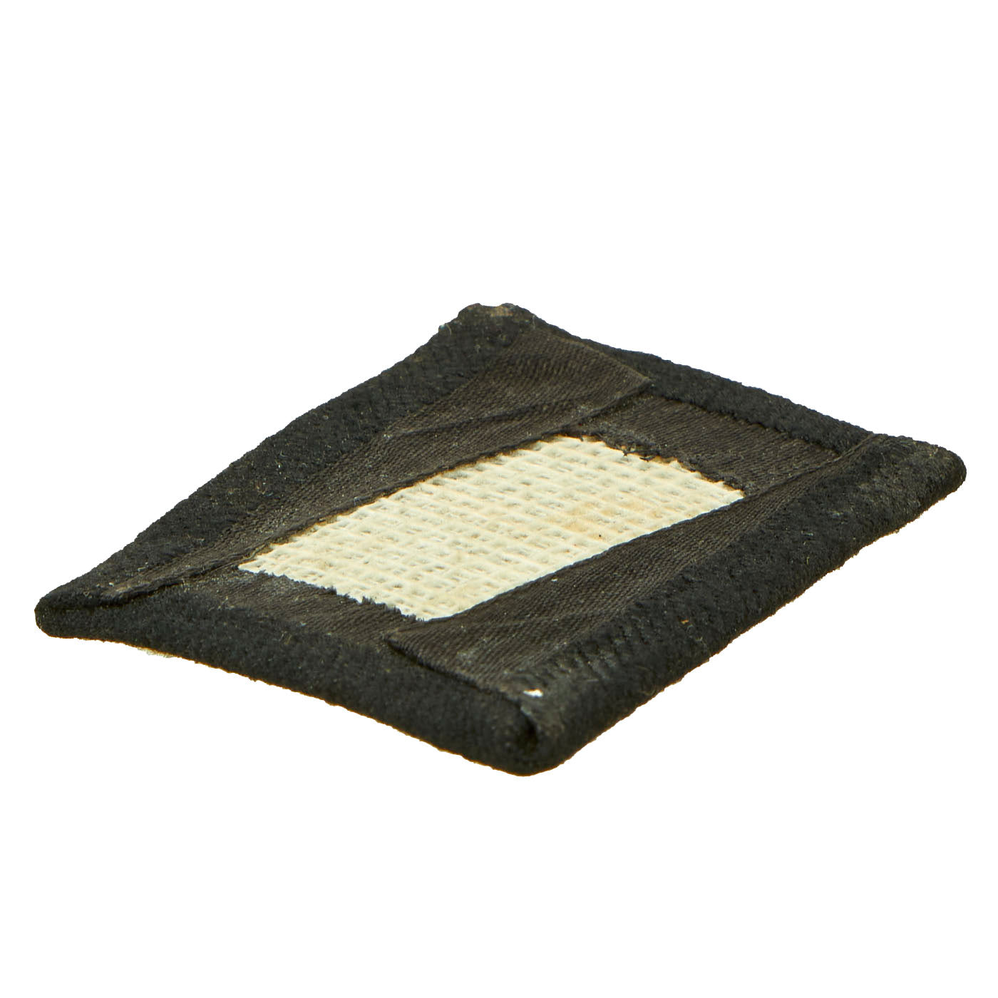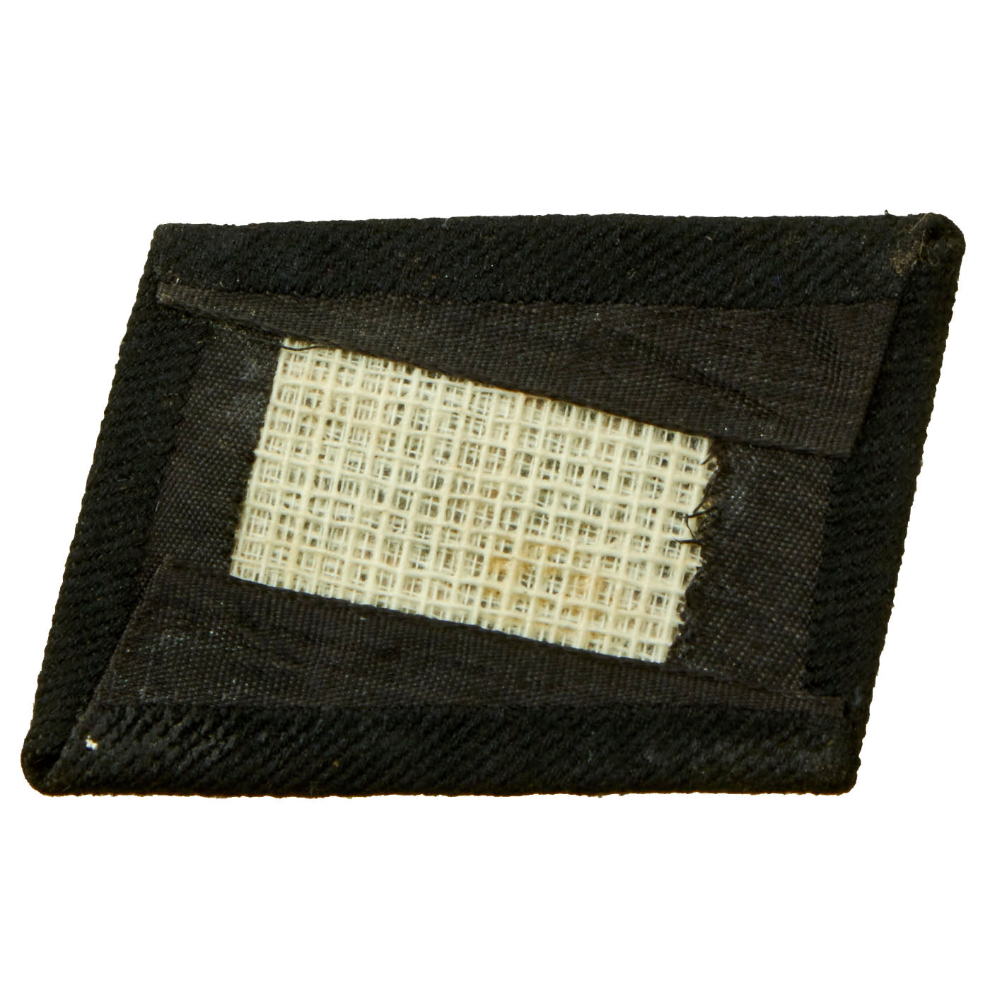 Here we have a very nice right side Collar Tab, with the standard ᛋᛋ doppelte Siegrune (Double Sig/Victory Rune) embroidered insignia. The tab measures approximately 1 1/2" x 2 1/4". Known as Kragenpatte (Collar Flap) in German, these were attached to the collars to indicate the rank and branch of the wearer. This example is made of black fabric with silver/white thread and an internal fabric stiffener. We have heard that this particular type of diamond was made at CC Camp, and many were recovered at the end of the war. There is however no concrete evidence regarding this.