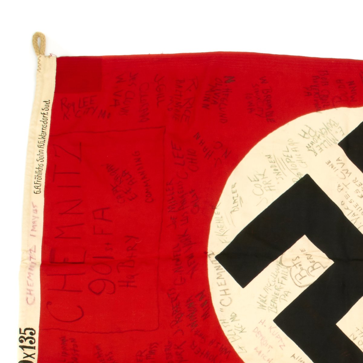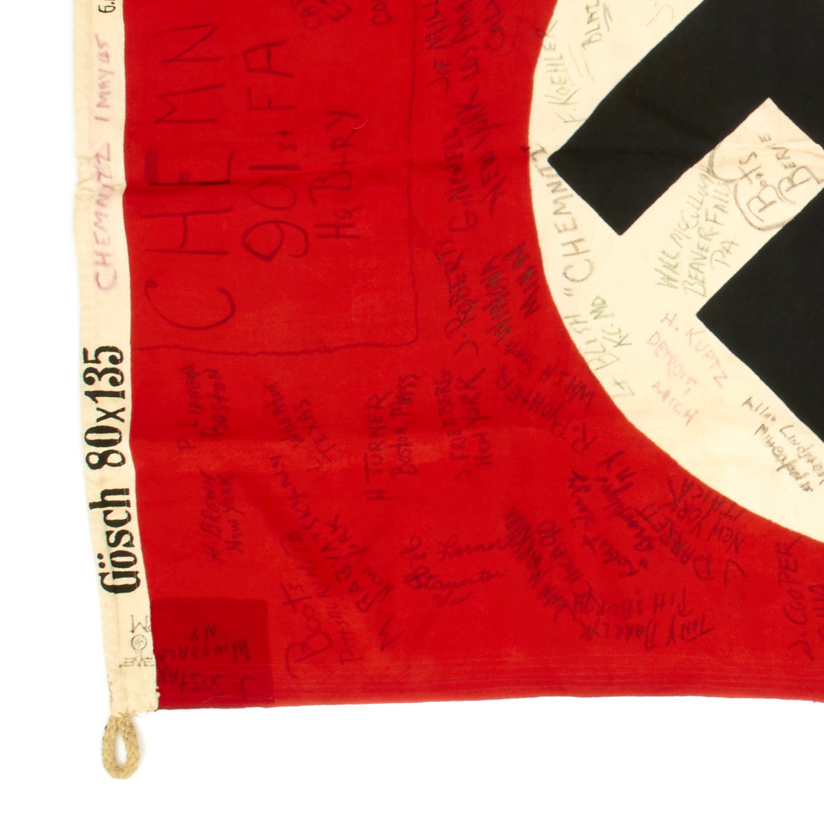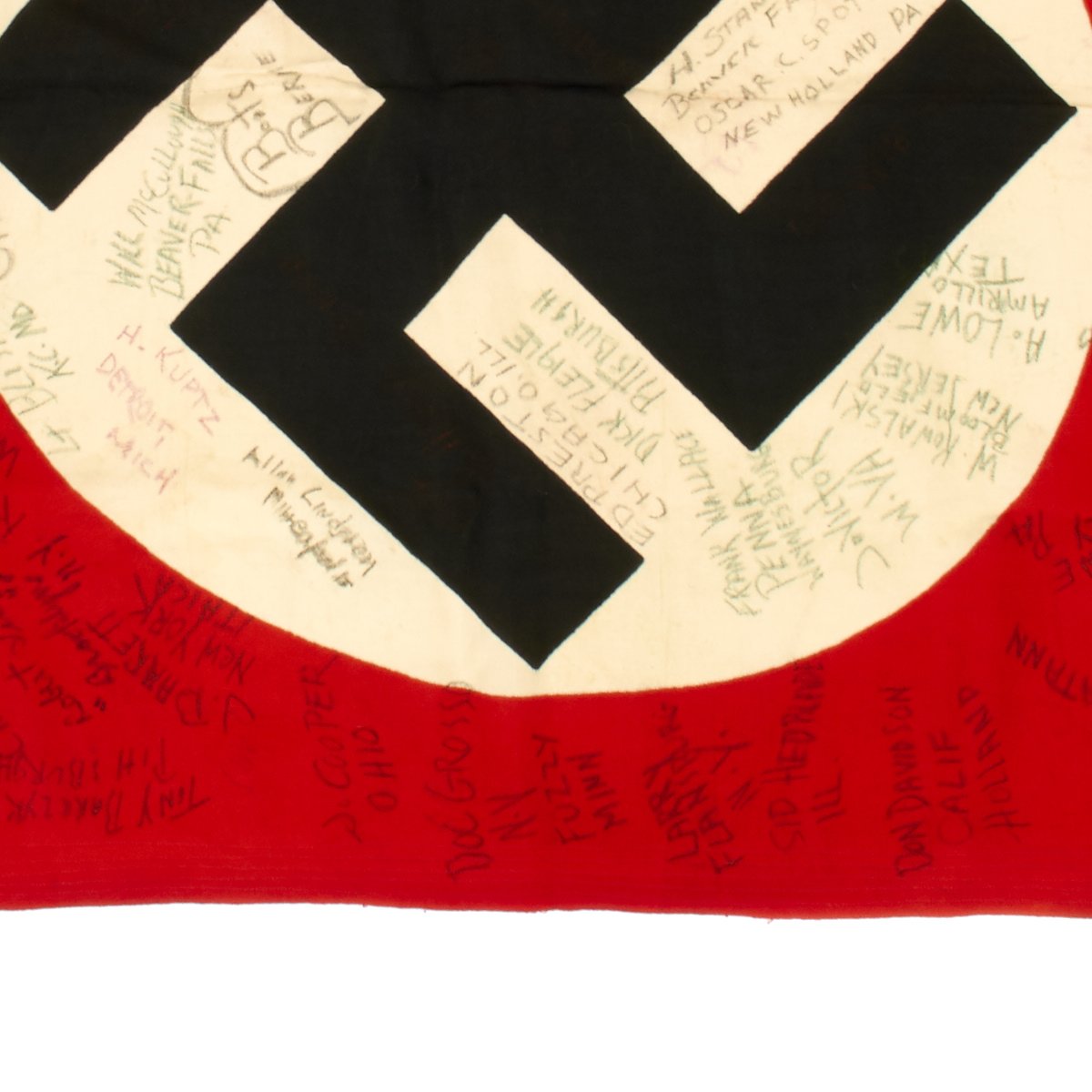 Original Item: One-of-a-kind. The 901st Field Artillery was attached to the 385th Infantry Regiment, 76th Infantry Division. On May 1st, 1945 they were in the Chemnitz, Germany (a city in the central eastern part of Germany which would later fall under Russian control and become part of East Germany). On May 1st, 1945 the war in Europe was just days away from ending and 97 members of the 901st FA captured a German flag and signed it.