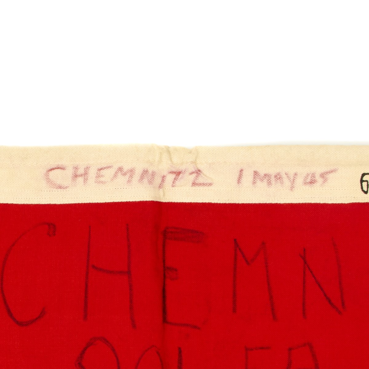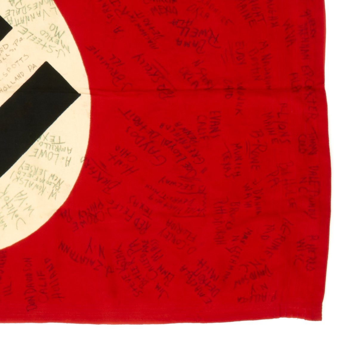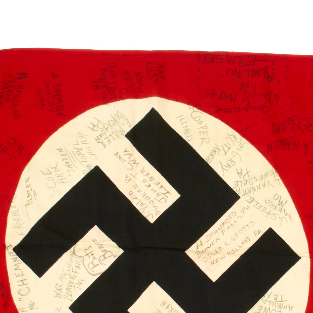 Original Item: One-of-a-kind. The 901st Field Artillery was attached to the 385th Infantry Regiment, 76th Infantry Division. On May 1st, 1945 they were in the Chemnitz, Germany (a city in the central eastern part of Germany which would later fall under Russian control and become part of East Germany). On May 1st, 1945 the war in Europe was just days away from ending and 97 members of the 901st FA captured a German flag and signed it.
