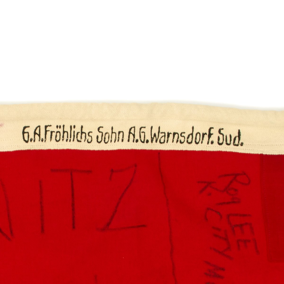 The header is also marked with the maker G.A. Fröhlichs Sohn A.G. Warnsdorf. Sud. , located in the so-called "Sudetenland" area of Czechoslovakia. Flag measures 80cm x 135cm (31.5" x 53").
