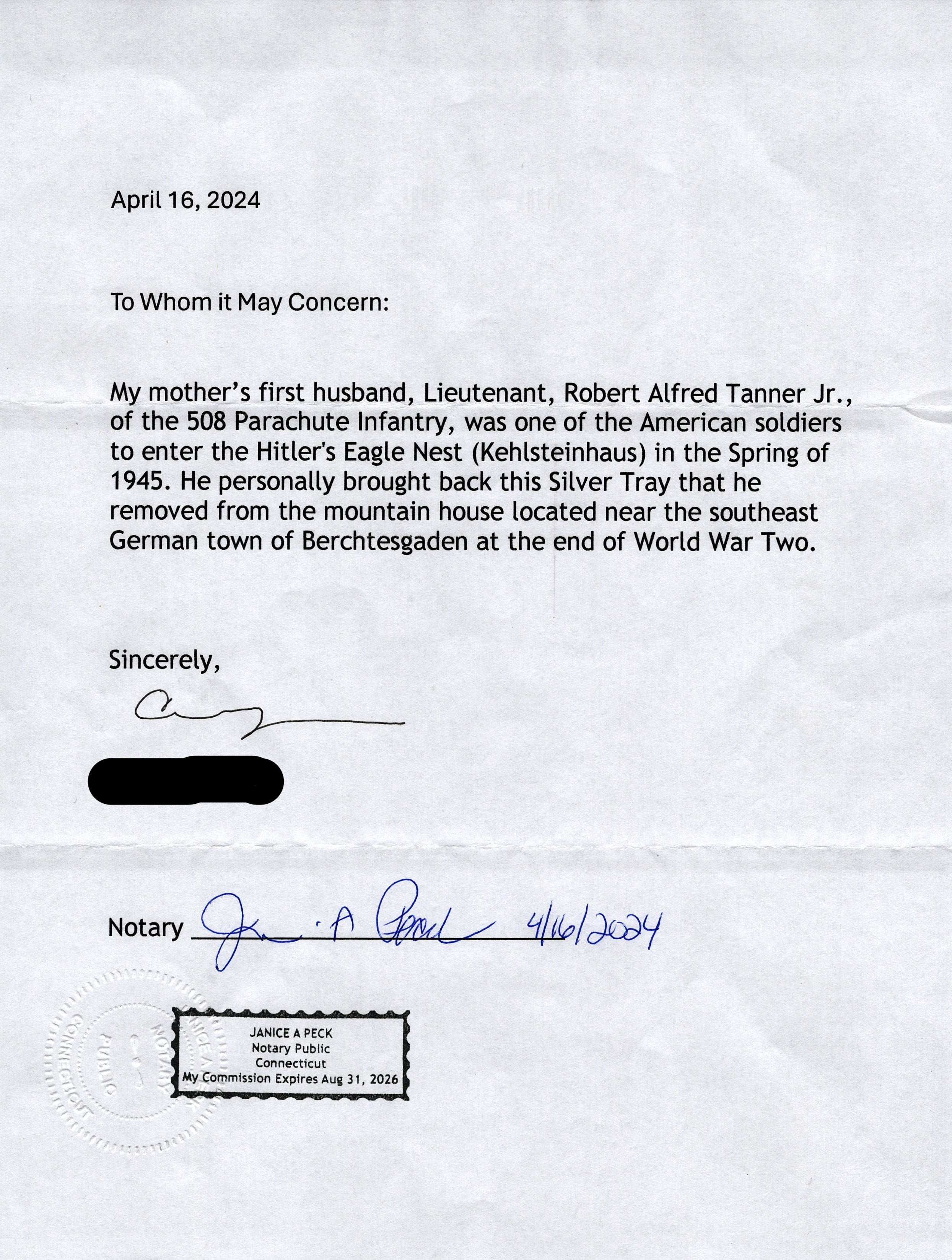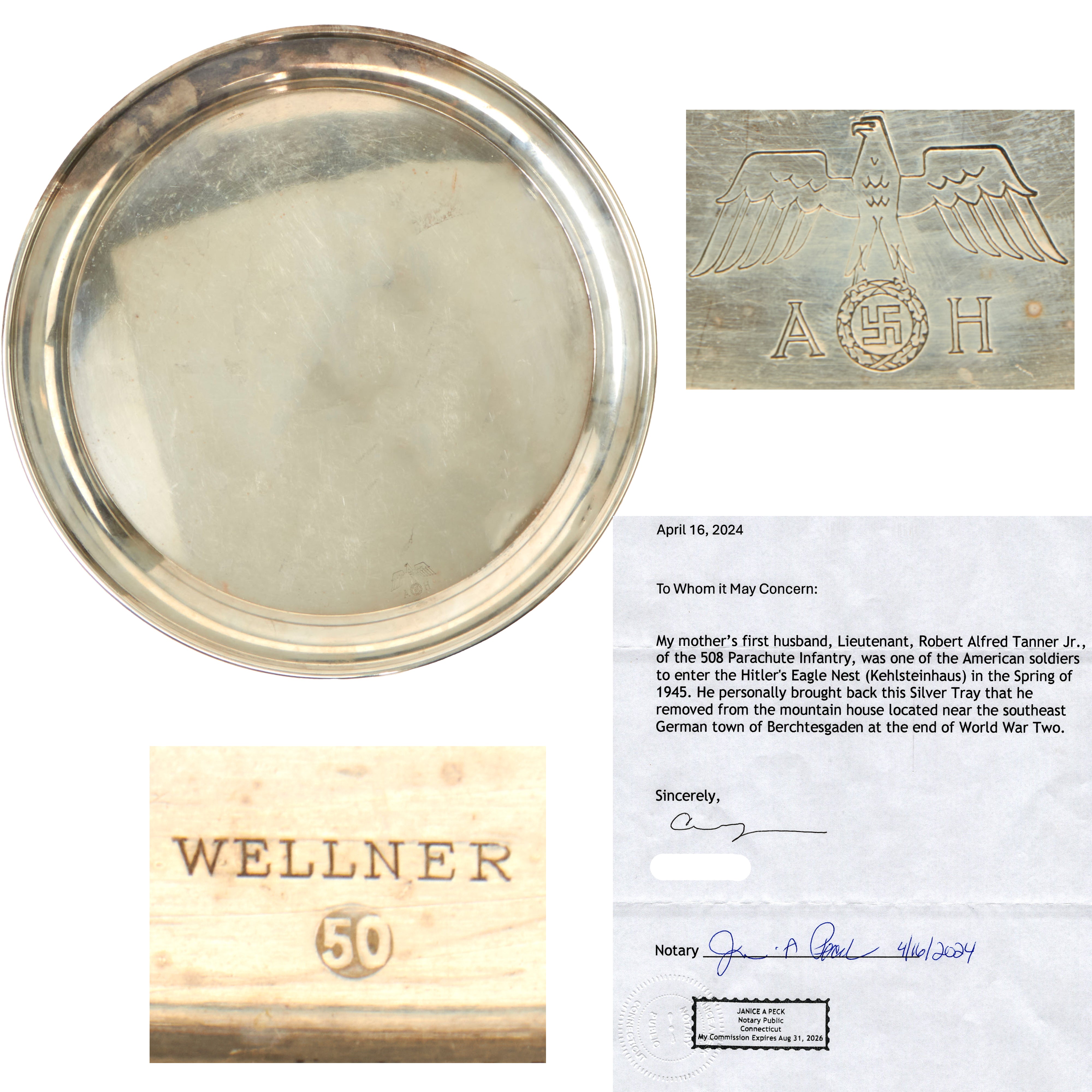 My mother's first husband, Lieutenant, Robert Alfred Tanner Jr., of the 508 Parachute Infantry, was one of the American soldiers to enter the H****r's Eagle Nest (Kehlsteinhaus) in the Spring of 1945. He personally brought back this Silver Tray that he removed from the mountain house located near the southeast German town of Berchtesgaden at the end of World War Two.