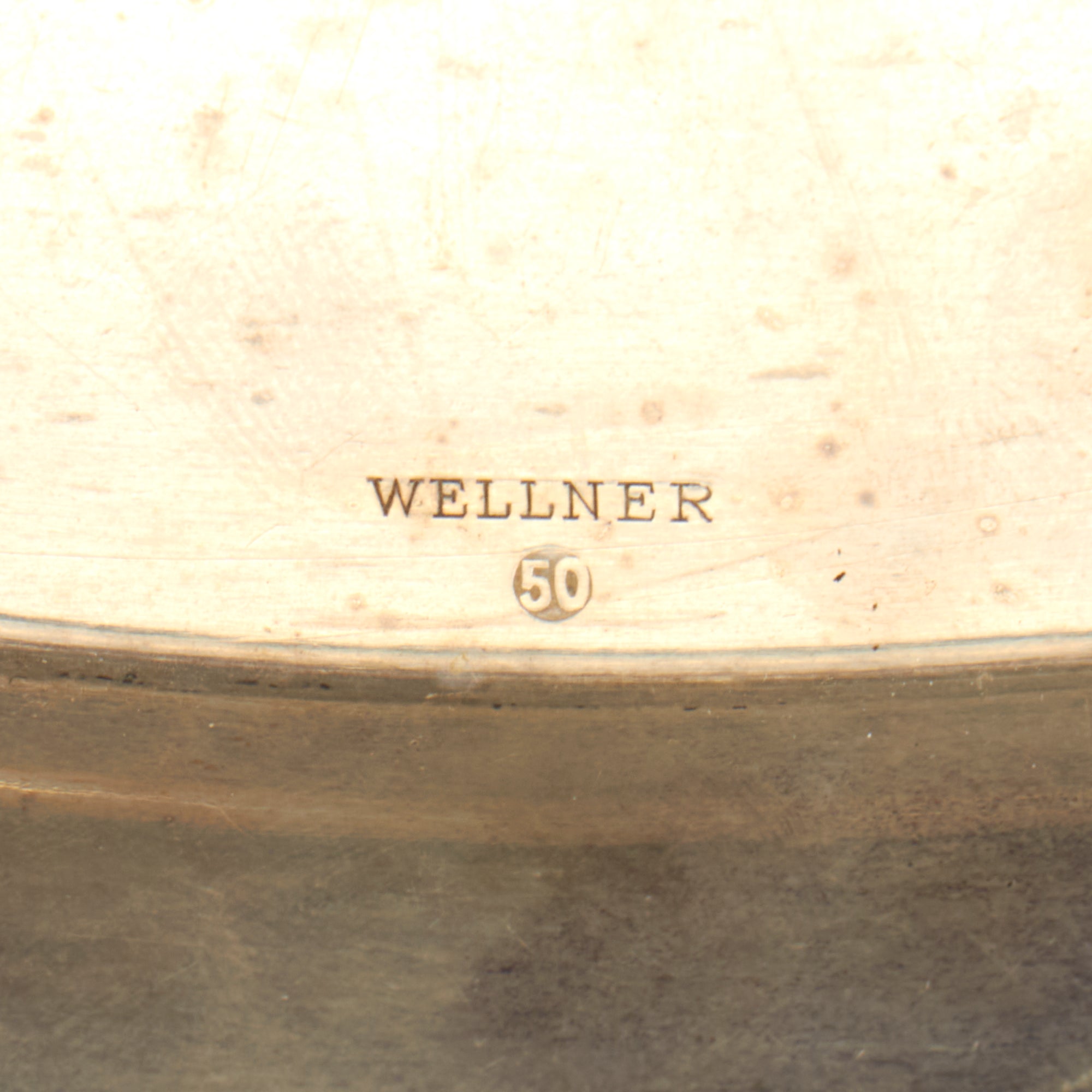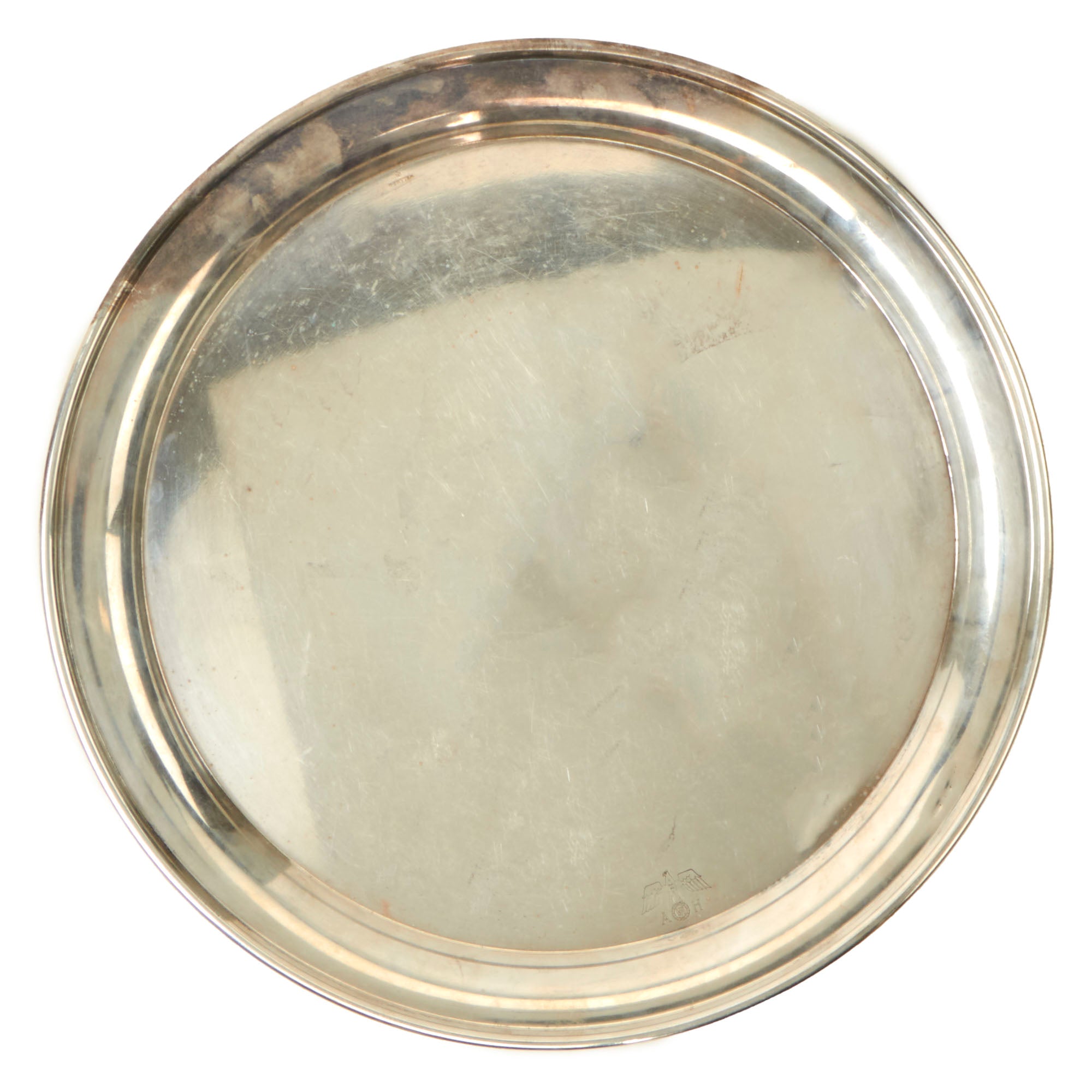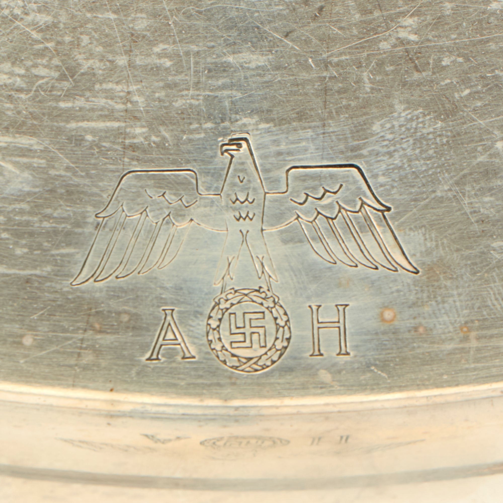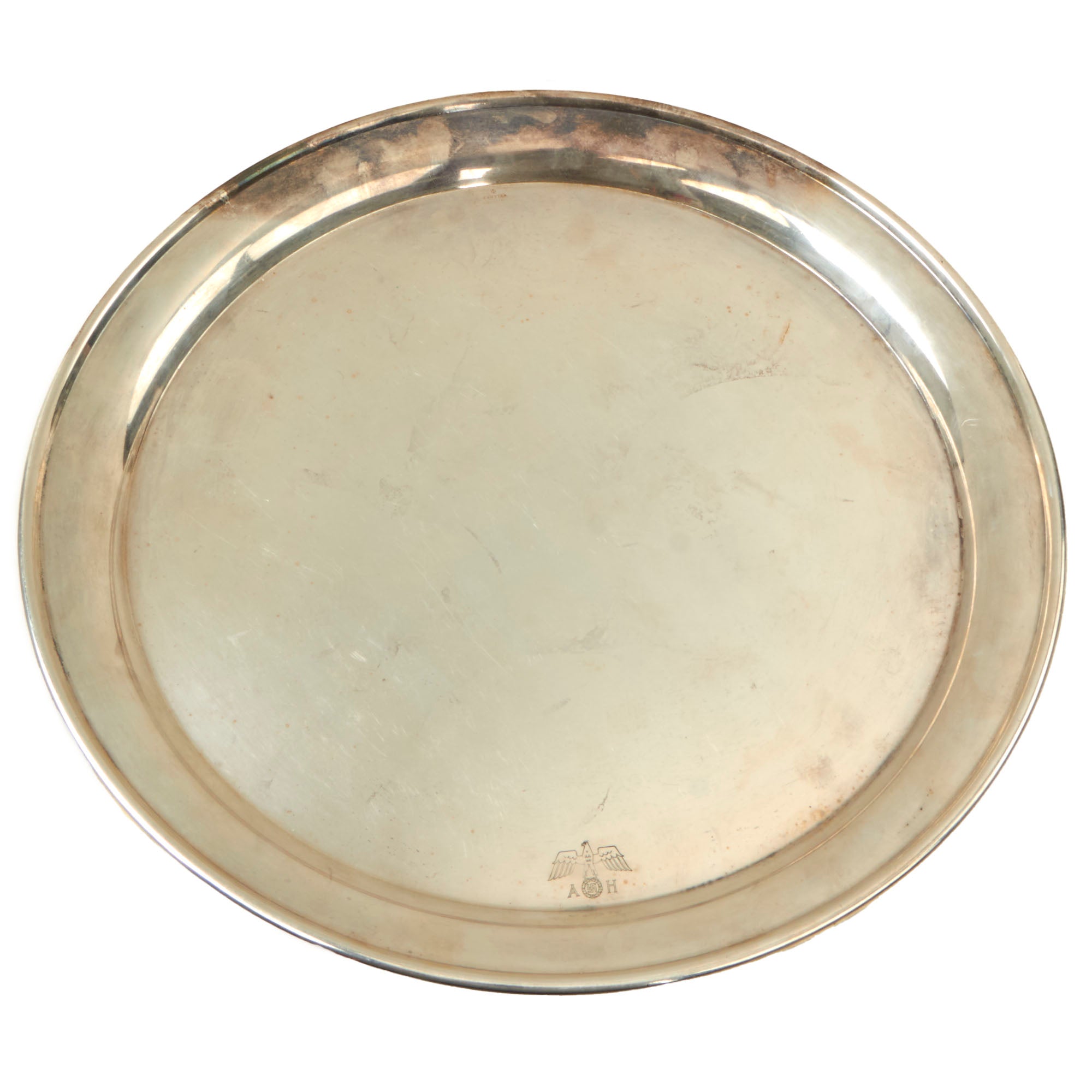 This is a stunning example of a round silver serving tray from Adolf H's personal silver service, acquired near his Berchtesgaden by a USGI. It measures 15 3/4" in diameter overall, and 12 3/4" in diameter at the bottom of the rim. Next to the rim is an NSDAP Political Reichsadler with slightly spread wings perched on a wreathed "static" swas, with the initials A H flanking the wreath. The opposite side of the top is embossed with the maker's name Wellner over 50, right next to the rim. There are no markings that we were able to see on the reverse.