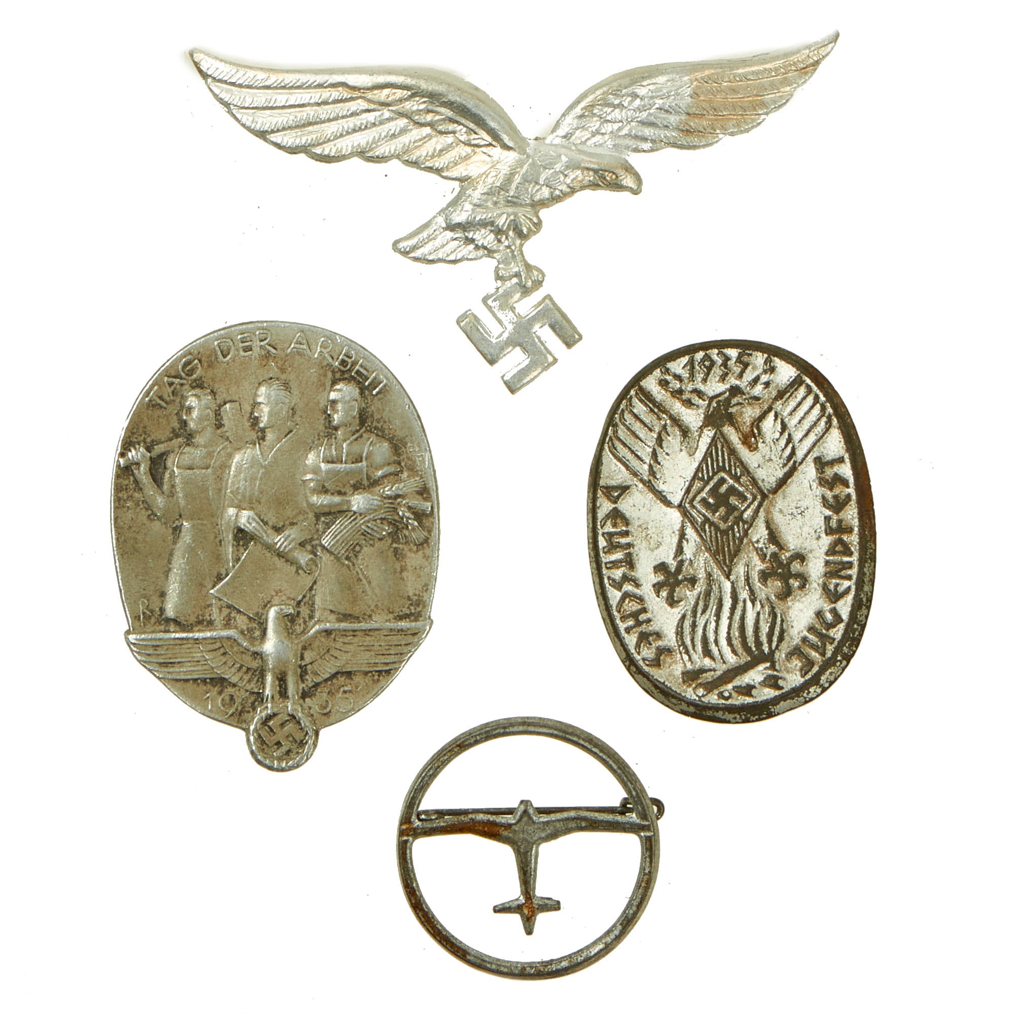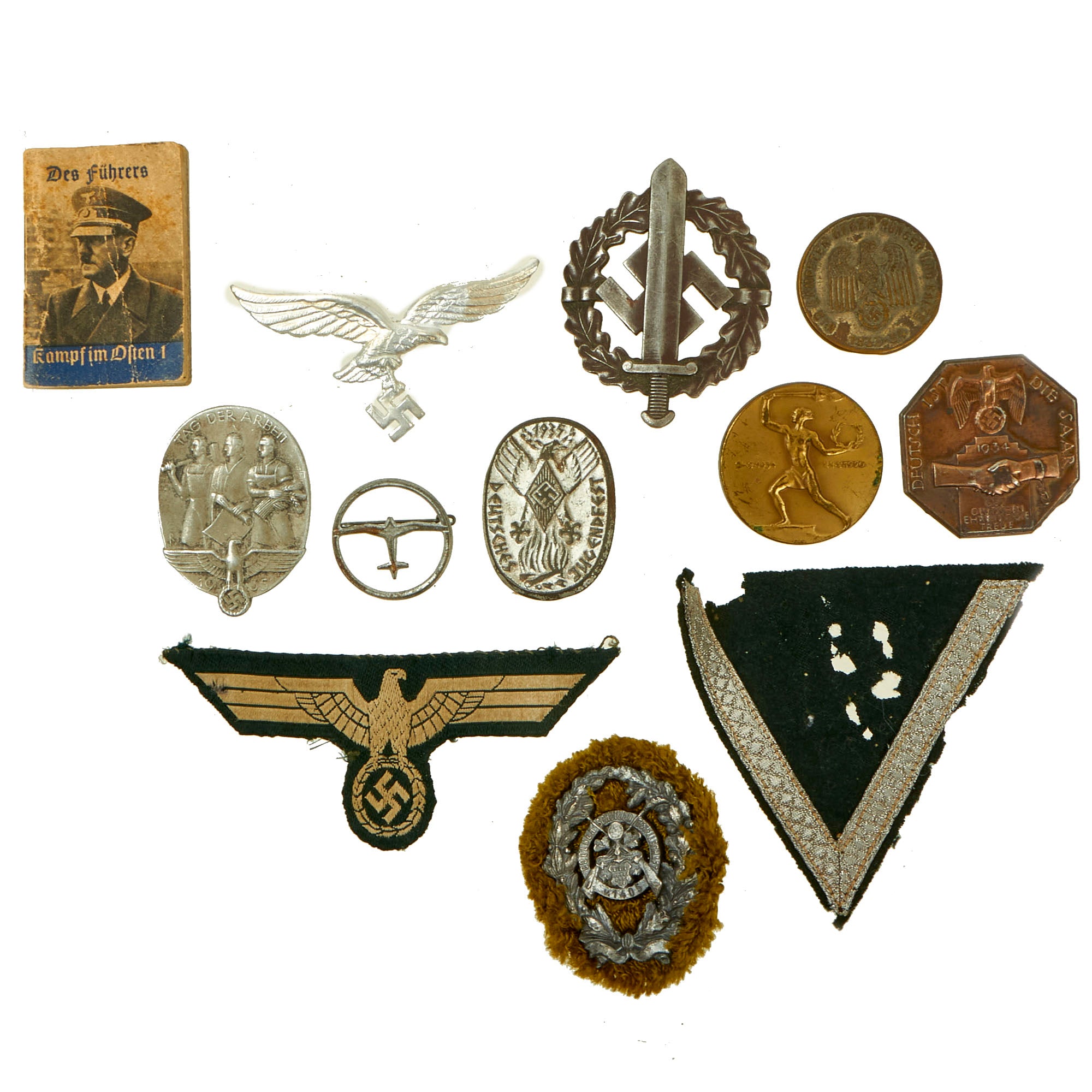 It includes a wide variety of items, including an SA Sports Badge, Rank Chevron, Event Tinnies, and even a tiny Des Führers Kampf im Osten (AH's Battle in the east" book. Please consult the pictures for further details.