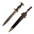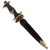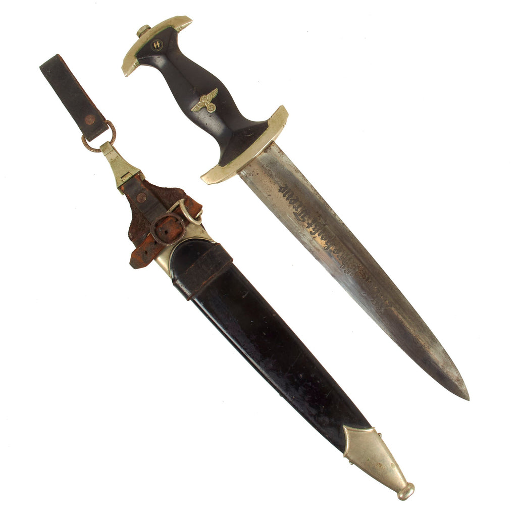The SS Dagger was equipped with nickel cross guards with an ebony wood grip. The black grip contained a National eagle with swas insignia recessed in the center area and an ᛋᛋ doppelte Siegrune (Double Sig/Victory Rune) button inset at the top. On early examples the scabbard shell surface was factory blackened using a metal bluing process. The scabbard had nickel mounts. The SS blade was a polished type containing the SS motto, Meine Ehre Heisst Treue (My Honor is Loyalty). Early examples bore one of three district stampings on the lower reverse crossguard of I, II, or III. Early examples were mostly hand-fit. Production of later examples was more standardized, using cheaper, nickel-plated fittings with black painted scabbard shells. They could be held with a standard belt hanger, or a much rarer vertical hanger.