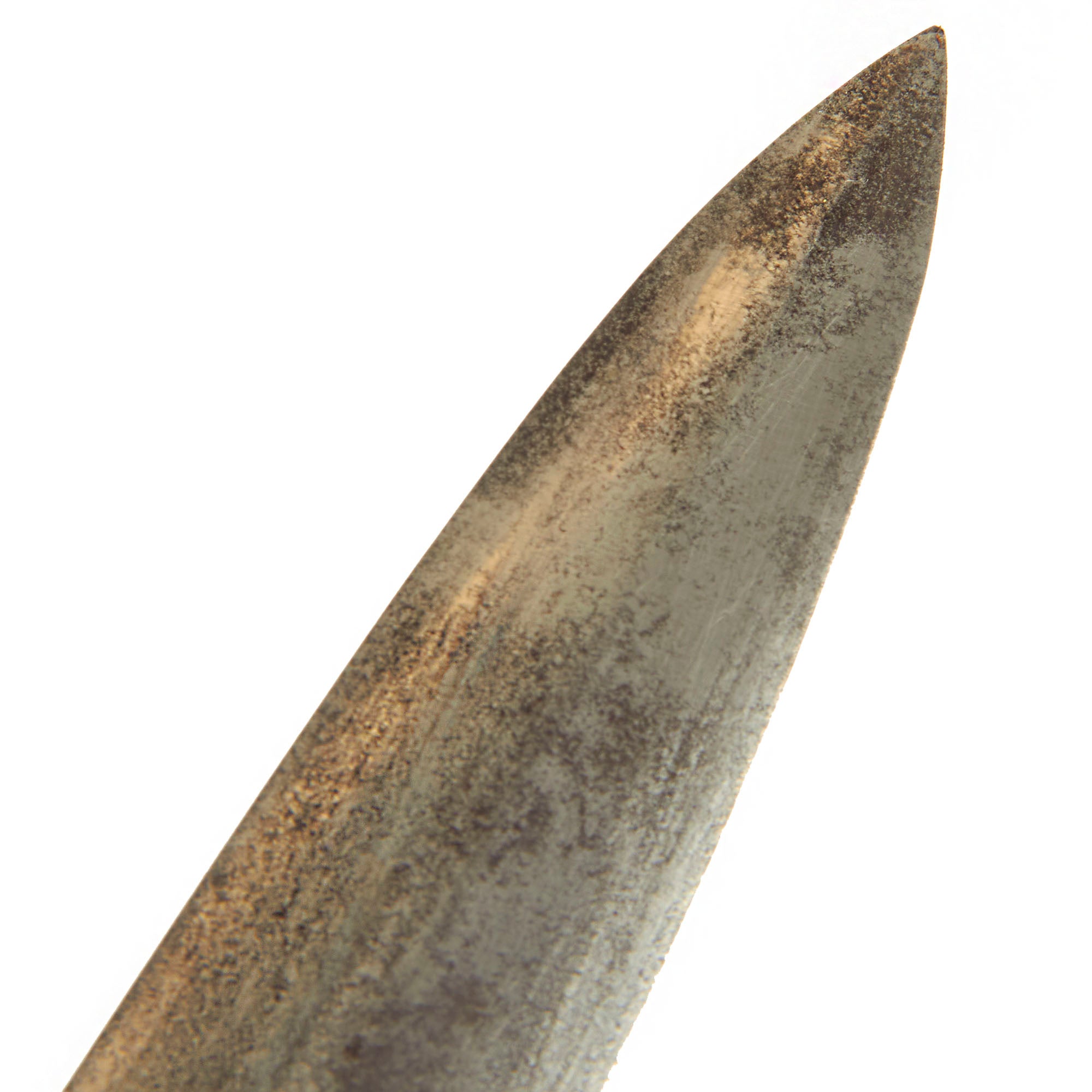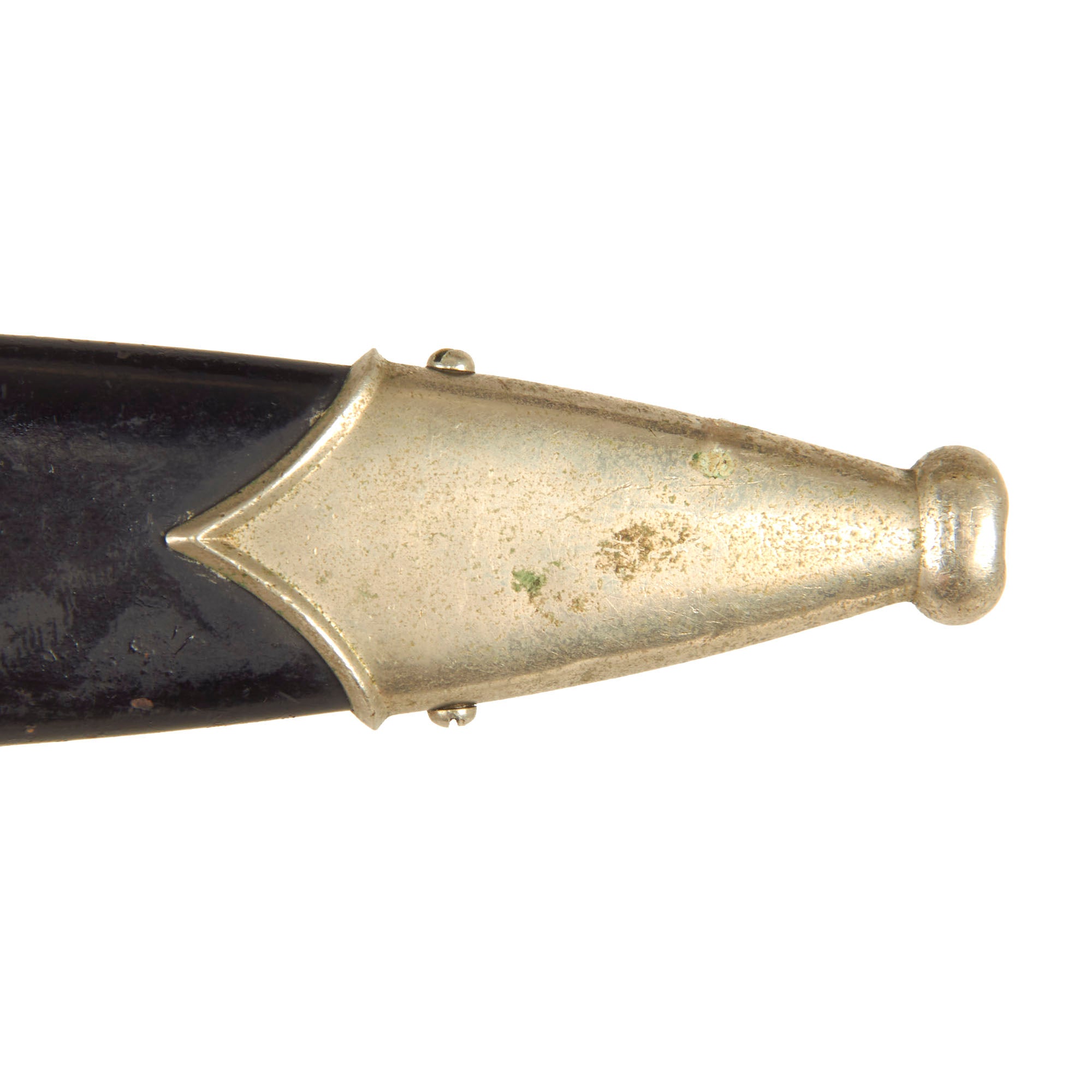 The scabbard shell is a very good example example, with a straight steel shell showing very little in the way of denting. The shell originally had a black "anodized" blued finish, which was then lacquered to protect it. It looks like the lacquer and finish must have worn away during the war, and it was repainted with the black enamel used on later issue scabbards. This now shows checking and crazing from age, so it was definitely done during the WWII period. The matching solid nickel silver scabbard mounts are in good condition, with a lightly oxidized patina. The lower ball is dented in, common with the softer nickel alloy. All four dome-headed screws are still present, with some oxidation on the throat screws due to contact with the leather of the hanger.