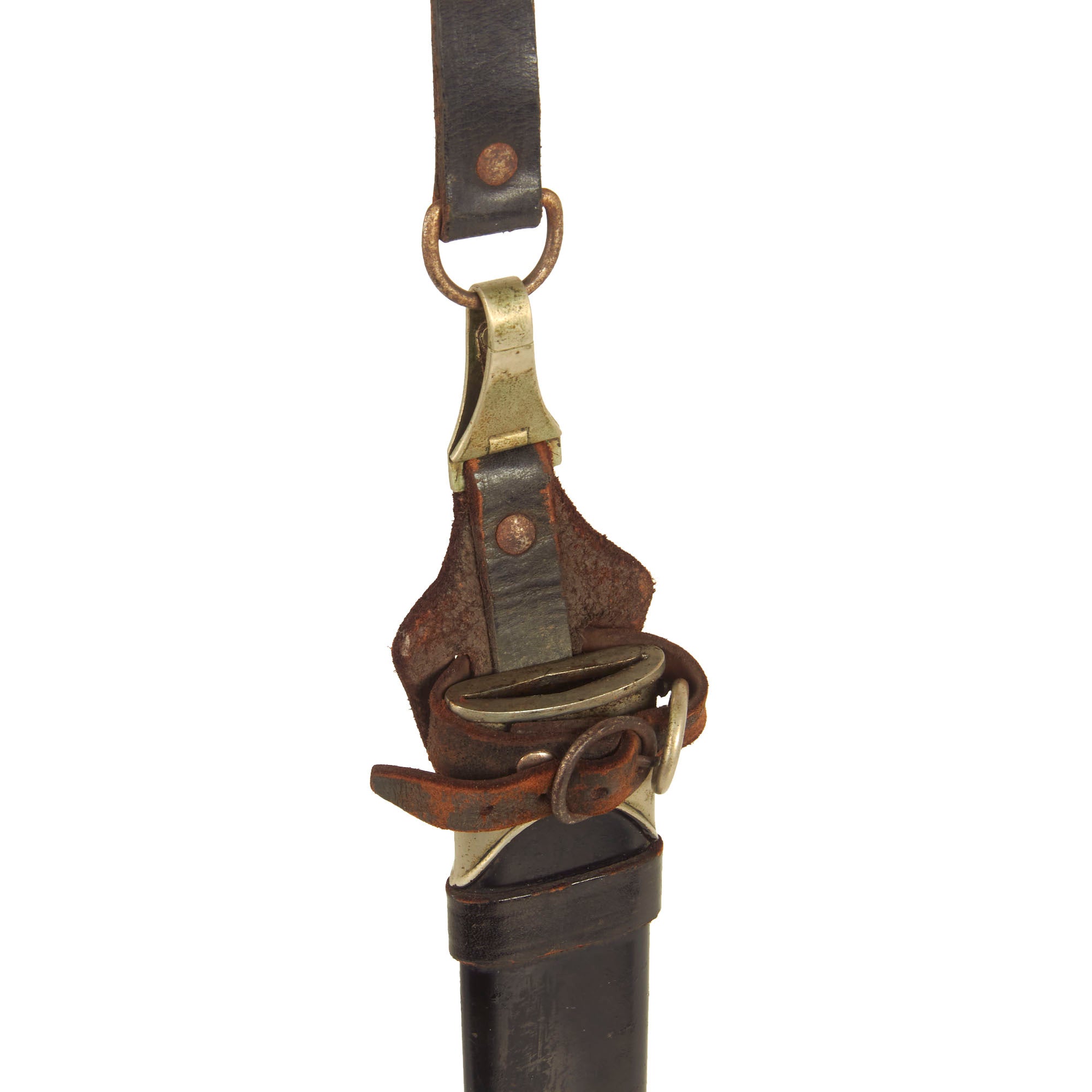 The scabbard is held securely in the extremely rare leather vertical hanger, topped with a nickel hanger clip, which is attached to a belt hanger with a plated steel loop. The leather is in very good condition, still supple without any tears or or major issues. It only shows wear and flaking to the finish, expected on an 80 year old leather item. These are extremely rare in any condition, but especially when they are fully intact. There is no maker mark, but that is not uncommon. Attached to the clip is a leather belt loop with a plated steel D ring.
