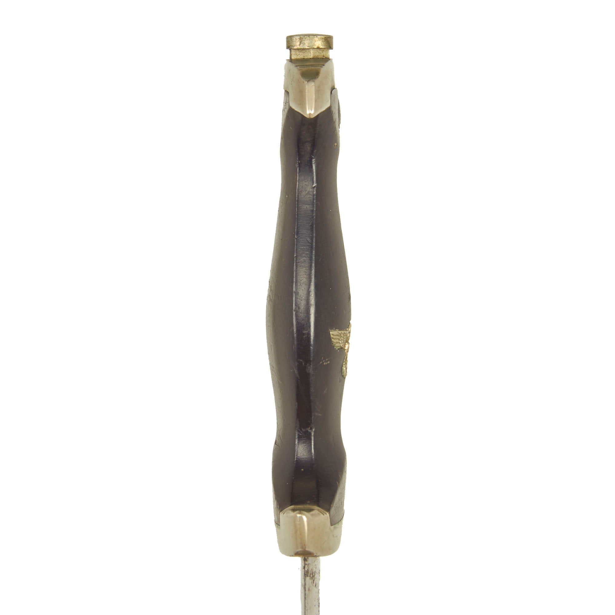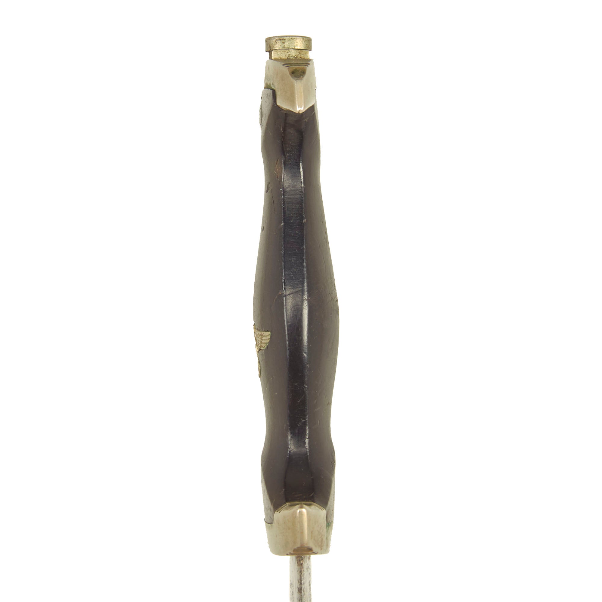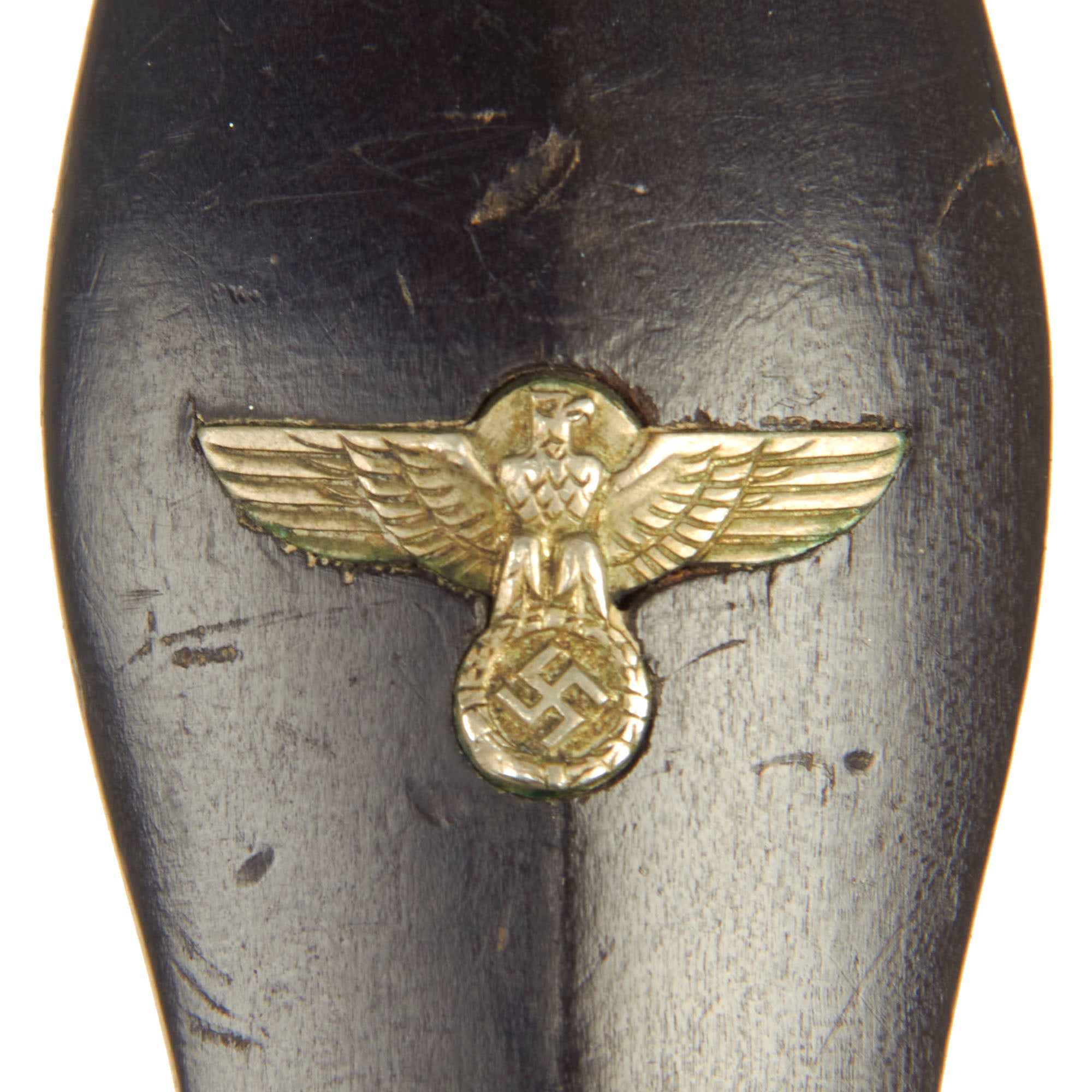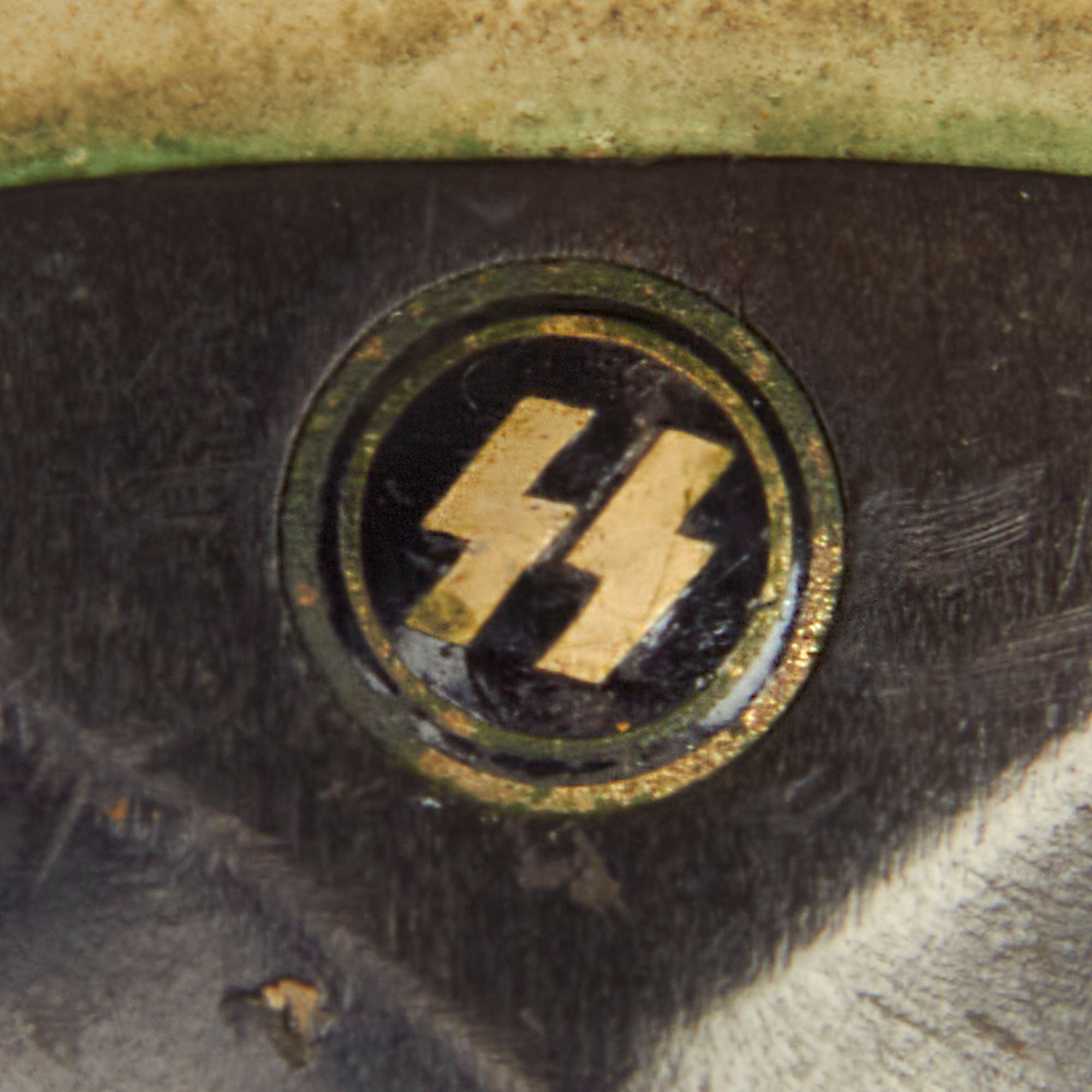The ebony grip is a great example, the best we have seen in some time! The ebony wood used to make the grip is unfortunately brittle, and the treatment used to give it a uniform look exacerbates this. However on this example we has no chips or chunks missing, and we can discern just a hairline crack near the crossguard on the obverse. The color is very good, and wood grain can be seen, which combined with the overall condition really makes this a fantastic grip. There is just a bit of pressure denting and scratching from service in the wood. The symbol button is positioned at about 7:00 o'clock, as it should be. The silvered SS symbol and double circles around them have a nice matching patina with the nickel still intact, with a little verdigris and mostly complete enamel showing a few chips. The nickel grip eagle is the "high-necked" type with the beak pointing slightly up. It remains in crisp condition, showing little wear to the bird's head, breast and wing feathering and to the talons, wreath or swas.