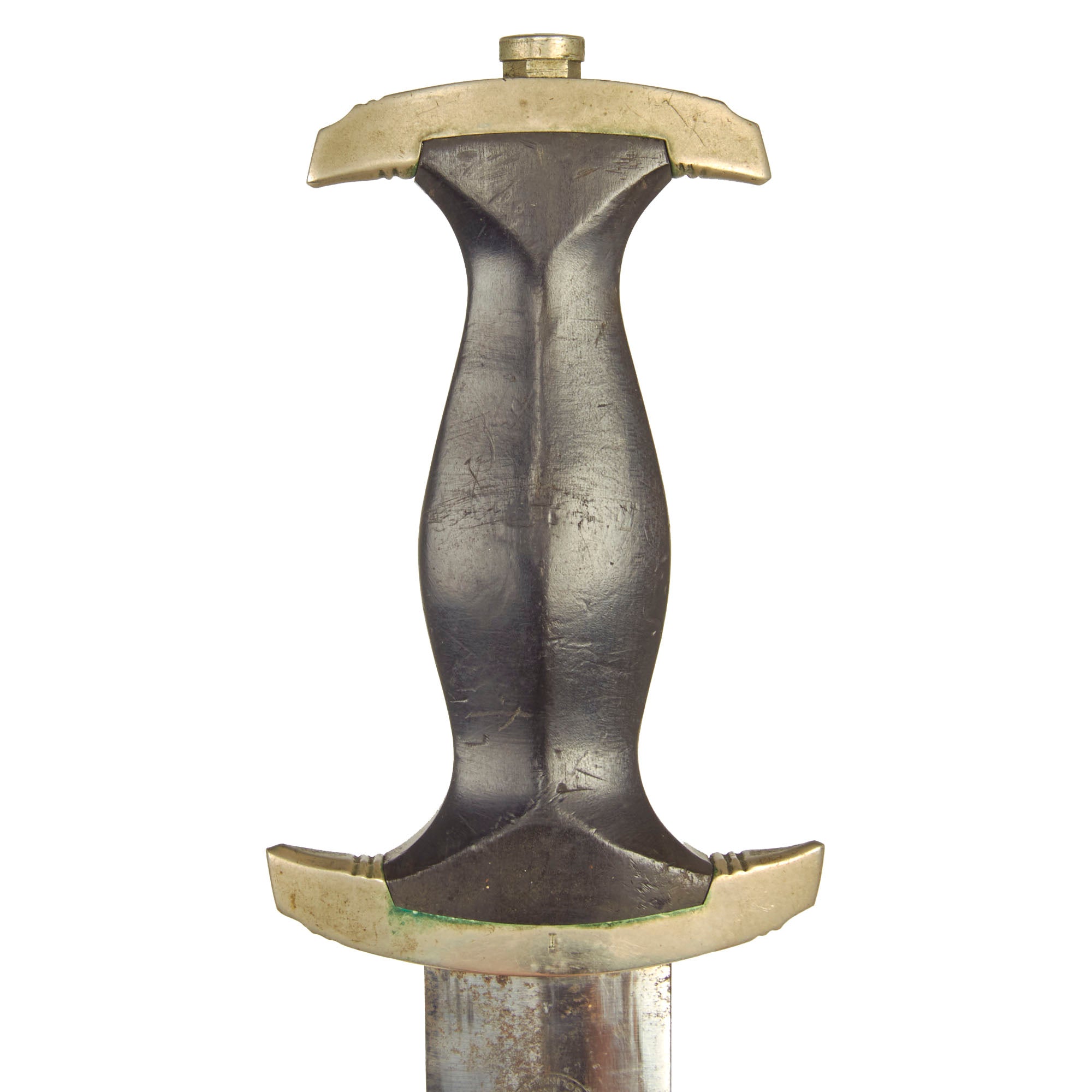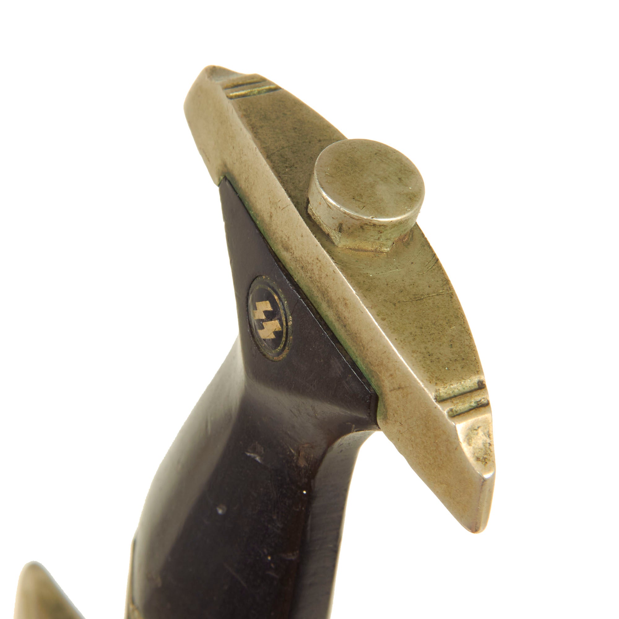 The guards of this dagger and tang nut are in good condition throughout, and are of the earliest solid nickel silver construction. They have smooth surfaces, good crisp edges and precise accent grooves. They show some patination and verdigris near the wood grip, with a bit of light oxidation elsewhere. The cross guard is marked with a Roman numeral I on the side, for the first SS district. There is no lifting of the finish, showing these are indeed solid nickel silver. Per a customer request, we checked the inside of the guards, and both are marked with a raised F and B, and the cross guard also has a number 9 stamped into the metal. We have seen these same maker markings on several other examples of early issue SS daggers.