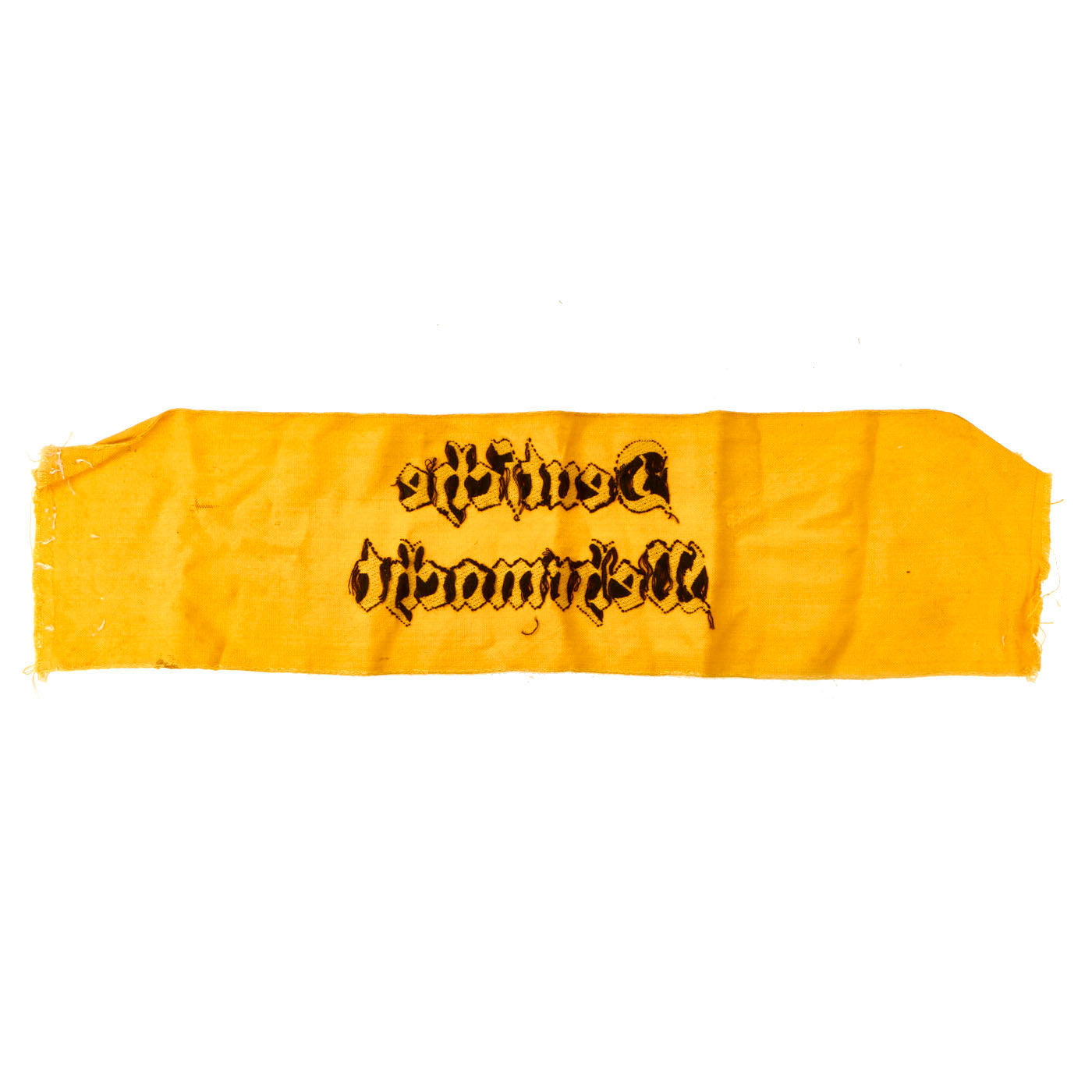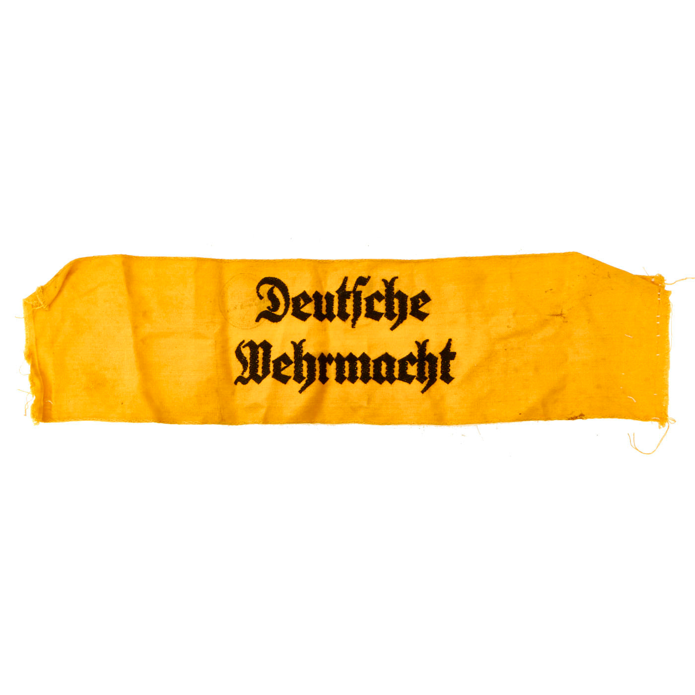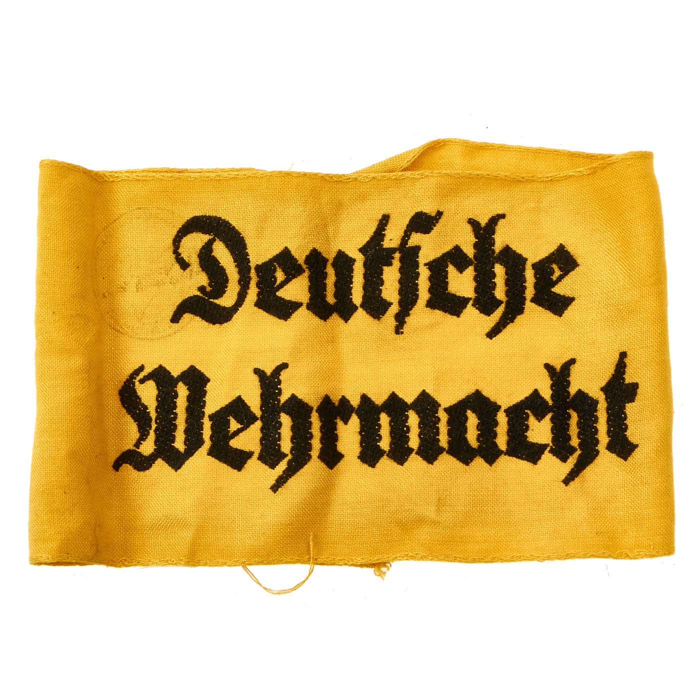 - German WWII Deutsche Wehrmacht Machine Embroidered Armband with Depot Stamp. These were worn by uniformed German personnel, who were attached to the Armed Forces during WWII. Often, these were worn by men of the Reichsarbeitsdienst and Reichsbahn who were operating with the German Army in the occupied countries. This example is machine embroidered, and has had the stitching that holds it together taken out. It may have been attached to a uniform or clothing at some point, and shows some light staining.