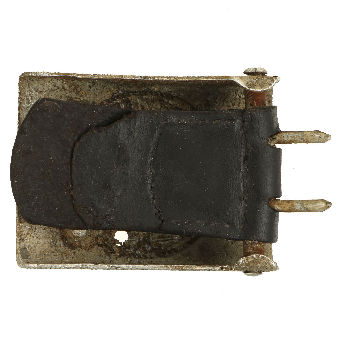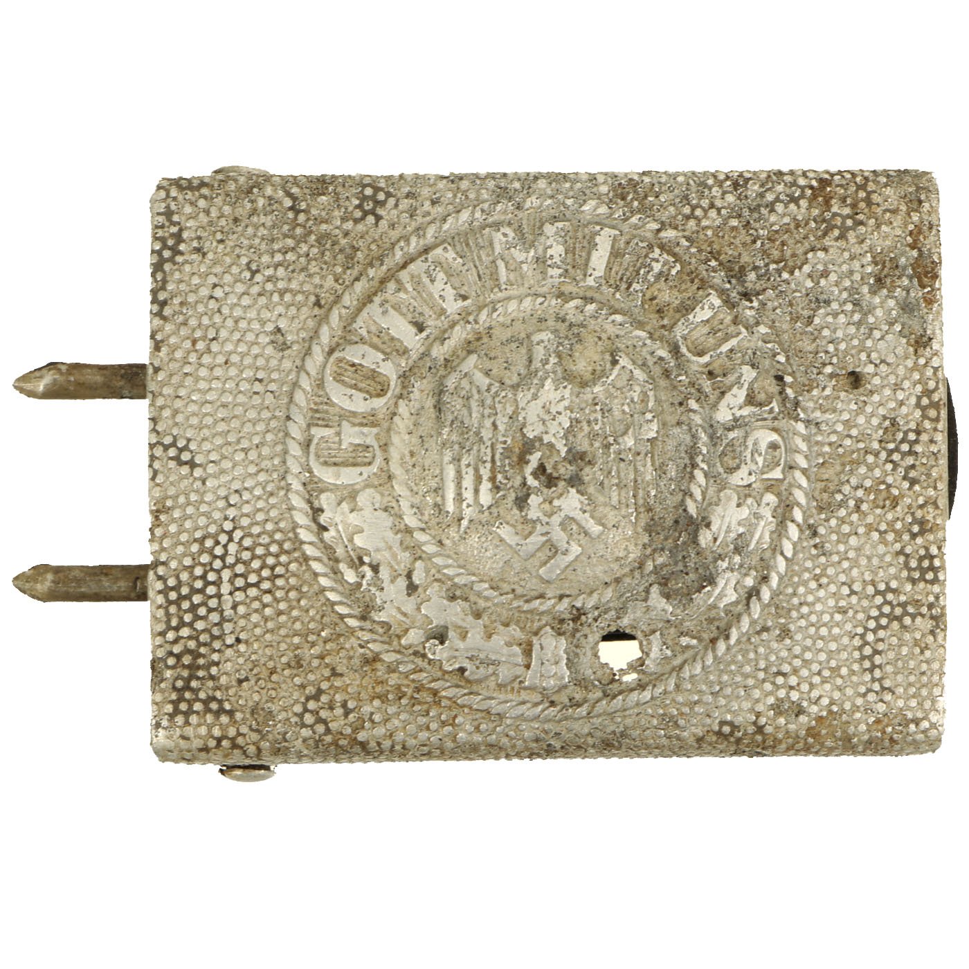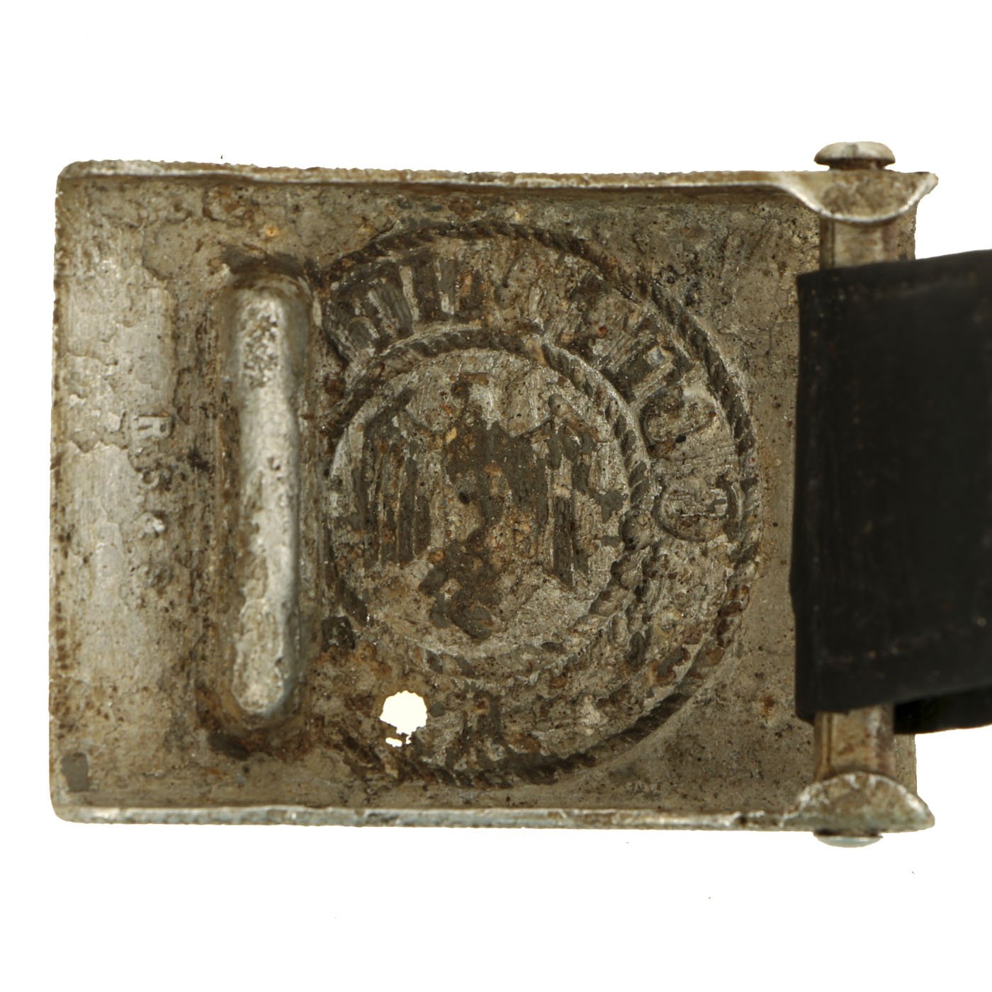 - One German WWII Heer Army Pebbled Aluminum Belt Buckle with Tab. The belt buckle looks to be in worn condition, and does show oxidation in the aluminum on both sides. It may have been a battlefield pickup during the war. The tab is quite shrunken with the stitching completely gone, and markings cannot be read. However the buckle itself is still marked R. S. & S. for Richard Sieper & Söhne of Lüdenscheid, a German city with a large garment accessories industry.