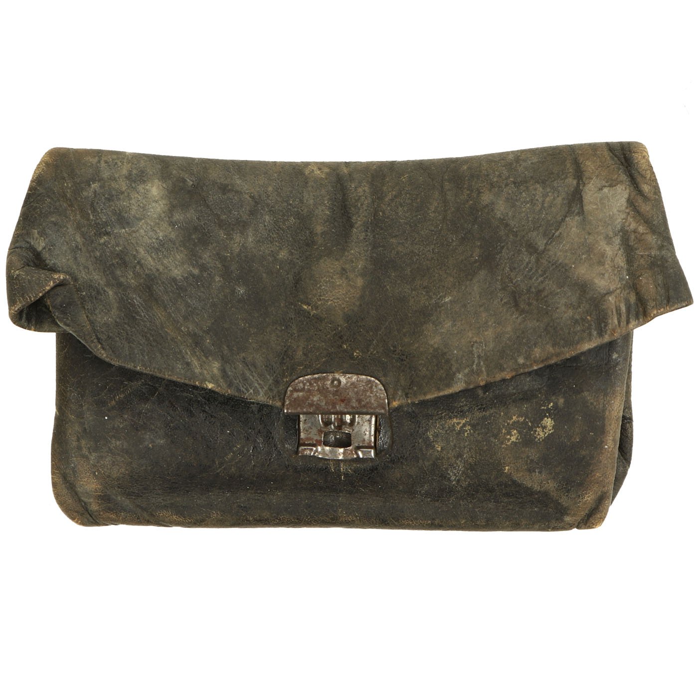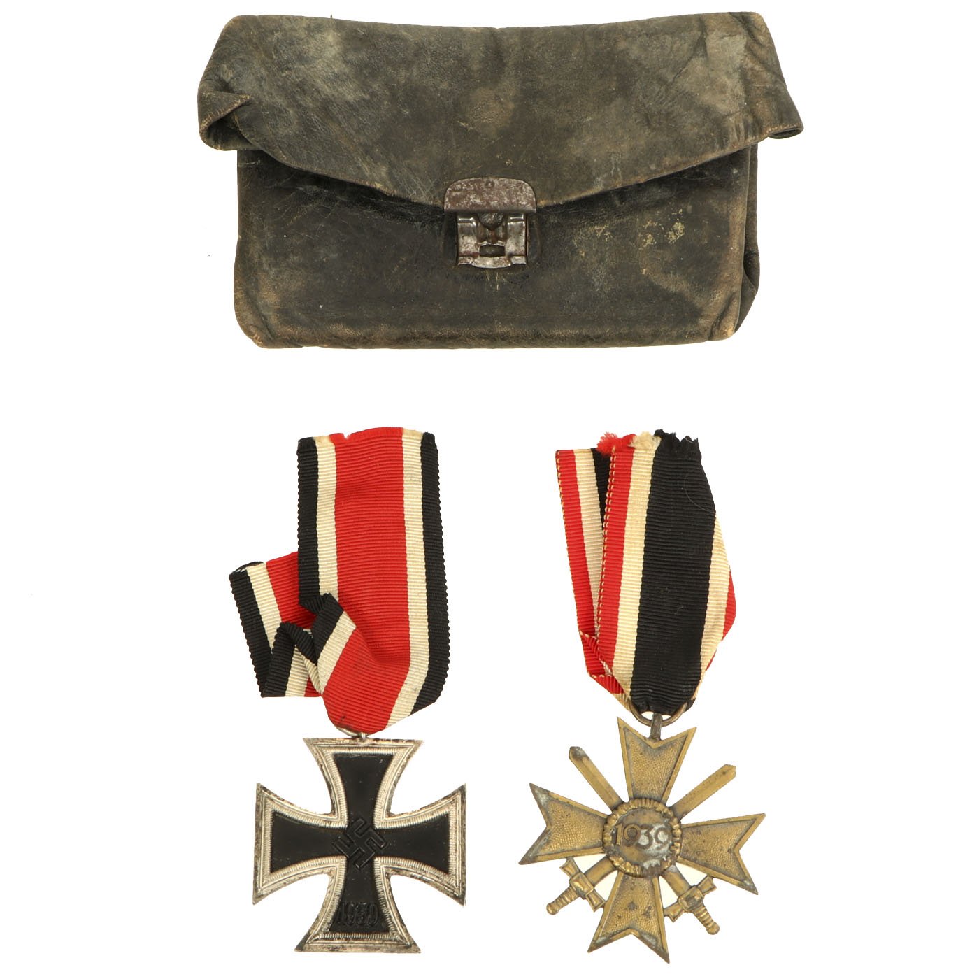 - One German WWII War Merit Cross 2nd Class with Swords (Kriegsverdienstkreuz II. Klasse mit Schwertern) with two ribbons. There is no maker mark on this example, but it is in very good condition, with two ribbons installed. There is some light oxidation, probably from being in the leather wallet for so long.