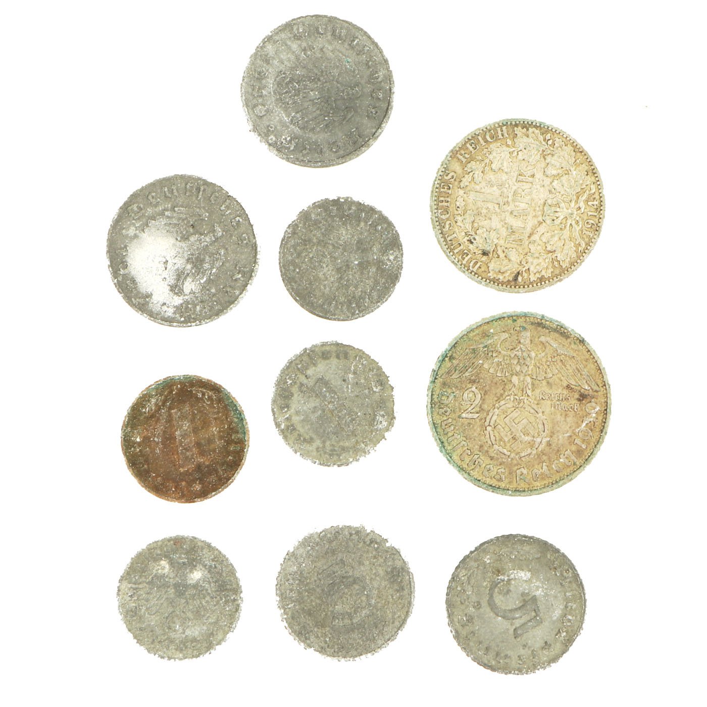 - NINE German NSDAP Period Coins, including Four 1 Reichspfennig, Two 5 Reichspfennig, Two 10 Reichspfennig, and one 2 Reichsmark. Condition varies as shown, and dates are from the 30s and 40s.