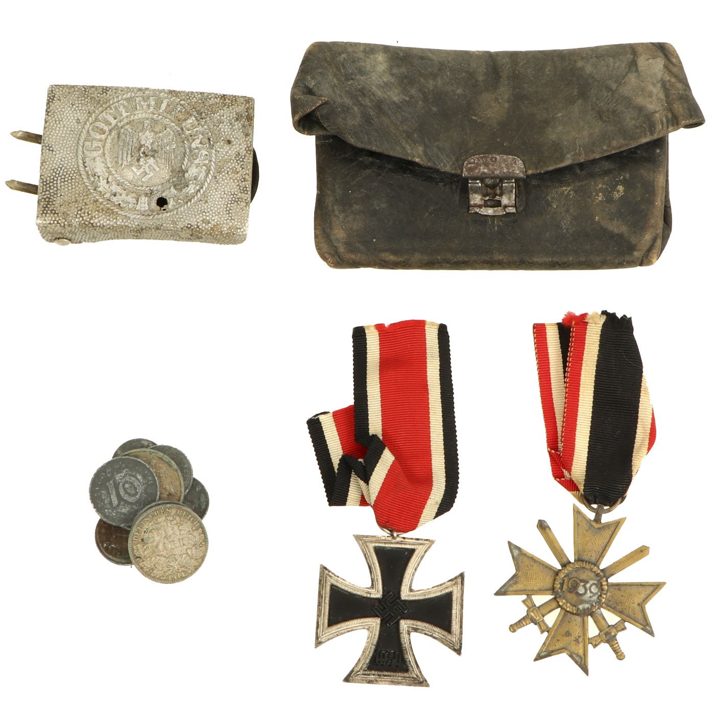 Original Items: Only One Set Available. This is a very nice collection of German WWII Insignia, which was brought back from the European theater by a USGI after the war was concluded. It includes two medal awards, a belt buckle, some coins, and even a WWII era stamp.