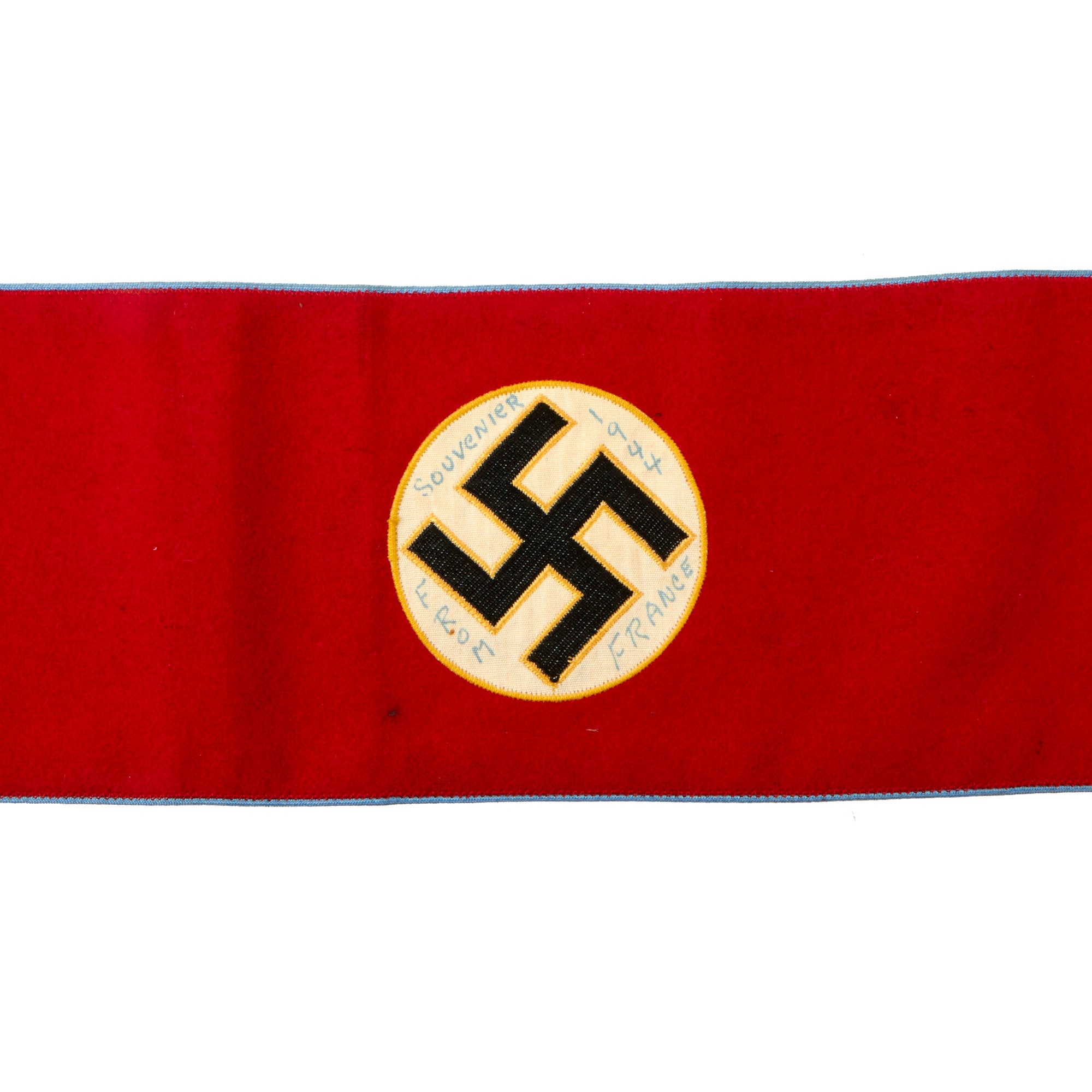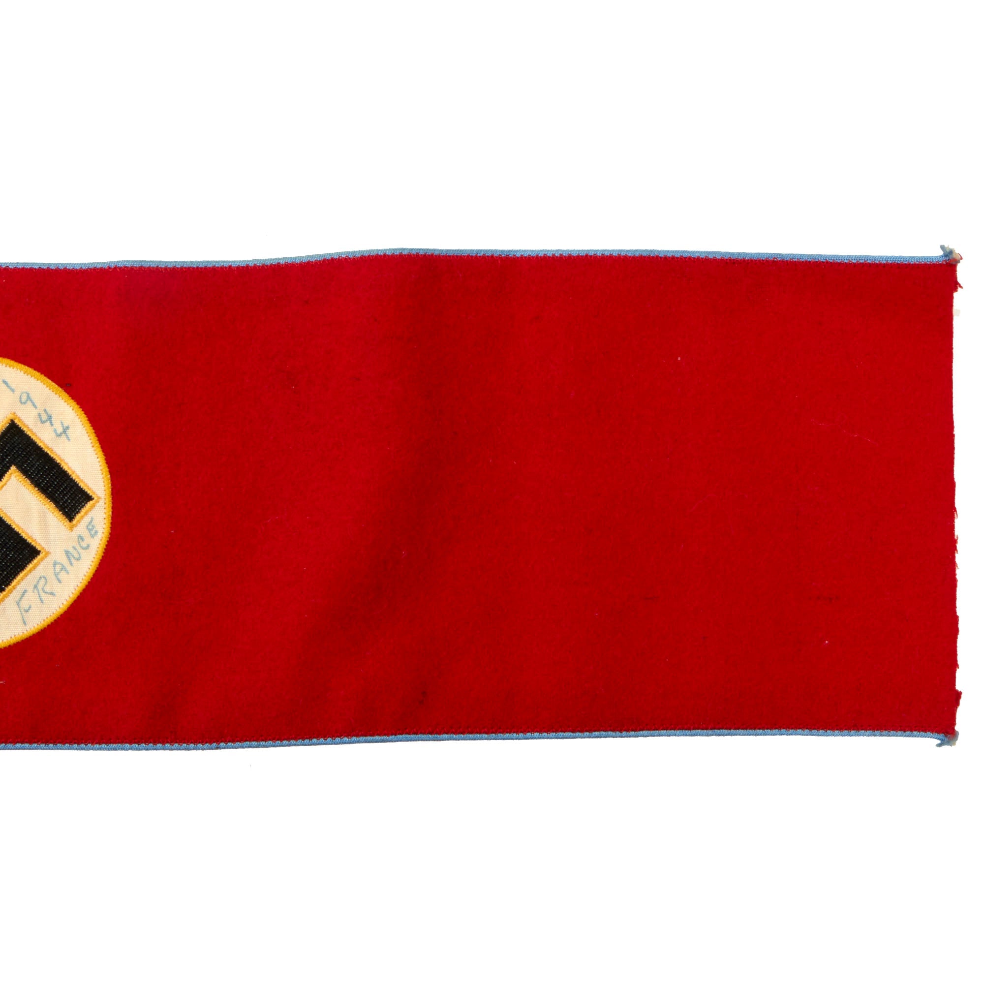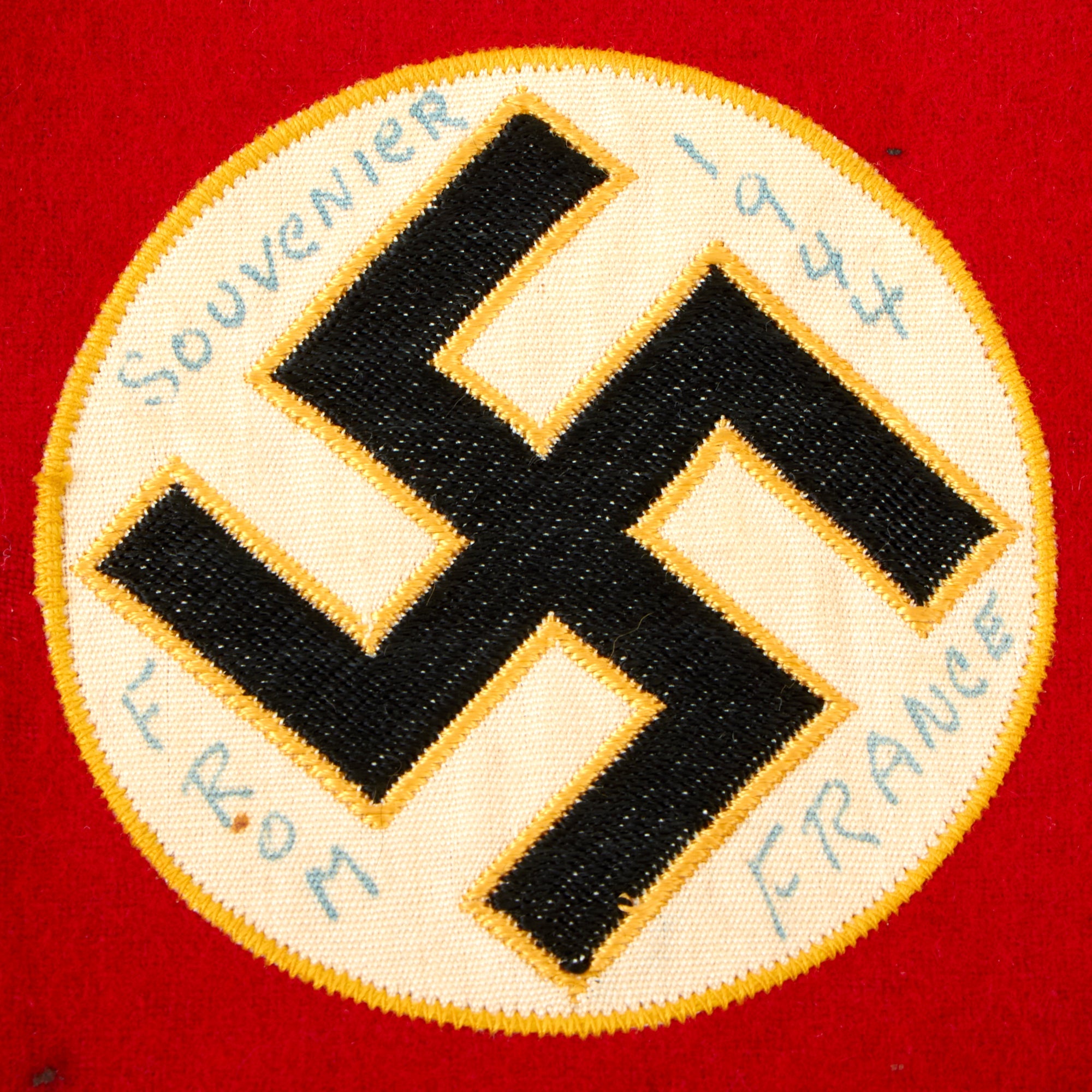 After it was captured during the war, the phrase SOUVENIER FROM FRANCE 1944 was written on the central white field around the swas (hook cross). Unfortunately we do not have any other information about who captured it.