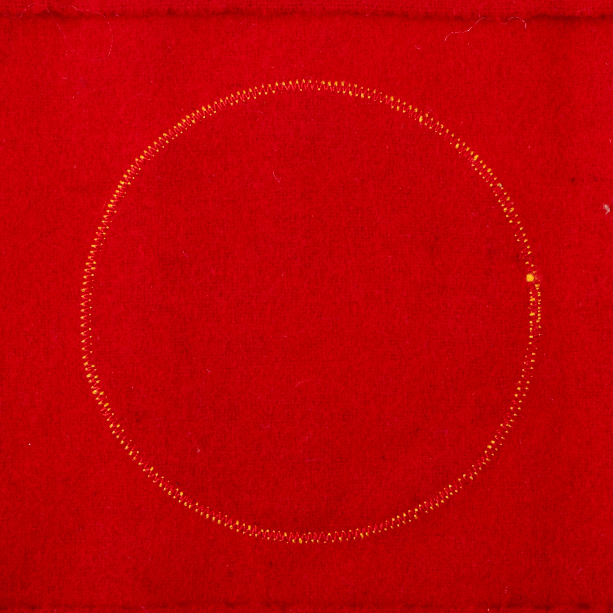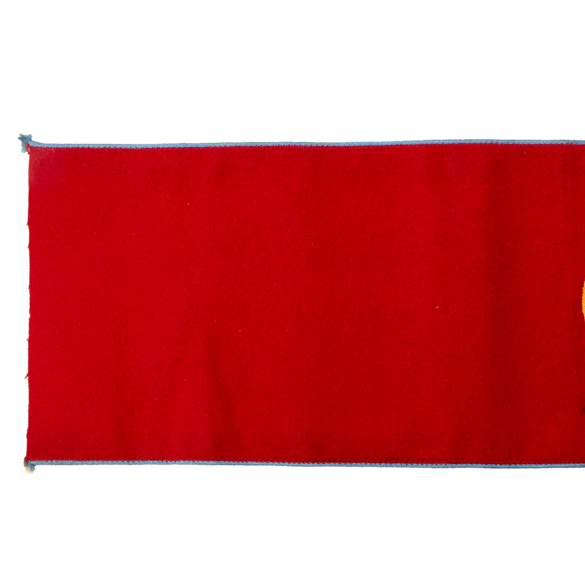 This lovely armband is constructed of a red wool/cotton blend cloth with an embroidered central black swas (hook cross) on a white rayon field, all bordered by yellow/gold cotton thread. There is no other adornment except for the light blue piping borders on the edges of the armband. Total length is 21” with a width of 5 3/16”. The armband is in very good, lightly worn condition showing some staining in areas, and a few moth nips.