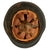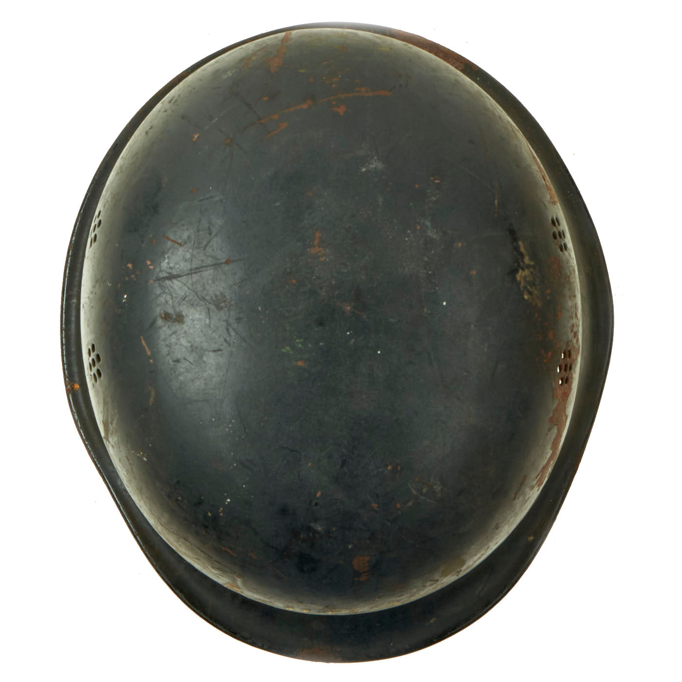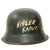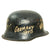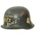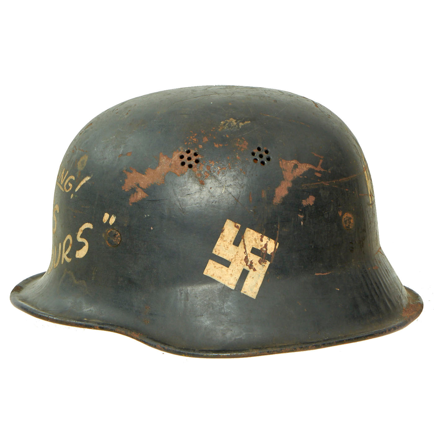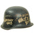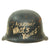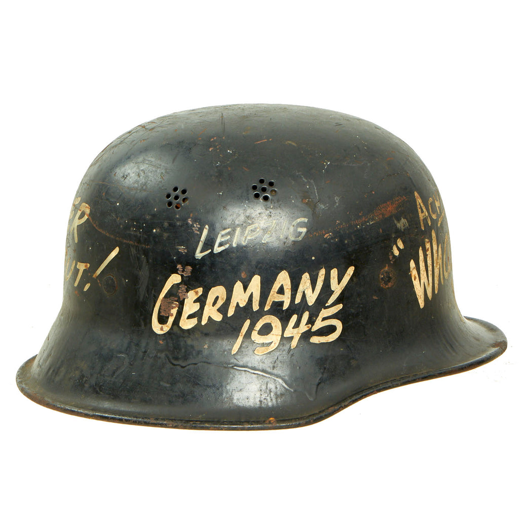 Original Item: Only One Available. This is a very interesting genuine steel construction M34 Civic helmet, which unlike many does not have the "square dip" transition from the visor to the rest of the skirt. It was probably original set up for Polizei (police) or Feuerwehr (fire brigade) use, but the original decals were completely removed from the exterior of the helmet, while the black paint was retained. There are some areas of scratching and paint loss, but no major damage to the shell, and after it was captured various phrases and symbols were added to the exterior in white paint. One of these was a white Swas (hook cross) on the left side.
