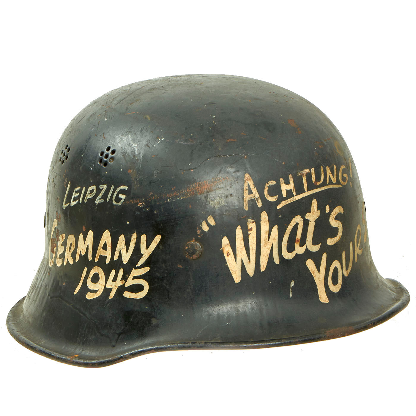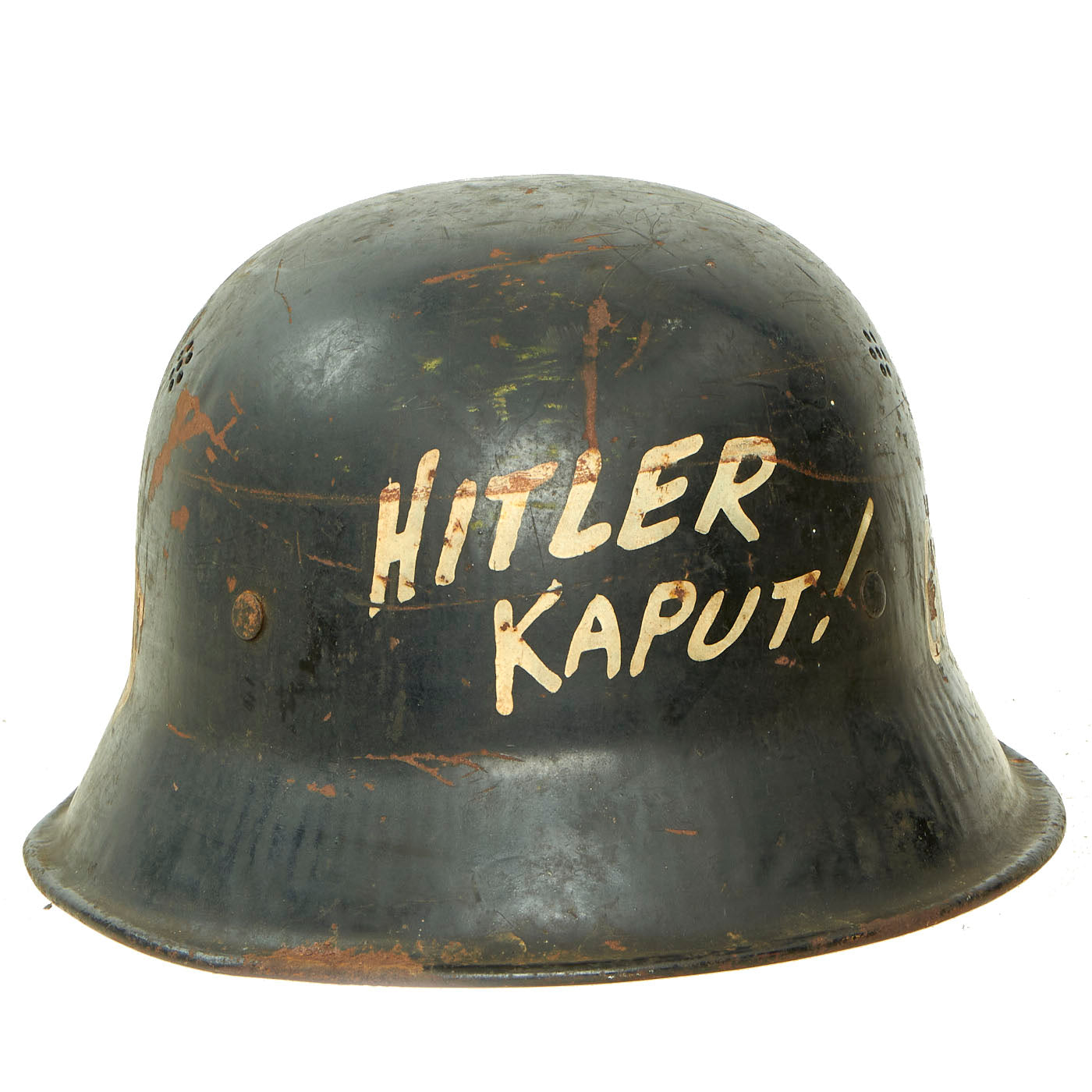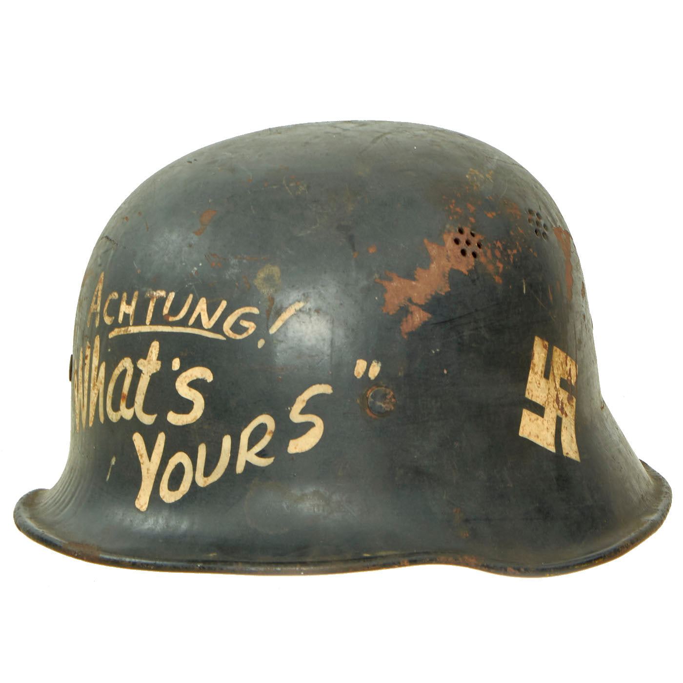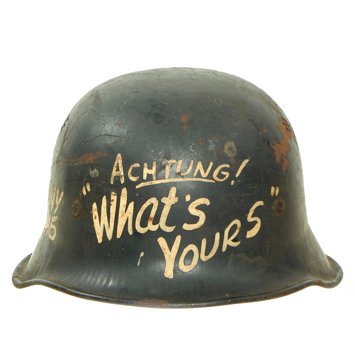 These are some famous messages usually seen during the WWII period. All of the personalization was added some type ago, and chips and rust that affect other parts of the helmet also affect the added writing. Really a great display piece here!