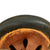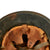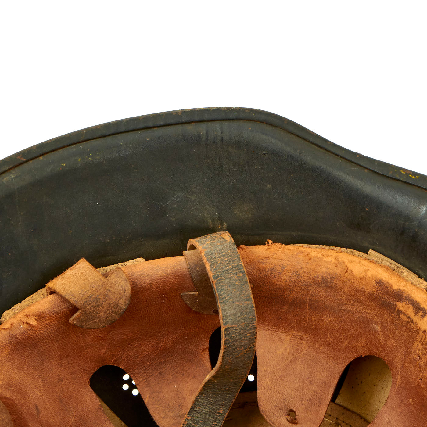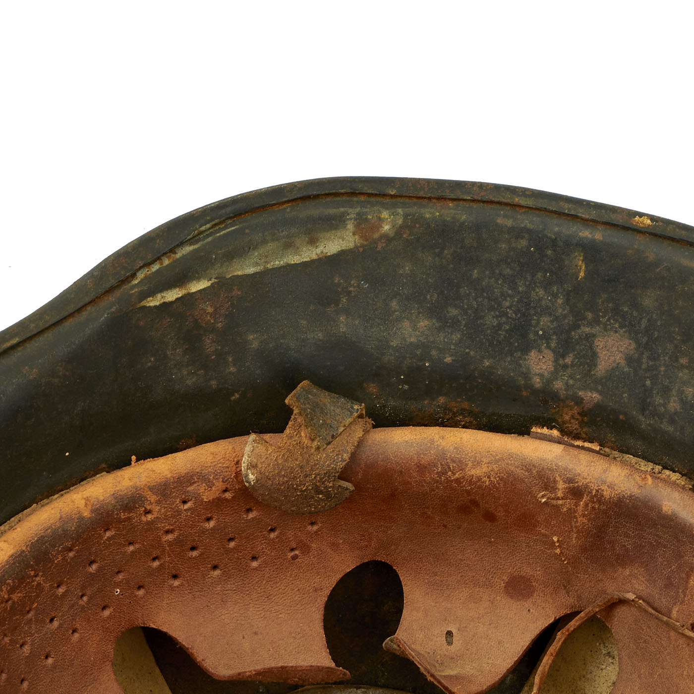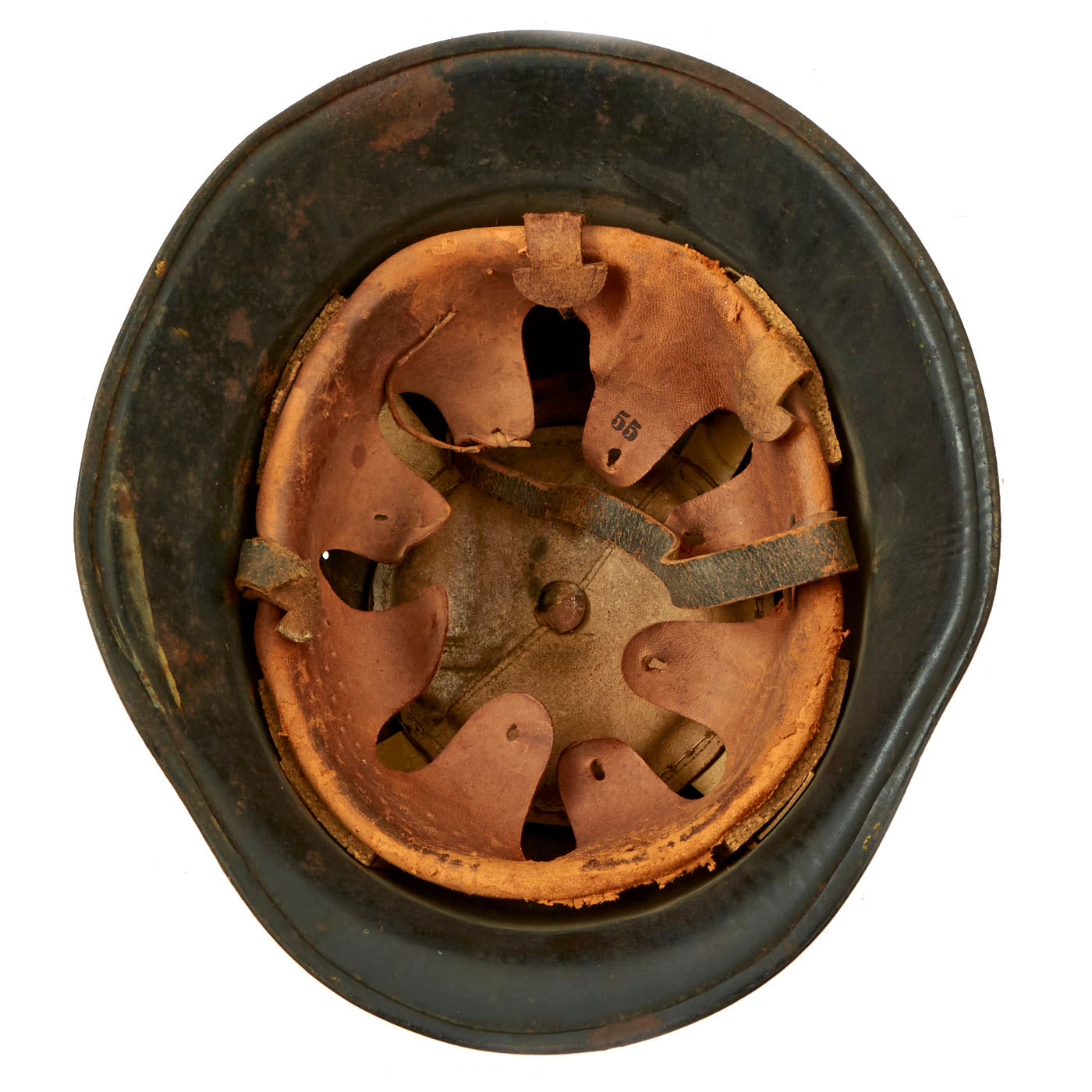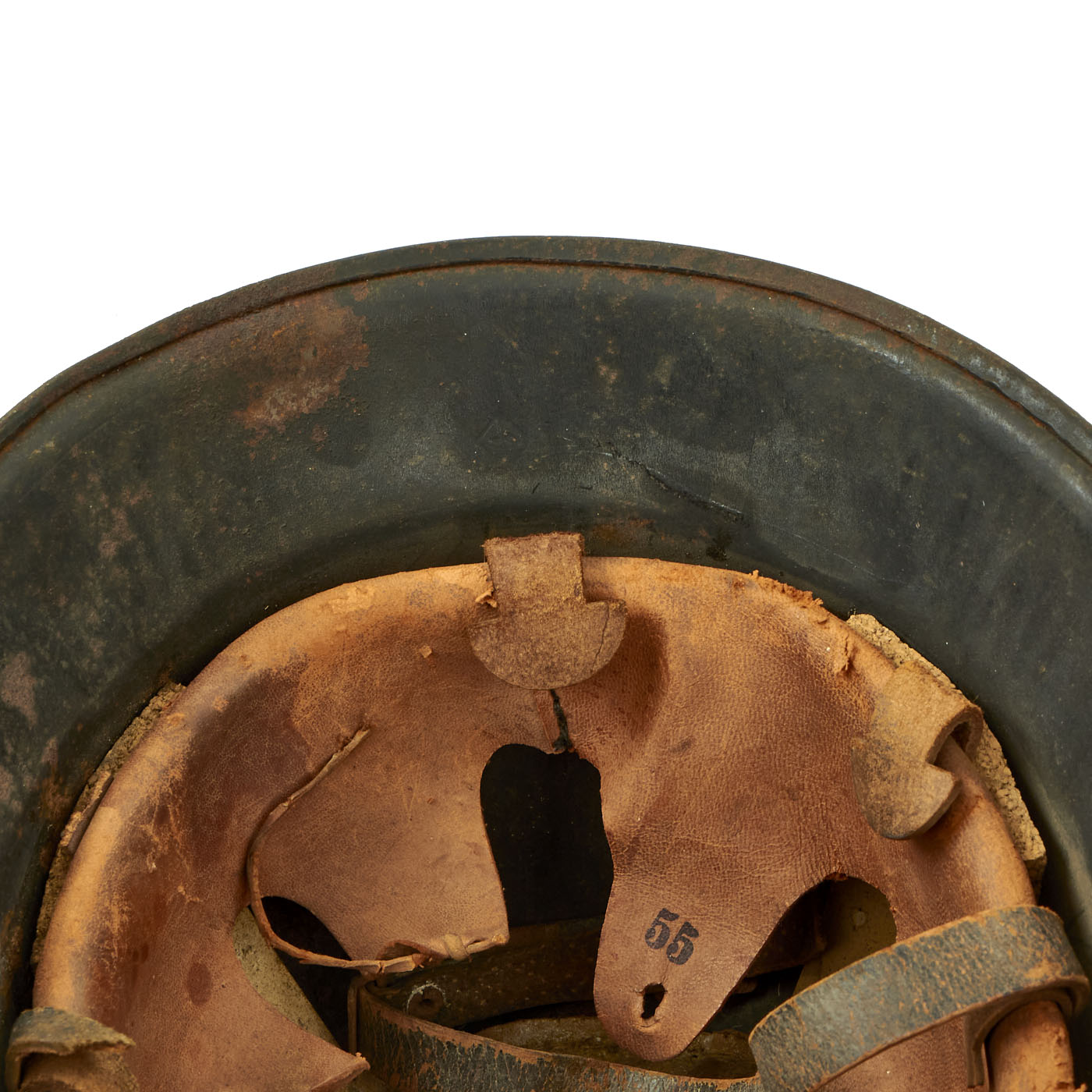 The helmet comes with a complete civic style leather liner attached with cork spacers, with all four split pins still present. The liner is mostly intact, and still has the top supports present with the crown pad. The leather has torn and deteriorated along the edge, however all of the "fingers" are still intact, one of which is marked with size 55. The top tie string is missing, and the chin strap is broken on one side, with the remnants delicate. Four of Five tabs for attaching the rear skirt are still present, though they are stiff and somewhat cracked. We checked the interior of the helmet, and there is a maker mark on the underside of the rear skirt, a small diamond shaped mark that we have seen on these helmets before.