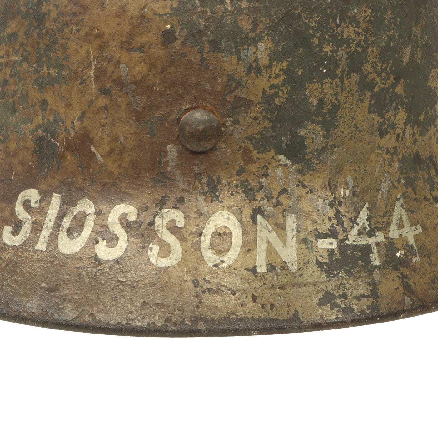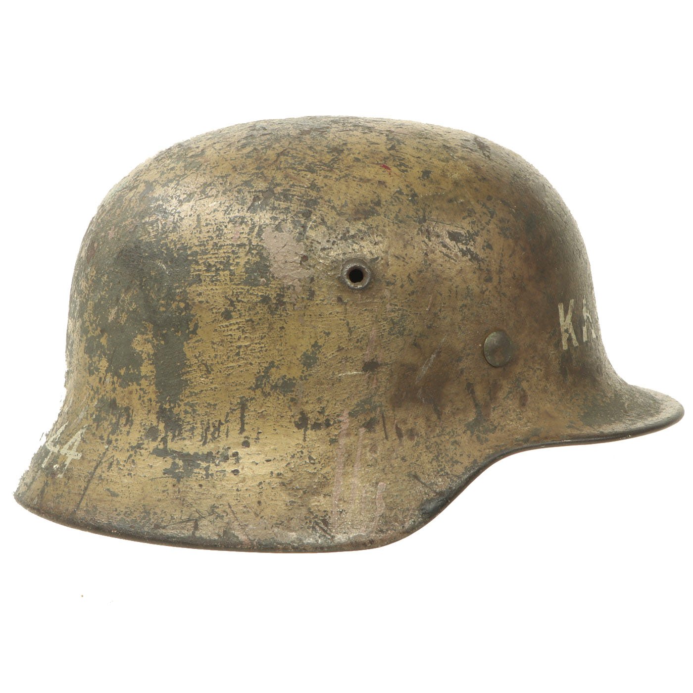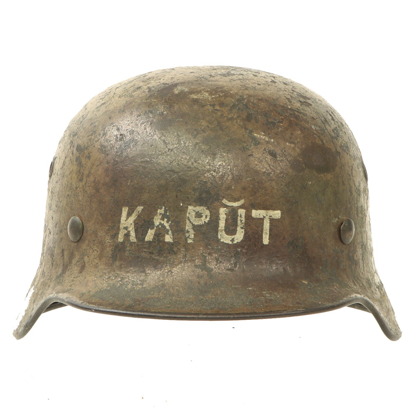 Original Item: One-of-a-kind. This is what we all look for and can never find! An incredible 100% authentic Normandy Camouflage Model 1940 German Helmet! This one was captured by a USGI, and then personalized with gray paint on the front and back. The front of the helmet was marked KAPŬT, and the rear marked SIOSSON - 44. We assume this refers to the Soissons commune in Northwestern France, which was the site of travelling and fighting during WWII as the Allies were on their way to Germany. No major battles occurred in the area, but it was definitely an area where the helmet could have been picked up in 1944. "Kaput" of course is the English word for "utterly finished, defeated, or destroyed", which was borrowed from the German Kaputt, for "broken".
