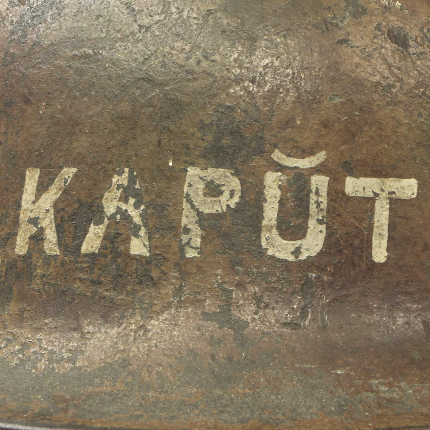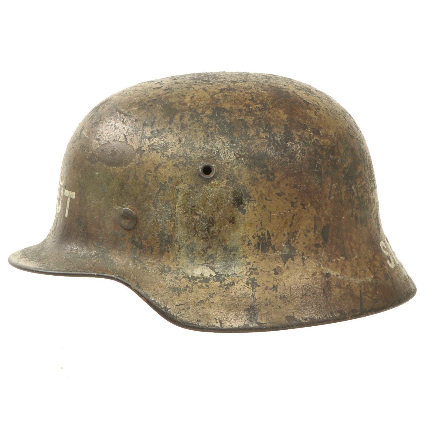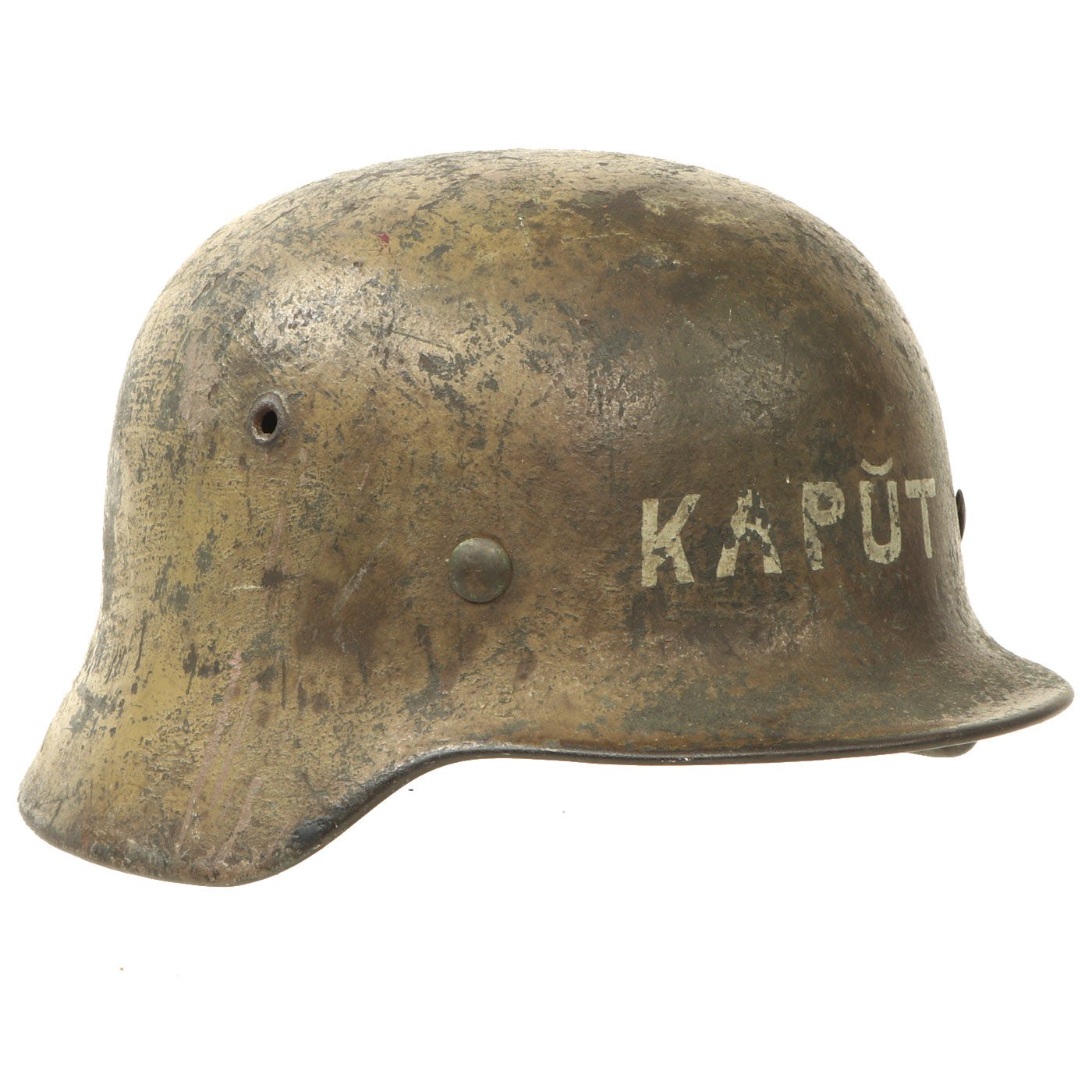 Original Item: One-of-a-kind. This is what we all look for and can never find! An incredible 100% authentic Normandy Camouflage Model 1940 German Helmet! This one was captured by a USGI, and then personalized with gray paint on the front and back. The front of the helmet was marked KAPŬT, and the rear marked SIOSSON - 44. We assume this refers to the Soissons commune in Northwestern France, which was the site of travelling and fighting during WWII as the Allies were on their way to Germany. No major battles occurred in the area, but it was definitely an area where the helmet could have been picked up in 1944. "Kaput" of course is the English word for "utterly finished, defeated, or destroyed", which was borrowed from the German Kaputt, for "broken".