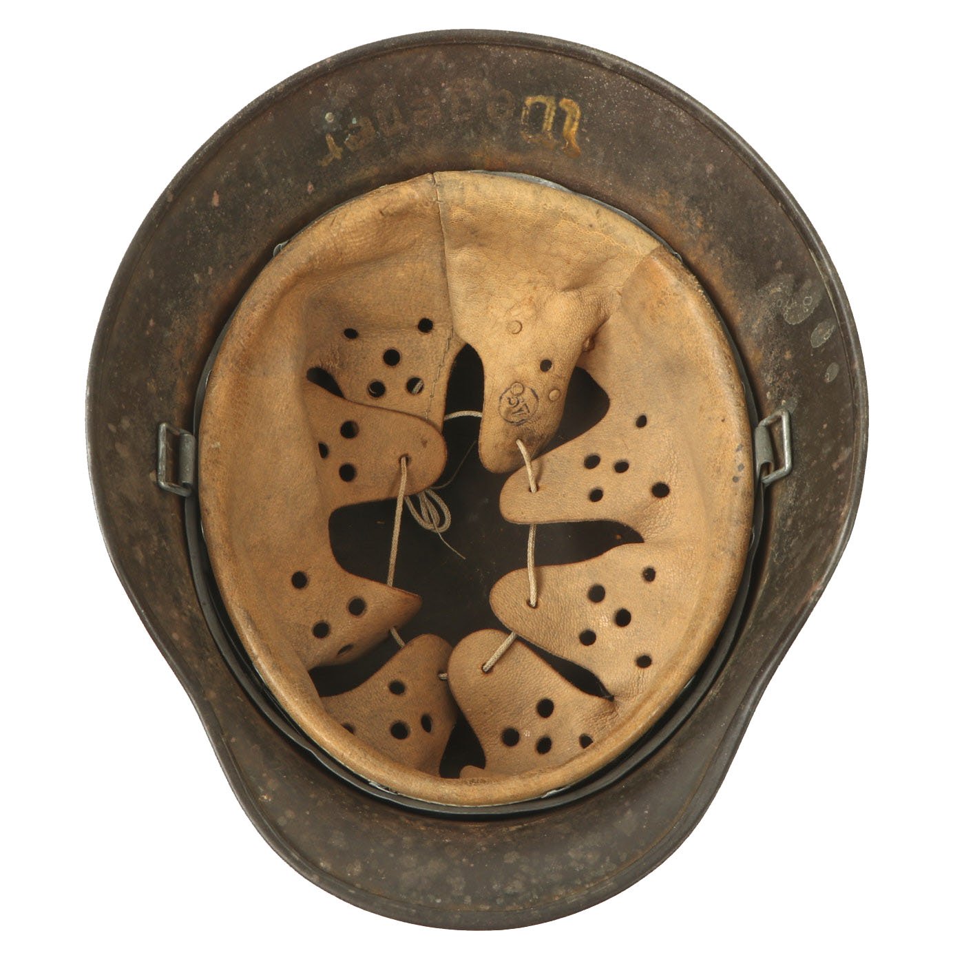 This stamped sheet steel construction helmet retains much of its original Normandy Camo paint but shows expected wear and use. It has some areas where the paint has worn off, and the original "feldgrau" paint can be seen underneath. Field repainted helmets were not stripped before the camouflage was added. The inside of the helmet still has the original paint as well, which is well retained. The back apron is marked faintly with the German last name Wegener in yellow paint, a possible research opportunity.