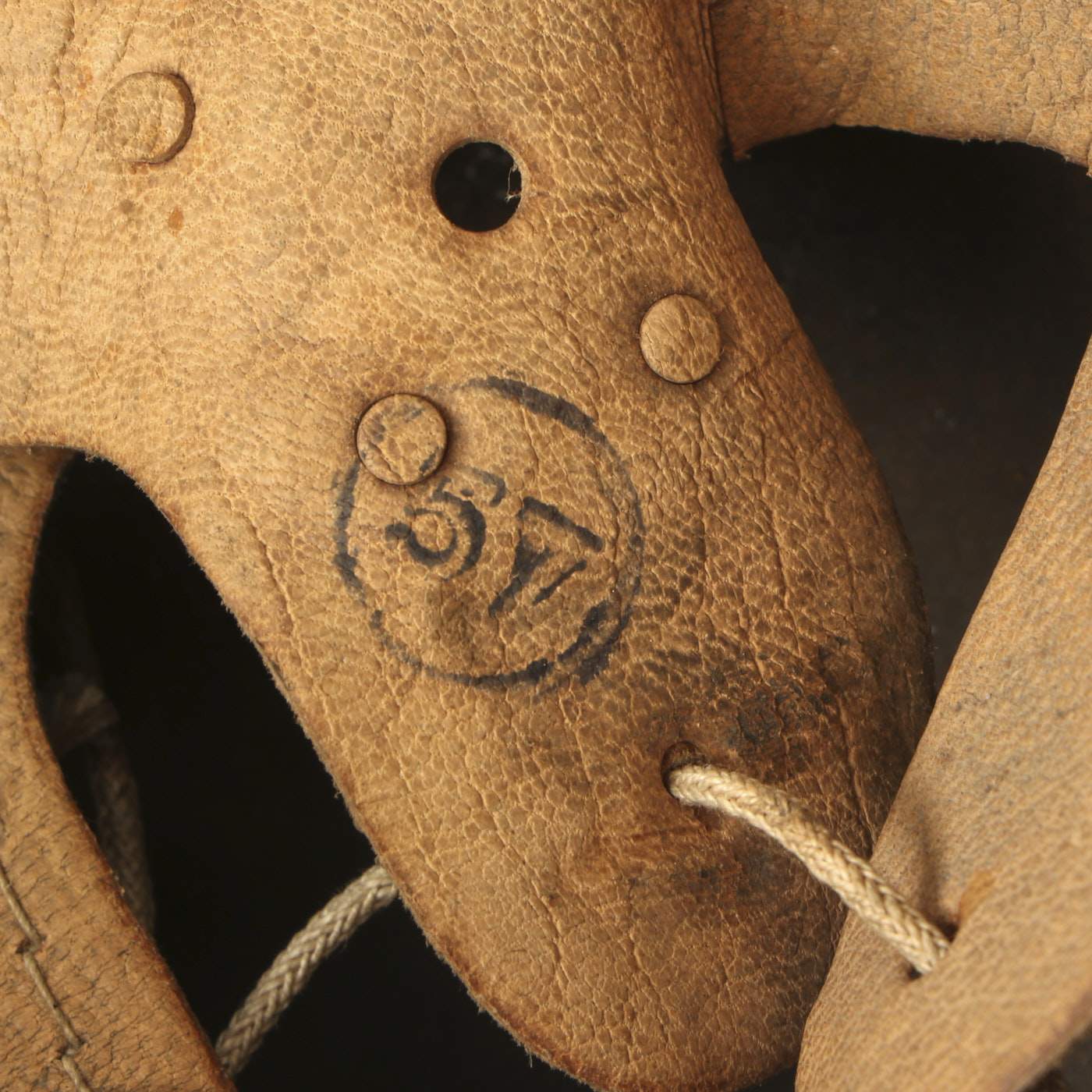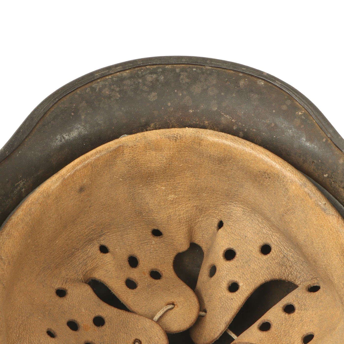 All three liner retaining pins are intact and retain some of their original paint. The interior of the helmet still has the original M31 leather liner with all eight of its fingers intact. The liner is a bit dirty in some areas but is in overall good solid condition and not stiff. The original top tie is even still present! The mid war galvanized steel liner band is marked on the left side with 64 n.A / 57, indicating a size 57cm liner for a 64cm shell. The size 57 is also ink stamped into the leather. The right side displays a German RBNr (National Business Number), as well as a date: